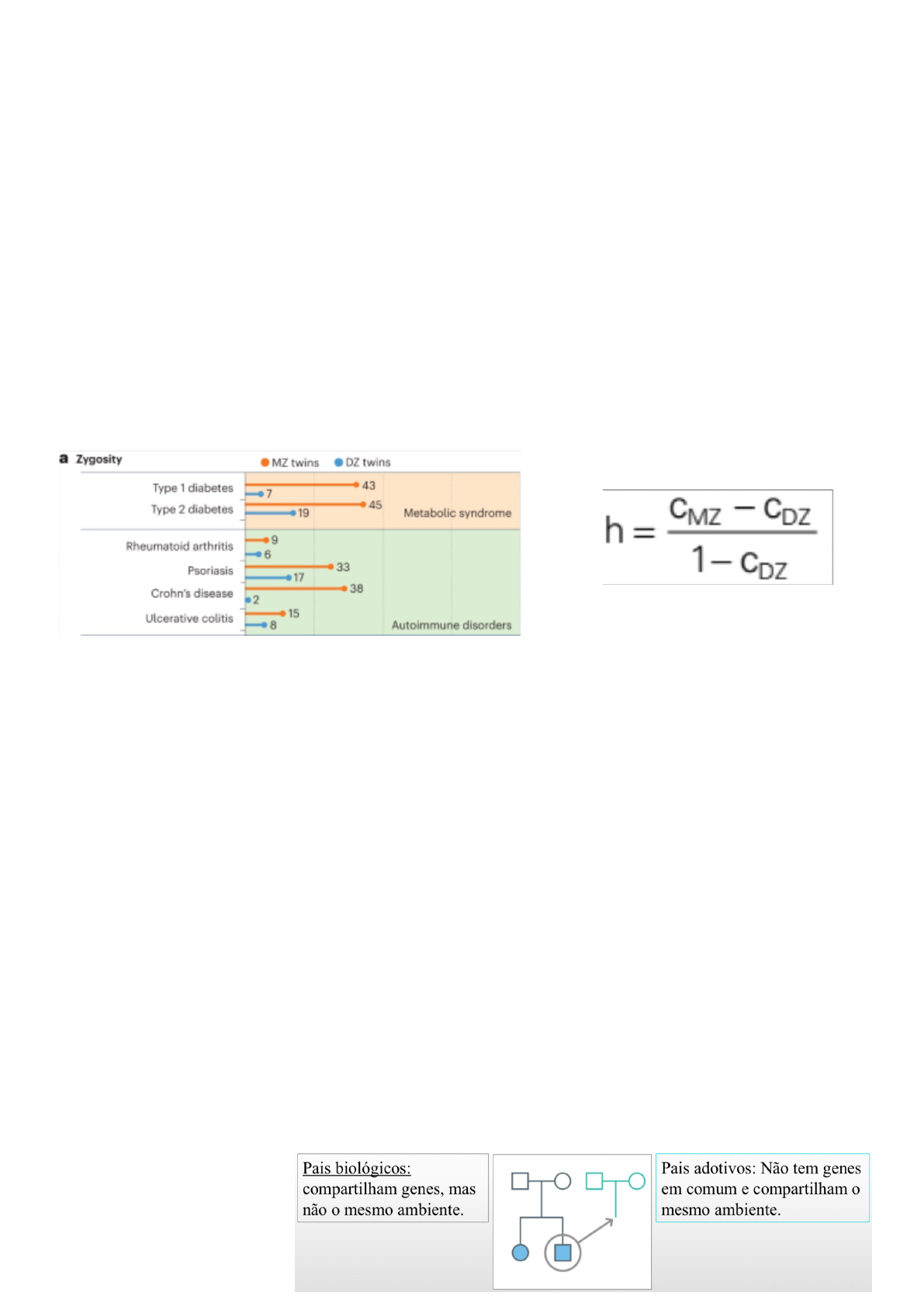 HERANÇA COMPLEXA II ● Multifatirial ● Há contribuição genética e contribuição ambiental ● Estudos para estimar se há e quanto há de contribuição genética: ● Agregação familiar: se há vários casos na família, mais frequentes do que na população geral, sugere que há fator genético ESTUDOS CLÁSSICOS ● Estudo de concordância entre gêmeos: como os gêmeos monozigóticos compartilham 100% de seus alelos, o que tiver de discordância entre eles será fator ambiental ◆ A comparação da concordância entre gêmeos MZ e DZ permite estimar o quanto da variação populacional em determinada característica pode ser atribuída à genética… ○ HERDABILIDADE: calculada a partir da diferença de concordância entre gêmeos monozigóticos e dizigóticos ◆ significa que tal porcentagem é a contribuição genética para a variabilidade dessa característica ◆ Quanto maior a diferença de concordância entre gêmeos MZ e DZ, maior a Herdabilidade ◆ A alta concordância apenas em gêmeos MZ não significa alta herdabilidade ◆ Varia de 0 a 100% - 0 a 1 ◆ Uma herdabilidade de 80% significa que 80% da variação encontrada na condição pode ser atribuída a fatores genéticos ◆ característica populacional ◇ Pode variar com: ■ A população estudada ■ A metodologia utilizada nos estudos (ex.: critério de diagnóstico de transtornos mentais) ■ Interação entre fatores genéticos e ambientais ■ Mudanças na prevalência de fatores ambientais e genéticos na população em diferentes períodos de tempo ◇ pode ser limitado por: ■ Mudanças genéticas (somáticas) e epigenéticas após a clivagem do embrião que gera os gêmeos MZ ■ Exposições ambientais de MZ e DZ não são totalmente iguais ■ Correlações gene-ambiente □ Quando uma característica do ambiente está correlacionada com a genética e não é possível destrinchar (ex.: traços de personalidade — abuso de drogas) ● ESTUDOS DE ADOÇÃO ○ utilizados menos que o estudo de gêmeos ○ Entrega uma estimativa mais robusta sobre os efeitos ambientais e genéticos ○ Procura indivíduos adotados com determinada doença OU Procura pais com determinada doença que possuem crianças adotadas ◆ viés: idade da adoção ESTUDOS MOLECULARES ● Quais são essas variantes genéticas e onde estão localizadas no genoma? ● ESTUDO DE LIGAÇÃO: A análise de ligação busca identificar regiões do genoma (marcadores) co-herdadas em famílias juntamente com a característica em estudo. ○ Ligação: Tendência de locus específicos serem herdados juntos como uma consequência da proximidade física em um único cromossomo ○ busca “marcadores” que não causam a doença, mas estão ligados ao gene da doença ○ em geral, são marcadores de genes em recepção em tandem ● ESTUDOS DE ASSOCIAÇÃO ○ Padrão ouro para tentar identificar quais os genes relacionados a doenças complexas ○ Fazem uma análise populacional de indivíduos não aparentados ○ Compara as frequências alélicas (genotípicas) entre indivíduos doentes e indivíduos sem a doença (caso controle) ○ o alelo de risco é aquele que tá mais frequente no grupo de casos do que no grupo controle ○ sempre vai ter uma medida de efeito: força da relação entre uma exposição e um desfecho (Presença do gene -> doença) em estudos de associação. ● estudo de associação por varredura genômica - GWAS ○ Genotipagem de milhares de SNPs através de microarranjos ou chips de DNA. ○ Estudo de associação por varredura genômica ○ Ao invés de avaliar uma sequência, ele faz uma varredura ○ Comparar as frequências de todos os SNPs entre os grupos para identificar associações ○ milhares de polimorfismos, sem hipótese biológica ○ Precisa de um grande tamanho amostral para ter poder estatístico ● Escores poligênicos: combina a informação de vários SNPs que saíram do GWAS, para gerar uma estimativa de risco de aplicação individual ○ PGS (poligenic scores) usam a soma dos pesos de variantes conhecidas para calcular o risco individual (escore / índice) para manifestar determinado fenótipo ○ Um índice que agrega linearmente os efeitos estimados de SNPs individuais na característica de interesse. ○ Pode ser considerado uma medida da propensão genética de um indivíduo em relação a uma característica. ○ Definido como uma soma ponderada dos genótipos de uma pessoa em 𝑲 loci. ○ Pode ser usado para estimar grupo de risco, personalizar tratamentos…