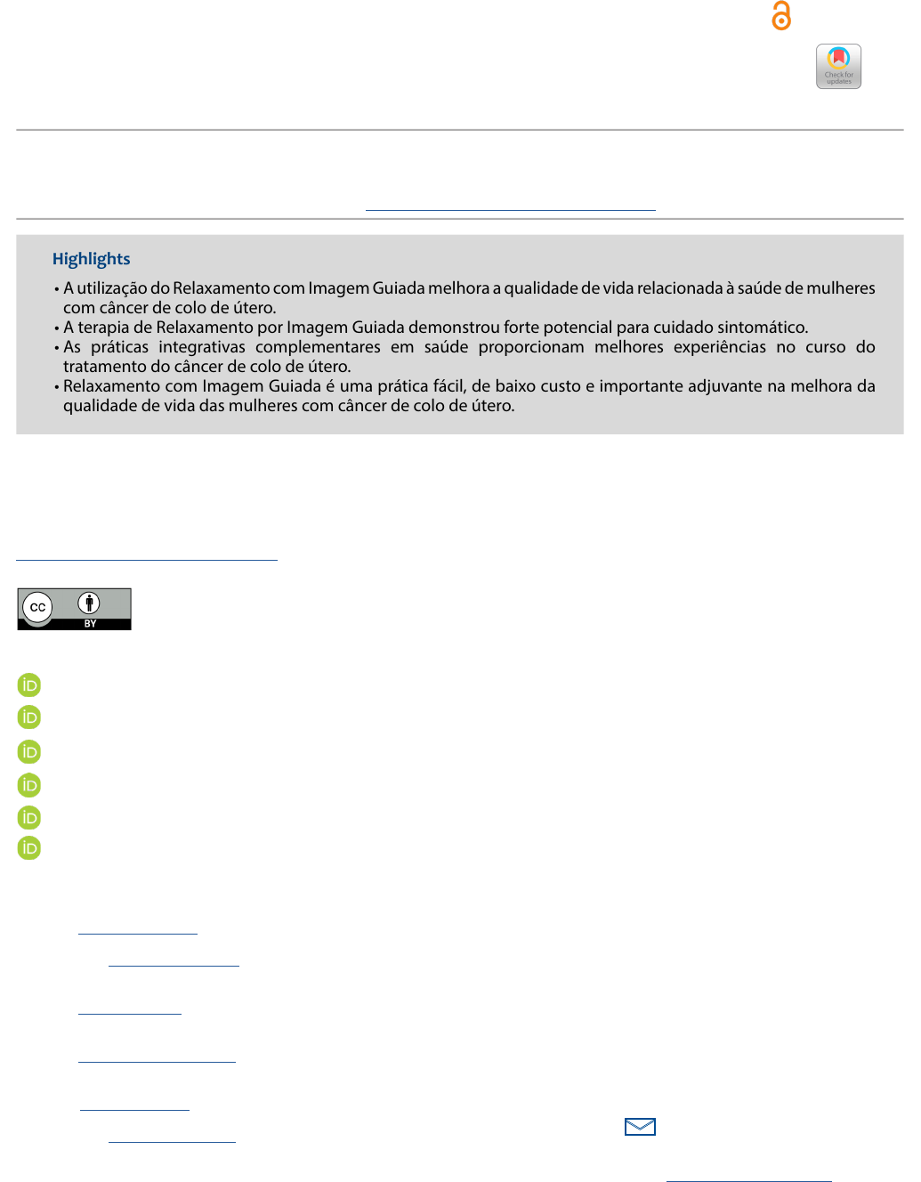 Imagem guiada para qualidade de vida de mulheres com câncer cervical: estudo quase experimental Revista Cuidarte Guided image for quality of life of women with cervical cancer: quasi-experimental study Imagen guiada para la calidad de vida de mujeres con cáncer de cuello uterino: estudio cuasi-experimental Research Article Como citar este artigo: Santana, Edenice de Oliveira; Marcondes, Larissa; Silva, Luana Aparecida Alves da; Sawada, Namie Okino; Rosa, Luciana Martins da; Kalinke, Luciana Puchalski. Imagem guiada para qualidade de vida de mulheres com câncer cervical: estudo quase experimental. Revista Cuidarte. 2023;14(1):e2358. http://dx.doi.org/10.15649/cuidarte.2358 Rev Cuid. 2023; 14(1): e2358 http://dx.doi.org/10.15649/cuidarte.2358 Edenice de Oliveira Santana1 Larissa Marcondes2 Luana Aparecida Alves da Silva3 Namie Okino Sawada4 Luciana Martins da Rosa5 Luciana Puchalski Kalinke6 1. Hospital Erasto Gaertner, Curitiba, Paraná, Brasil. Email: esanttana42@gmail.com 2. Universidade Federal do Paraná, Curitiba, Paraná, Brasil. Email: marcondes.lari@gmail.com 3. Complexo Hospital de Clínicas da Universidade Federal do Paraná, Curitiba, Paraná, Brasil. Email: aas.luana@gmail.com 4. Universidade Federal de Alfenas. Alfenas, Minas Gerais, Brasil. Email: namie.sawada@unifal-mg.edu.br 5. Universidade Federal de Santa Catarina. Florianópolis, Santa Catarina, Brasil. Email: luciana.m.rosa@ufsc.br 6. Universidade Federal do Paraná, Curitiba, Paraná, Brasil. Email: kalinkeluciana@gmail.com Highlights • A utilização do Relaxamento com Imagem Guiada melhora a qualidade de vida relacionada à saúde de mulheres com câncer de colo de útero. • A terapia de Relaxamento por Imagem Guiada demonstrou forte potencial para cuidado sintomático. • As práticas integrativas complementares em saúde proporcionam melhores experiências no curso do tratamento do câncer de colo de útero. • Relaxamento com Imagem Guiada é uma prática fácil, de baixo custo e importante adjuvante na melhora da qualidade de vida das mulheres com câncer de colo de útero. Recebido: 19 de agosto de 2021 Aceitado: 20 de outubro de 2022 Publicado: 19 de enero de 2023 *Correspondência Larissa Marcondes Email: marcondes.lari@gmail.com Resumo Introdução: As terapias mente-corpo, como o relaxamento com imagem guiada, que estão entre as principais práticas integrativas utilizadas por pacientes oncológicos, são essenciais para manter equilíbrio saudável entre a excitação simpática e parassimpática no cérebro. Objetivo: Avaliar o efeito do relaxamento por imagem guiada, com o uso da realidade virtual, na qualidade de vida relacionada à saúde de mulheres com câncer de colo uterino em tratamento concomitante com quimiorradioterapia. Materiais e Método: Estudo quase experimental, realizado em um hospital de referência em oncologia no Sul do Brasil, de outubro de 2019 a janeiro de 2021. Participaram 52 mulheres, divididas em dois grupos, experimental (intervenção relaxamento por imagem guiada com realidade virtual), e controle (rotina padrão). Utilizou-se para avaliação dos escores da qualidade de vida relacionada à saúde o instrumento Functional Assessmentof Cancer Therapy Cervix Cancer, aplicado antes, 14 dias após e, ao término do tratamento, em aproximadamente 35 dias. As análises foram realizadas pelo modelo linear generalizado misto, com a matriz de covariância autorregressiva de ordem 1, e a significância foi confirmada pelo teste de Sidak. Resultados: Houve diferença estatisticamente significativa para o grupo experimental nos domínios físico (p=0,02), funcional (p=0,00), sintomas específicos do câncer de colo de útero e efeitos do tratamento (p=0,03) e qualidade de vida global (p=0,02). Conclusão: O relaxamento por Imagem Guiada contribuiu na melhora na Qualidade de Vida Relacionada à Saúde das pacientes com câncer de colo do útero, durante o tratamento com quimiorradiação. Palavras-Chave: Qualidade de Vida; Neoplasias do Colo de Útero; Imaginação; Terapia de Relaxamento; Terapia de Exposição à Realidade Virtual; Terapias Complementares. Open access E-ISSN: 2346-3414 http://dx.doi.org/10.15649/cuidarte.2358 http://dx.doi.org/10.15649/cuidarte.2358 http://dx.doi.org/10.15649/cuidarte.2538 mailto:esanttana42%40gmail.com?subject= mailto:marcondes.lari%40gmail.com?subject= mailto:aas.luana%40gmail.com?subject= mailto:namie.sawada%40unifal-mg.edu.br?subject= mailto:luciana.m.rosa%40ufsc.br?subject= mailto:kalinkeluciana%40gmail.com?subject= mailto:etorres%40uniquindio.edu.co%20?subject= mailto:marcondes.lari%40gmail.com?subject= mailto:annefayma%40unilab.edu.br%20%20?subject= http://www.accesoabierto.net http://crossmark.crossref.org/dialog/?doi=10.15649/cuidarte.2358&domain=pdf&date_stamp=2023-01-20 https://creativecommons.org/licenses/by/4.0/ https://orcid.org/0000-0001-8453-455X https://orcid.org/0000-0003-0210-2791 https://orcid.org/0000-0002-1884-5330 https://orcid.org/0000-0003-4868-8193 https://orcid.org/0000-0002-8745-6486 https://orcid.org/0000-0002-1874-3481 2 https://dx.doi.org/10.15649/cuidarte.2358 Revista Cuidarte Enero-Abril 2023; 14(1): e2358 Abstract Resumen Introduction: Mind-body therapies, such as guided imagery relaxation, which are among the main integrative practices used by cancer patients, are essential for maintaining a healthy balance between sympathetic and parasympathetic arousal in the brain. Objective: To evaluate the effect of guided image relaxation, with the use of virtual reality, on the health-related quality of life of women with cervical cancer undergoing concomitant treatment with chemoradiotherapy. Materials and Method: A quasi-experimental study, carried out in an oncology referral hospital in southern Brazil, from October 2019 to January 2021. 52 women participated, divided into two groups, experimental (relaxation intervention guided by imagery with virtual reality), and control (default routine). The Functional instrum
