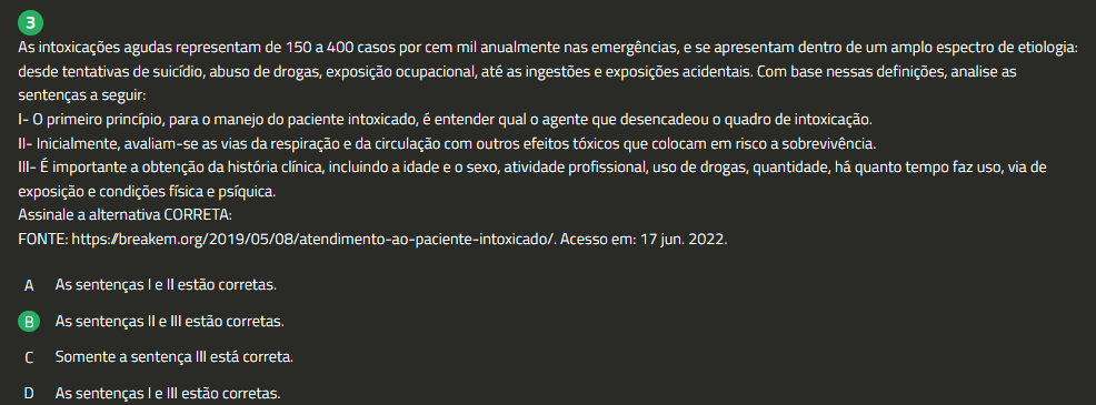 3 As intoxicações agudas representam de 150 a 400 casos por cem mil anualmente nas emergências, e se apresentam dentro de um amplo espectro de etiologia: desde tentativas de suicídio, abuso de drogas, exposição ocupacional, até as ingestões e exposições acidentais. Com base nessas definições, analise as sentenças a seguir: primeiro princípio, para 0 manejo do paciente intoxicado, é entender qual 0 agente que desencadeou 0 quadro de intoxicação. II- Inicialmente, avaliam-se as vias da respiração e da circulação com outros efeitos tóxicos que colocam em risco a sobrevivência. III- É importante a obtenção da história clínica, incluindo a idade e 0 sexo, atividade profissional, de drogas, quantidade, há quanto tempo faz uso, via de exposição e condições física e psíquica. Assinale a alternativa CORRETA: FONTE: https:/breakem.org/2019/05/08/atendimento-ao-paciente-intoxicado/.Acesso em: 17 jun. 2022. A As sentenças le II estão corretas. As sentenças II e III estão corretas. C Somente a sentença III está correta. D As sentenças III estão corretas.