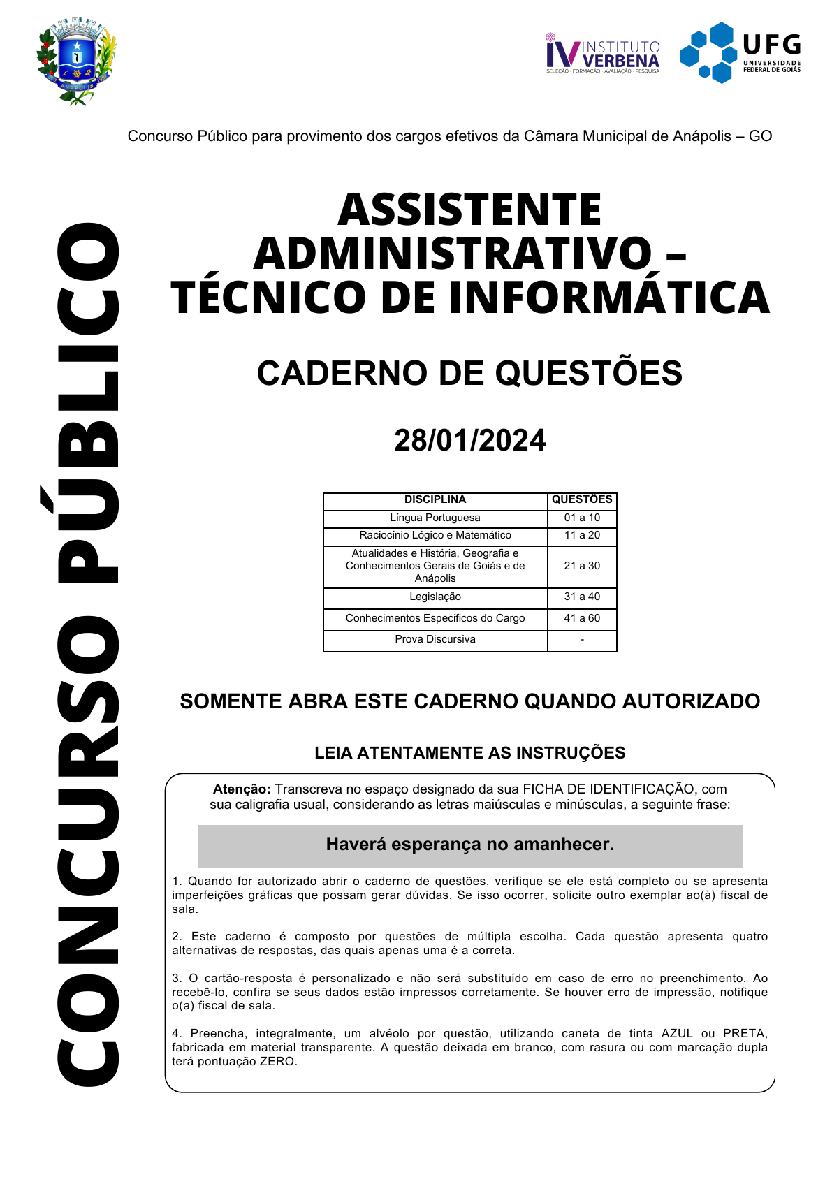 pcimarkpci MjgwNDowMTRjOmRhYTc6ODMzZjo1ODA0OmY5Mzg6MGEwODo0NzEy:U3VuLCAyMiBKdW4gMjAyNSAxODowODozNyAtMDMwMA== www.pciconcursos.com.br DISCIPLINA QUESTÕES Língua Portuguesa 01 a 10 Raciocínio Lógico e Matemático 11 a 20 Atualidades e História, Geografia e Conhecimentos Gerais de Goiás e de Anápolis 21 a 30 Legislação 31 a 40 Conhecimentos Específicos do Cargo 41 a 60 Prova Discursiva - 1. Quando for autorizado abrir o caderno de questões, verifique se ele está completo ou se apresenta imperfeições gráficas que possam gerar dúvidas. Se isso ocorrer, solicite outro exemplar ao(à) fiscal de sala. 2. Este caderno é composto por questões de múltipla escolha. Cada questão apresenta quatro alternativas de respostas, das quais apenas uma é a correta. 3. O cartão-resposta é personalizado e não será substituído em caso de erro no preenchimento. Ao recebê-lo, confira se seus dados estão impressos corretamente. Se houver erro de impressão, notifique o(a) fiscal de sala. 4. Preencha, integralmente, um alvéolo por questão, utilizando caneta de tinta AZUL ou PRETA, fabricada em material transparente. A questão deixada em branco, com rasura ou com marcação dupla terá pontuação ZERO. ASSISTENTE ADMINISTRATIVO – TÉCNICO DE INFORMÁTICA Atenção: Transcreva no espaço designado da sua FICHA DE IDENTIFICAÇÃO, com sua caligrafia usual, considerando as letras maiúsculas e minúsculas, a seguinte frase: Haverá esperança no amanhecer. CO N CU RS O P Ú BL IC O 28/01/2024 CADERNO DE QUESTÕES SOMENTE ABRA ESTE CADERNO QUANDO AUTORIZADO LEIA ATENTAMENTE AS INSTRUÇÕES Concurso Público para provimento dos cargos efetivos da Câmara Municipal de Anápolis – GO pcimarkpci MjgwNDowMTRjOmRhYTc6ODMzZjo1ODA0OmY5Mzg6MGEwODo0NzEy:U3VuLCAyMiBKdW4gMjAyNSAxODowODozNyAtMDMwMA== www.pciconcursos.com.br CÂMARA DE ANÁPOLIS-GO/2024 CONCURSO PÚBLICO IV/UFG Língua Portuguesa_Médio/Técnico QUESTÃO 01 Leia a charge a seguir. Disponível em: . Acesso em: 24 nov. 2023. O gênero textual charge é marcado pelo caráter humorístico e crítico. Na charge acima, a crítica é construída com base na polissemia de um (A) pronome interrogativo. (B) substantivo. (C) adjetivo. (D) advérbio. Leia o Texto 1 para responder às questões 02 e 03. Texto 1 Quem procura a essência de um conto no espaço que fica entre a obra e seu autor comete um erro: é muito melhor procurar não no terreno que fica entre o escritor e sua obra, mas justamente no terreno que fica entre o texto e seu leitor. OZ, Amós. De amor e trevas. São Paulo: Cia. das Letras, 2005. QUESTÃO 02 Ao tratar sobre a identificação da “essência de um conto”, o texto refere-se à atividade de leitura. Com base no que Oz (2005) expõe no texto, infere-se que o sentido de um conto (A) é construído na interação entre leitor e obra. (B) é determinado e configurado pelo autor. (C) é resultado apenas da atividade subjetiva do leitor. (D) é definido apenas pelas condições objetivas da obra. QUESTÃO 03 Na oração “Quem procura a essência de um conto no espaço”, o sujeito da forma verbal destacado classifica-se como (A) desinencial. (B) indeterminado. (C) inexistente. (D) simples. Leia o Texto 2 para responder às questões de 04 a 06. Texto 2 A lógica do humor Piada racista termina com polícia em casa de shows. É engraçado gozar de minorias? Até onde se pode chegar para fazer os outros rirem? Aliás, do que rimos? De um modo geral, achamos graça quando percebemos um choque entre dois códigos de regras ou de contextos, todos consistentes, mas incompatíveis entre si. Um exemplo: “O masoquista é a pessoa que gosta de um banho frio pelas manhãs e, por isso, toma uma ducha quente”. Cometo agora a heresia de explicar a piada. Aqui, o fato de o sujeito da anedota ser um masoquista subverte a lógica normal: ele faz o contrário do que gosta, porque gosta de sofrer. É claro que a lógica normal não coexiste com seu reverso, daí a graça da pilhéria. Uma variante no mesmo padrão é: “O sádico é a pessoa que é gentil com o masoquista”. Essa “gramática” dá conta da estrutura intelectual das piadas, mas há também dinâmicas emocionais. Kant, na Crítica do juízo, diz que o riso é o resultado da “súbita transformação de uma expectativa tensa em nada”. Rimos porque nos sentimos aliviados. Torna-se plausível rir de desgraças alheias. Em alemão, há até uma palavra para isso: “schadenfreude”, que é o sentimento de alegria provocado pelo sofrimento de terceiros. Não necessariamente estamos felizes pelo infortúnio do outro, mas sentimo-nos aliviados com o fato de não sermos nós a vítima. Mais ou menos na mesma linha vai o filósofo francês Henri Bergson. Em “O riso”, ele observa que muitas piadas exigem “uma anestesia momentânea do coração”. Ou seja, pelo menos as partes mais primitivas de nosso eu acham graça em troçar dos outros. Daí os inevitáveis choques entre humor e adequação social. Como não podemos dispensar o riso nem o combate à discriminação, o conflito é inevitável. Resta torcer para que seja autolimitado. Não deixaremos de rir de piadas racistas, mas não podemos esquecer que elas colocam um problema moral. Disponível em: . Acesso em: 30 nov. 2023. QUESTÃO 04 De acordo com a estrutura composicional, com os objetivos comunicativos e com sua função social, o texto acima concretiza o gênero textual (A) artigo científico. (B) artigo de opinião. (C) manifesto. (D) resenha. pcimarkpci MjgwNDowMTRjOmRhYTc6ODMzZjo1ODA0OmY5Mzg6MGEwODo0NzEy:U3VuLCAyMiBKdW4gMjAyNSAxODowODozNyAtMDMwMA== www.pciconcursos.com.br CÂMARA DE ANÁPOLIS-GO/2024 CONCURSO PÚBLICO IV/UFG Língua Portuguesa_Médio/Técnico QUESTÃO 05 No quarto e no quinto parágrafo, com o objetivo de convencer o interlocutor da validade de suas proposições, o locutor do texto utiliza argumentos de (A) autoridade. (B) base histórica. (C) comparação. (D) exemplificação. QUEST
