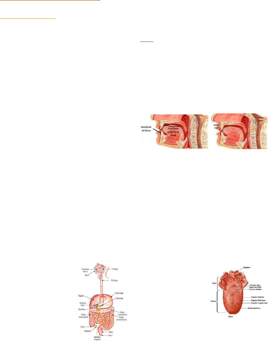 Anatomia teórica- 3 Sistema digestório e Sistema respiratório Sistema digestório Funções do sistema digestório Ingestão: introdução de alimentos e líquidos na boca Secreção: sucos digestivos ricos em enzimas secretados pelos órgãos Peristaltismo: as contrações musculares na parede do trato gastrintestinal decompõem mecanicamente o alimento, misturando-o e empurrando-o ao longo do trato digestório do esôfago até o ânus Digestão: mecânica (dentes e peristaltismo) e química (enzimas digestivas) Absorção: os produtos da digestão são absorvidos para o sangue e circulam para as células por todo o corpo Defecação: resíduos, materiais digeridos que não foram absorvidos, deixam o corpo pelo ânus através das fezes O sistema digestório é dividido em CANAL ALIMENTAR- Boca- Faringe- Esôfago- Estômago- Intestino delgado- Intestino grosso ÓRGÃOS ANEXOS- Glândulas salivares- Fígado- Pâncreas Boca - Divide-se em vestíbulo da boca e cavidade própria da boca - Vestíbulo limitado pelos lábios, bochechas, gengivas e dentes e o restante constitui a cavidade própria da boca Teto: - Palato duro e mole que separa a cavidade nasal da cavidade da boca Palato duro: ósseo Palato mole: muscular - Úvula palatina: Lateralmente - fossa tonsilar é ocupada pela tonsila palatina (“amígdala”) Dentes - Estruturas rijas, esbranquiçadas - Implantados nos alvéolos dentais da maxila e da mandíbula - Função: trituração do alimento Cada dente tem 3 partes: - Raiz (implantada no alvéolo) - Coroa (parte livre) - Colo (circundado pela gengiva) - Adulto – 32 dentes: 8 incisivos, 4 caninos 8 pré-molares, 12 molares Língua - Órgão muscular - Funções: mastigação, deglutição, órgão gustativo, fala (articulação das palavras) - Apresenta: raiz, corpo, ápice Glândulas salivares - A saliva é responsável pelo umedecimento, dissolução e lubrificação do alimento e pelo início da digestão por ação de enzimas (amilase) Função da saliva liberada na cavidade bucal: - Manter as mucosas da boca e faringe úmidas - Limpar a boca e os dentes - Lubrificar e dissolver o alimento - Decomposição química do alimento - Estímulos ? Fauces - Indica estreita passagem (transição) entre a cavidade da boca e a faringe Faringe - Tubo de passagem para alimentos sólidos, líquidos e ar - Apresenta 3 partes - Na deglutição, o palato mole é elevado, bloqueando a continuidade entre a parte nasal e o restante do tubo muscular. Assim, o alimento é impedido de passar à parte nasal da faringe Esôfago - Tubo muscular (aprox. 25 cm de comp.) com um diâmetro médio de 2 cm, que conduz alimento da faringe para o estômago - Possui 3 partes: cervical, torácica e abdominal Estômago - Órgão visceral, oco, localizado entre o esôfago e o intestino delgado - Está logo abaixo do diafragma, com sua maior porção a esquerda do plano mediano - Transforma o bolo alimentar em quimo e inicia a digestão das proteínas através da produção de suco gástrico - Em 2 a 4 horas após ingerir uma refeição, o estômago esvazia seu conteúdo no duodeno - Cárdia: junção com esôfago - Fundo gástrico - Corpo gástrico – maior parte do órgão - Parte pilórica – porção terminal Túnica mucosa: Pregas gástricas (Elevações que aumentam o contato do bolo alimentar permitindo ação eficaz do suco gástrico) Intestino Delgado - Composto pelo: Duodeno, Jejuno, Íleo - Função: completar a digestão e a absorção nutrientes - A digestão é completada pelo sulco entérico ou suco intestinal que contém enzimas Duodeno - É a parte inicial do intestino delgado com aproximadamente 25 cm de comprimento - Estende-se desde o óstio pilórico até a flexura duodenojejunal (marca o início do jejuno) Apresenta 4 partes: - Superior - Descendente - Horizontal - Ascendente Jejuno-Íleo - Começa no nível da flexura duodenojejunal e termina no nível da fossa ilíaca direita, íleo terminal Funções do intestino delgado - O quimo que entra no intestino delgado contém carboidratos, proteínas e lipídios parcialmente digeridos - A conclusão da digestão de carboidratos, proteínas e lipídios é o resultado da ação coletiva do suco pancreático, da bile e do suco intestinal do intestino delgado - Absorção Intestino grosso - Porção terminal do canal alimentar - Mais calibroso e curto Subdividido em: - Ceco - Colo ascendente - Colo transverso - Colo descendente - Colo sigmóide - Reto - Pregas transversais – alternadas – obrigam as fezes a ter um trajeto em espiral no momento da expulsão (facilita a defecação) Fígado - Localiza-se abaixo do diafragma, no quadrante superior direito, pequena porção ocupa o quadrante superior esquerdo - Funções: Interfere no metabolismo dos carboidratos, gorduras e proteínas - Secreta bile Duas faces: - Diafragmática - Visceral: 4 lobos – Direito, esquerdo, caudado, quadrado - Face diafragmática - ligamento falciforme separa os lobos direito e esquerdo - Vesícula biliar – entre lobo direito e quadrado Vesícula biliar - Ducto colédoco: ampola hepatopancreática (Controlar o fluxo da bile e das secreções pancreáticas) Pâncreas Glândula: Endócrina secreção insulina: ilhotas pancreáticas Exócrina secreção suco pancreático: rico em enzimas para digestão (amilase pancreática, tripsina, lipase pancreática) - Localiza-se posteriormente ao estômago - Apresenta: Cabeça, Corpo, Cauda - Suco pancreático é recolhido por ductos (Ductos pancreático) Peritônio parietal e visceral - O peritônio é a maior túnica serosa do corpo. - Dividido em peritônio parietal, que reveste a parede da cavidade abdominal, e em peritônio visceral, recobre alguns dos órgãos na cavidade Peritônio - Apresenta grandes pregas cheias de gordura Existem seis pregas peritoneais principais: - Omento maior - Ligamento falciforme - Omento menor - Mesentério - Mesocolo transverso - Mesocolo sigmoide Omento maior: prega peritoneal mais longa, 
