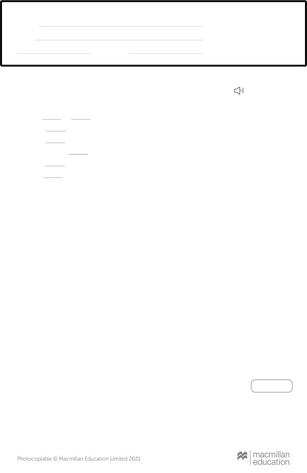test 3 Student name Group/Class Date Score LISTENING GRAMMAR Listen to f ive people talking about what kind of movies they like. Match each of the speakers (1–5) to the genre(s) they mention. T here is an extra option you do not need. An example (a) has been done f or you. Audio script Speaker 1: Well, all my friends like watching stuff that scares them. We scared ourselves a lot as teenagers. I used to enjoy them but it was stressful. Now I’m interested in funny love stories, boy meets girl type of thing. I go with my sister and my mom. My sister laughs at me for liking them but I don’t mind. I know that if I go to the movie theater to watch one I’ll be happy when I come out and not afraid to go to sleep! Speaker 2: At my college I’m a member of the movie club. It’s great because I get to see a lot of great movies from all over the world that aren’t on at the movie theater. Right now we’re watching a lot of Bollywood movies from India. I find them engaging and fun. Some of the songs are so good I’m going to try to find the lyrics. I don’t think my Hindi will be good enough though. Speaker 3: When I was a kid I used to go to the movie theater with my grandpa. It was a treat for me. My brothers weren’t interested so it was something we did together. I loved all the cowboys and Indians and horses and things. He died a few years ago but there’s something about that movie genre that makes me remember my grandpa. T hat’s why they’re my favorite I think. Speaker 4: I love something gripping. You know that situation when you don’t want to look at the screen but you have to. I can’t help it. And some of the costumes are amazing. It must take them a long time to get ready in makeup. My husband thinks I’m really silly because I get so jumpy and scare myself for days afterward but if they were easy to watch I’d be disappointed. Speaker 5: T here are so many bad things happening in the world these days that I want to escape from it all when I watch a movie. I made a mistake of watching an autobiography once. It wasn’t cheerful enough. It was very moving and there were some enjoyable parts but this man’s life was so tragic. Anyway, I always watch something that’s going to make me laugh these days. Score: / 5 1 Skills T est 7-9 Audio 1 Horrors and A 1 4 Comedies B 5 Westerns C 3 Romantic comedies D 1 Fantasies E none Musicals F 2 Rewrite the sentences using a f orm of used to so they have the same meaning as the sentence given. An example (0) has been done f or you. Score: / 5 2 She couldn’t speak English well but she can now.0 She didn’t use t o be able t o speak English well but she can now. Could you sing well when you were younger?1 Did you use t o be able t o sing well when you were younger? I didn’t like grapes when I was a child but now I do.2 I didn't use t o like grapes when I was a chi ld, but now I do. Where did you go on vacation when you lived in New York?3 Where did you use t o go on vacat ion when you lived in New York? He swam a lot when he was in school.4 He used t o swim a lot when he was in school. We had a lot more friends than we do now.5 We used t o have a lot more fr iends t han we do now. Complete each sentence with a, the or —. An example (0) has been done f or you. Score: / 5 3 I have never been to United States.0 t he How often do you go to movie theater?1 t he We usually have breakfast at 9 am on the weekend.2 — She has new car.3 a I saw my relatives on T hursday night.4 — I have friend named Jake.5 a Complete the sentences with a ref lexive pronoun. An example (0) has been done f or you. Score: / 5 4 T he dog washed in the ocean.0 it self He reminded to post the letter.1 himself Rosa cleaned the house .2 herself We help each .3 ot her T he children learned to make their dinner .4 t hemselves Did you know you were talking to ?5 yourself Complete the sentences with one word. An example (0) has been done f or you.5 We see the game if we arrive late.0 won’t If he has some time, then he come and help you.1 will we don’t go on vacation, we will come to your wedding.2 If Score: / 5 What will you do it rains?3 i f She will be here at 6 o’clock if the bus on time.4 is I go to the movie theater if it’s closed.5 won't Select the correct word(s) in italics in each sentence. An example (0) has been done f or you. Score: / 10 6 We’ll a question if it’s not clear.0 asking ask/ We opened the window let the fresh air in.1 for to/ I be able to help you if my brother takes my car.2 won’t wouldn’t/ If you to him, he will notice.3 lie lied/ T hey leave early if it is uninteresting.4 will would/ You won’t understand if I in my native language.5 speak speaking/ He’ll late if the traffic is bad.6 is be/ I’ve cut with a knife.7 myself me/ T hey looked at each quickly.8 other themselves/ I’m speaking to my boss to for a pay rise.9 asking ask/ She spent a minute looking herself in the mirror.10 at for/ Complete the sentences using the words in the box. An example (0) has been done f or you. Score: / 5 7 that (x2) when where who whose He is the guy father won an Olympic medal.0 whose John is the man has the big black car.1 t hat I remember the day my nephew was born.2 when T he neighbor lives at number 27 is from Mexico.3 who T hat store is I bought my socks from.4 where T he present he gave me is in the kitchen.5 t hat Put the words into the correct order to f orm sentences. An example (0) has been done f or you.8 vacation / they / thinking / going / on / about / were / .0 They were t hinking about going on vacat ion. he’s / seeing / looking / forward / to / Erik / .1 He's looking forward t o seeing Er ik. VOCABULARY Score: / 5 is / a / pan / easier / cooking / proper / rice / in / .2 Cooking r ice is easier in a proper pan. I’m / long / at / distances / good / running / .3 I'm good at running long dist ances. business / dreams / he / his / of / own / having / .4 He dreams of having his own business. family / for / hav