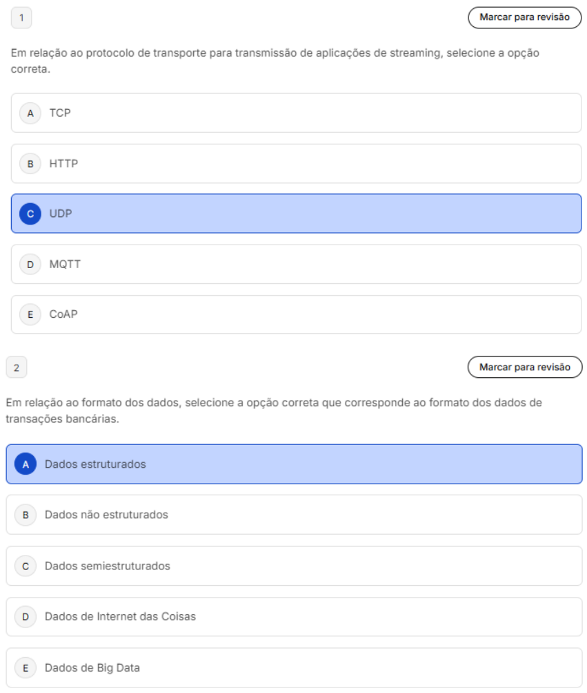 1 Marcar para revisão Em relação ao protocolo de transporte para transmissão de aplicações de streaming, selecione a opção correta. A TCP B HTTP UDP D MQTT E CoAP 2 Marcar para revisão Em relação ao formato dos dados, selecione a opção correta que corresponde ao formato dos dados de transações bancárias. A Dados estruturados B Dados não estruturados C Dados semiestruturados D Dados de Internet das Coisas E Dados de Big Data3 Marcar para revisão (NC-UFPR/2019 Adaptada) Sobre a loT (Internet das coisas) e seus blocos básicos de construção, identifique como verdadeiras (V) ou falsas (F) as seguintes afirmativas: () Na loT, objetos podem prover comunicação entre usuários e dispositivos, viabilizando diversas aplicações, tais como coleta de dados de pacientes e monitoramento de idosos e sensoriamento de ambientes de difícil acesso. () A tecnologia de loT consiste na coexistência colaborativa de dois componentes: As "coisas" e protocolos de rede que permitem a sua comunicação. () Protocolos de comunicação: Viabilizam a troca de dados via Internet entre objetos físicos e outros sistemas. Assinale a alternativa que apresenta a sequência correta, de cima para baixo. A VFV FVF C VVF D FFF E FVV 4 Marcar para revisão Selecione a opção correta que contém a principal plataforma de tecnologia de nuvem que é usada como referência para as outras plataformas. A Microsoft Azure Amazon AWS C Oracle Cloud D IBM Cloud E Google Cloud5 Marcar para revisão Selecione a opção em que a computação se refere à execução de aplicações e serviços em uma rede distribuída usando recursos virtualizados. A Computação centralizada B Computação Paralela C Computação de banco de dados D Computação de Big Data E Computação em Nuvem 6 Marcar para revisão Em relação ao Data Lake, selecione a opção correta que contenha o(s) formato(s) de dados que pode(m) ser armazenado(s) nele. A Apenas estruturado Estruturado e semiestruturado Estruturado, não estruturado e semiestruturado D Apenas não estruturado E Apenas tabelas relacionais7 Marcar para revisão A respeito do HDFS, selecione a opção correta cujo componente lógico mantém dados do usuário na forma de blocos de dados. A YARN NameNode C Bloco de dados D Replicação E DataNode 8 Marcar para revisão Reconhecer os conceitos de Data Lake é fundamental para 0 profissional de Tecnologia da Informação. Selecione a opção correta a respeito do Data Lake. A Possui alta latência para acesso dos dados. Aplica processos de tratamento nos dados. Armazena dados de modo eficiente. D Demanda por equipamentos especiais. E São exclusivos da distribuição Hadoop Apache.9 Marcar para revisão Hadoop é um framework de código aberto voltado para aplicações de Big Data. Neste sentido, selecione a alternativa correta que apresenta um grande desafio no processo de configuração e gerenciamento do Hadoop. A Processos de extração, transformação e carregamento dos dados. Mecanismo para melhorar 0 processamento dos dados. Aplicar políticas de segurança. D Gerenciamento do armazenamento de dados. E Tratar dados não-estruturados. 10 Marcar para revisão Reconhecer conceitos de Data Lake é fundamental para 0 profissional de Tecnologia da Informação. Selecione a opção correta que define resumidamente 0 que é Data Lake. A É um repositório para tratamento dos dados. É uma tecnologia de armazenamento e processamento de dados. É um repositório centralizado para armazenamento de dados. D É um ambiente para tratamento e armazenamento apenas de dados relacionais. Trata-se de um componente do HDFS responsável pela implementação do mecanismo MapReduce E para fazer gerenciamento dos dados.1 Marcar para revisão Selecione a opção correta que contenha a operação responsável por retornar um subconjunto aleatório dos dados de entrada. A sample filter C random D mapRandom E distinct 2 Desmarcar para revisão Observe trecho de código abaixo import numpy as np from pyspark import SparkContext spark_contexto = SparkContext() a = np.array([1, 5, 1, 6, 4, 7, 7]) teste = spark_contexto.parallelize(a) Selecione a opção correta a respeito dele. A A utilização do SparkContext é opcional. A linha aplica a técnica MapReduce para processar 0 vetor "a". A variável "teste" corresponde a um RDD. D A execução do trecho de código vai gerar um erro. E objetivo do trecho de código é contar a quantidade de ocorrências dos valores do vetor "a".3 Marcar para revisão Atualmente, 0 Apache Spark é mais bem-sucedido framework para Big Data. Selecione a opção correta que contenha apenas funções que podem ser categorizadas como transformações no Spark. A count, collect e take. map, sample e collect. map, filter e union. D reduce, first e map. E map, take e reduce. 4 Marcar para revisão PySpark caracteriza-se como uma biblioteca Spark responsável por executar programas usando recursos do Apache Spark. Selecione a opção correta que contenha itens que são pré-requisitos de instalação para utilização do PySpark. A Hadoop e Spark Casandra e Spark Java e Python D Python e Escala E Java e R5 Marcar para revisão Gabriel entrou recentemente em uma empresa de gestão de fundos de investimento. No seu primeiro dia de trabalho, lhe é conferida a tarefa de buscar relatórios do pessoal da contabilidade para fazer suas análises exploratórias. departamento de contabilidade extrai dados de seus relatórios de um SAP que retorna valores brutos de compras, quantidades de produtos etc. Então contadores organizam, por agregação, informação relevante no relatório em planilhas por eles desenvolvidos. Por questões de acesso e segurança, Gabriel só pode lidar com essas planilhas. Este tipo de coleta feita por Gabriel e pelos Contadores é respectivamente dos tipos: A Secundária; Primária. Primária; Primária. C Secundária; Terciária. D Primária; Secundária. E Secundária; Secundária. 6 Marcar para revisão Eduar