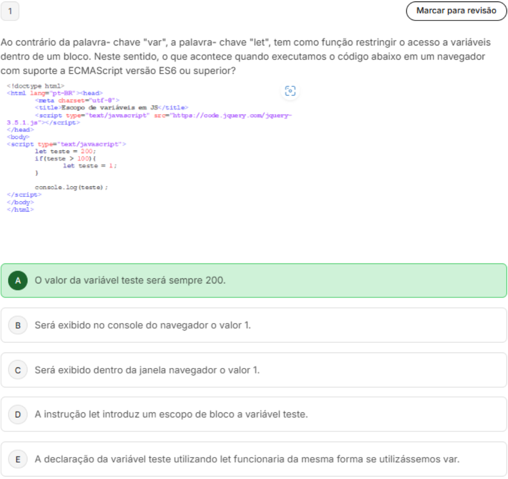 1 Marcar para revisão Ao contrário da palavra- chave "var", a palavra- chave "let", tem como função restringir 0 acesso a variáveis dentro de um bloco. Neste sentido, que acontece quando executamos 0 código abaixo em um navegador com suporte a ECMAScript versão ES6 ou superior? html> Escopo de variáveis em JS let teste = 1; ) console. log (teste) A valor da variável teste será sempre 200. Será exibido no console do navegador 0 valor 1. Será exibido dentro da janela navegador valor 1. D A instrução let introduz um escopo de bloco a variável teste. E A declaração da variável teste utilizando let funcionaria da mesma forma se utilizássemos var.2 Marcar para revisão Considere a página abaixo, construída utilizando jQuery: $(document).ready(function() Esconder Texto do parágrafo. Para que, ao se clicar no botão Esconder, texto do parágrafo se torne oculto, deve-se preencher a lacuna I com: A D E3 Marcar para revisão Considere a página abaixo, desenvolvida utilizando-se jQuery. html> Executar a requisição AJAX Para que, ao clicar no link, seja feita uma requisição ao arquivo sanasa.php que está no servidor, de forma que o retorno seja recebido em data e status da operação em status, a lacuna deve ser corretamente preenchida por: A $.get B $request C $post D $.send E $.ajax4 Marcar para revisão Em um projeto de interface web, um desenvolvedor utiliza jQuery para aprimorar a interatividade. Ele planeja modificar o estilo de um botão quando usuário passa mouse sobre ele. Para isso, ele precisa selecionar corretamente 0 botão e aplicar a função de estilo. Qual método jQuery desenvolvedor deve usar para selecionar 0 botão pelo seu ID e aplicar uma mudança de estilo ao passar mouse? A $('#botao').hover() C D E 5 Marcar para revisão jQuery pode selecionar elementos HTML a partir de seletores, otimizando desenvolvimento. Sobre a utilização de seletores no jQuery, é correto afirmar: A $('td, th'); retornará todos os elementos th que são filhos de td. $('#formulario'); retornará todos os elementos da classe 'formulario'. C $('p:first'); retornará primeiro dos elementos p. D retornará o elemento com id igual a 'paragrafo'. E retornará primeiro dos elementos p.6 Marcar para revisão Uma aplicação web requer a atualização de conteúdo sem recarregar a página inteira. 0 desenvolvedor decide usar jQuery para realizar requisições AJAX, buscando dados de um servidor e atualizando um elemento da página. Qual função jQuery é apropriada para enviar uma requisição AJAX GET e atualizar um elemento com o ID 'conteudo'? A C $.get('url', function(data) { $('#conteudo').html(data); D E function(data) 7 Marcar para revisão Em um projeto web, ao implementar uma tabela HTML dinâmica utilizando jQuery e AJAX, os dados são recebidos do servidor no formato JSON. A tabela é atualizada automaticamente sem recarregar a página, melhorando a experiência do usuário. Qual método HTTP é mais adequado para a realização dessa tarefa e por quê? A PUT, pois permite substituir recursos no servidor. GET, pois é utilizado para solicitar dados de um recurso especificado. C DELETE, pois remove recursos do servidor. D HEAD, pois solicita uma resposta similar ao GET, sem corpo da resposta. E TRACE, pois permite diagnóstico no caminho para 0 alvo.8 Marcar para revisão Um programador está trabalhando em uma aplicação web e precisa garantir que uma variável seja acessível somente dentro do bloco onde foi declarada, evitando conflitos com outras partes do código. Qual palavra-chave em Javascript deve ser usada para declarar a variável com o escopo desejado? A var. let. C const. D scope. E block. 9 Marcar para revisão Considere bloco de código abaixo que utiliza JavaScript e JSON. var text + "linha":"vermelha"), JSON. parse (text) $("#exibe") html Para que o bloco de código exiba 0146 vermelha, a lacuna I deve ser corretamente preenchida por: A x.trens[2].trem +"" + + x.trens[2].linha text.trens[trem] + + text.trens[linha] x.trens[1].trem + + x.trens[1].linha D x.trens[trem] + + x.trens[linha] E text.trens[1].trem + + text.trens[1].linha10 Marcar para revisão Em um projeto web, um desenvolvedor opta por utilizar 0 JQuery para simplificar a manipulação do DOM. Ele necessita implementar uma função que esconda todos os elementos com a classe .destaque ao clicar em um botão específico. Qual linha de código em JQuery realiza corretamente a ação descrita acima? A $("p.destaque").hideOnClick(); { $(this).hide(); }); C "p", function() { $(this).hide(); }); D $("button").click(function() { }); E { $(this).hide(); 1 Marcar para revisão 0 Vue permite a junção de componentes para gerar componentes maiores e mais complexos. De que maneira um componente pai passa um bloco HTML ou outros componentes de modo a preencher um espaço pré- definido em seu componente filho (uma espécie de janela ou abertura)? A Através de eventos. B Através de props. C Através de classes CSS. D Através de slots. E Através de uma imagem.2 Marcar para revisão 0 método data retorna um objeto. Qual palavra-chave deveria estar no lugar dos pontos de interrogação colocados dentro do método 'alertaPagina' ao referenciar a variável? data(){ return { pagina : 'HOME' } }, methods:{ alertaPagina(){ alert( ?????.pagina) } } Considere que os dados estão corretamente posicionados dentro da Vue Instance. A self my on D data E this3 Marcar para revisão Um desenvolvedor, ao trabalhar com componente de lista de cidades, não obteve sucesso ao utilizar componente filho CardCidade.vue, veja abaixo 0 código construído por ele. Qual das alternativas apresenta o motivo pelo qual a página não funcionou corretamente? Cidade Selecionada: cidadeselecionada }} import CardCidade from export default A Ele esqueceu de importar arquivo. Ele não passou as props necessárias. C Ele não utilizou o componente no HTML. D Ele não registrou o componente. E Ele não definiu o método corretamente.4 Ma