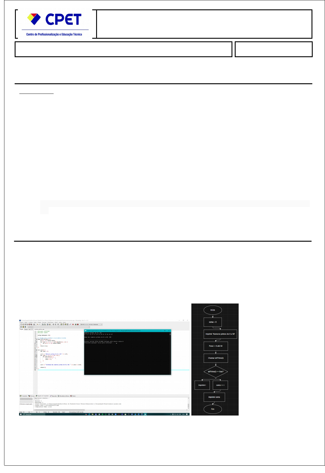 Algoritmos e Programação- SG Data: Aluno(a): Atividade Prática II INSTRUÇÕES: · Esta Atividade contém questões totalizando 10 (dez) pontos; · Você deve preencher dos dados no Cabeçalho para sua identificação: · Nome / Data de entrega. · Aqui estão as informações sobre o formato de envio de respostas para a atividade: · Parte do desenvolvimento digitado ou com Print Screen: Word ou PDF (Vl.5,0) · Utilize a folha da solicitação da atividade para o envio da atividade. Atividade sem a folha será desconsiderada ou zerada. · Cada resposta deve estar abaixo da pergunta da atividade. Respostas fora de contexto da atividade serão desconsideradas. · Faça um Print Screen da tela do seu computador com a execução do código-fonte. No Print Screen, deve constar a data e a hora do seu sistema no canto direito. · Envie o arquivo executável de todo o seu código junto com os demais itens. (Vl.5,0 pontos) · Certifique-se de fazer o upload dos arquivos nos formatos especificados. Arquivos em outros formatos ou com itens faltando não serão avaliados. · Você poderá utilizar IDE’s de programação como o DEV cpp, NetBeans, Eclipse, jupyter notebook, Etc · O programa indicado para compactar as respostas é o WinRAR · Envio o arquivo pelo sistema no local indicado; · Em caso de dúvidas consulte o seu Tutor. Atividade Prática II- Algoritmos e Programação - SG Nome: CPF: 1. Implemente um programa que leia todos os números primos de 0 a 50 e some todos eles no final. Resposta: 2. Implemente um programa que calcule a distância entre sua cidade e a cidade de Mossoró. Receba o nome completo do aluno. Resposta: Exemplo: da saída do programa: Qual a sua cidade? São Paulo/SP A distância entre São Paulo e Mossoró/RN é de 226.8 quilômetros, Meu nome é Pedro Vale. 3. Com base nos seus conhecimentos, implemente um programa que receba o nome completo do usuário e, em seguida, conte a quantidade de letras do nome. Depois, o programa deve listar os números de 0 a 100 que possuam a mesma quantidade de letras que o nome do usuário. 4. Implemente um programa que leia a frase “PLAGIO É CRIME” e conte quantas letras ela tem. 5. Construa um fluxograma de todos os programas desenvolvidos, incluindo todos os dados do seu código fonte. 6. Envie o arquivo executável de todos os seus códigos junto com os demais itens. (Vl.5,0 pontos) Arquivo executável Um arquivo executável é um arquivo que contém um programa que pode ser executado diretamente pelo sistema operacional, sem a necessidade de um compilador ou interpretador. Ao escrever um código-fonte em uma linguagem de programação, é necessário compilar ou interpretar o código para criar um arquivo executável. O processo de compilação ou interpretação converte o código-fonte em um formato que o sistema operacional pode entender e executar. O tipo de arquivo executável gerado depende da linguagem de programação utilizada e do sistema operacional em que o programa será executado. Por exemplo, “em sistemas Windows, os arquivos executáveis geralmente têm a extensão”.exe", enquanto em sistemas Unix/Linux, os arquivos executáveis podem ter diferentes extensões, como ".out" ou nenhum tipo de extensão WinRAR Obs: Utilize um software compactado e descompactado de dados para juntar todos os itens: WinRAR WinRAR - Software de compactação e arquivamento de arquivos. Ele permite que os usuários compactem arquivos e pastas em um único arquivo de arquivamento, que pode ser facilmente transferido ou armazenado. O software suporta uma ampla variedade de formatos de compactação, incluindo RAR, ZIP, CAB, ARJ, LZH, TAR, GZip, UUE, ISO, BZIP2, Z e 7-Zip Dica de programas para desenvolvimento: Programa Portugol: http://siaiacad17.univali.br/webportugol/tutorial_web_portugol.pdf http://www.decom.ufop.br/guillermo/BCC201/slides/Portugol_BCC201_2.pdf Programa DEV: https://bitcaverna.wordpress.com/aprendendo-a-programar-em-dev-c-iniciantes-aula-01/ Programa (gratuito) devc++download : https://bloodshed-dev-c.softonic.com.br/ Atividade Prática Serviços de Turismo e Viagens - GUI image3.png image4.png image5.png image6.png image7.png image8.png image1.png image2.png image10.jpeg image9.png
