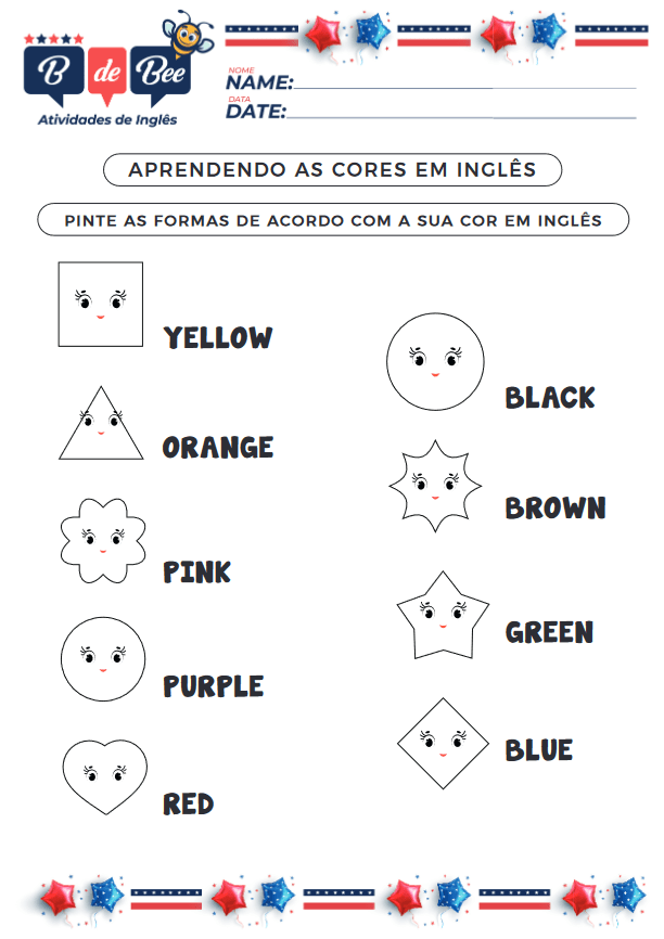 ........ ........ B de Bee NOME NAME: DATA DATE: Atividades de Inglês APRENDENDO AS CORES EM INGLÊS PINTE AS FORMAS DE ACORDO COM A SUA COR EM INGLÊS YELLOW BLACK ORANGE BROWN PINK GREEN PURPLE BLUE RED ........ ........