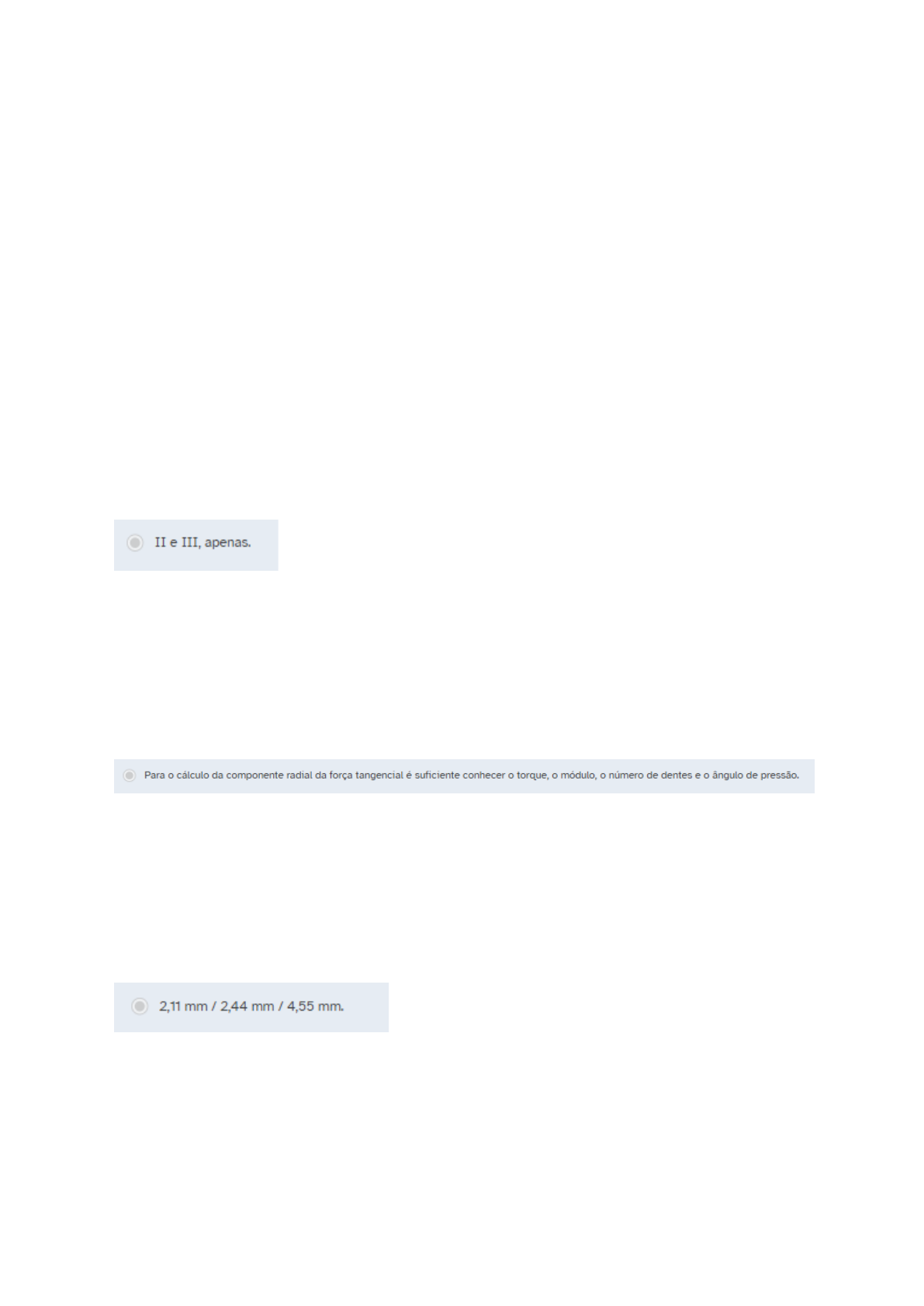 ELEMENTOS DE MECANISMOS PROVA N2 - 1º SEMESTRE DE 2025 Uma engrenagem cônica reta tem as seguintes características: o pinhão tem 24 dentes, a coroa tem 42 dentes, o módulo é igual a 12 e o ângulo de pressão é igual a 20º. O par de engrenagens transmite 2,9 kW de potência, sendo que o pinhão gira a 300 rpm, considerando, ainda, que a largura da face é de 30 mm. Baseando-se nesses dados, analise as afirmativas a seguir. I. O ângulo de cone primitivo para o pinhão fica em torno de 18,4º. II. O ângulo de cone primitivo para a coroa fica em torno de 74º. III. O torque de operação do pinhão é de aproximadamente 92,3 N.m. IV. O raio médio do pinhão e a carga transmitida são iguais a 13,9 mm e 4,6 kN, respectivamente. Está correto o que se afirma em: A força que atua tangencialmente à superfície do passo e perpendicularmente à direção axial de eixo da engrenagem helicoidal é a força que aciona a engrenagem de fato. Para o cálculo da componente tangencial da força, é preciso conhecer alguns dados relativos à aplicação do sistema. Assinale a alternativa correta, relativa aos dados suficientes para o cálculo da componente radial da força tangencial: Num conjunto de parafuso e coroa sem-fim, alguns parâmetros são o adendo, o dedendo e a profundidade total. O adendo é a saliência do dente, o dedendo é a profundidade do dente, e a profundidade total, por sua vez, é a soma do adendo e do dedendo. Para um conjunto com passo diametral igual a 12, a seguir, assinale a alternativa correta com os valores, respectivamente, de adendo, dedendo e profundidade em milímetros. Para realizar os cálculos defadiga superficial nas engrenagens cilíndricas de dentes helicoidais, o mecanismo de falha também é o da crateração. O nível de tensão de contato entre dentes é determinado pela equação de Buckingham, conforme mostrado a seguir: Em que: Cp= coeficiente elástico do material da engrenagem em MPa; Wt= força tangencial sobre o dente em N; F = largura da face do dente em mm; I = fator geométrico de superfície (adimensional); dp = diâmetro primitivo da menor engrenagem em mm; Ca, Cm, Cv e Cs = constantes adimensionais fornecidas; Cf= coeficiente de acabamento superficial (adimensional). Considere uma engrenagem (pinhão de aço com engrenagem de ferro fundido nodular, com coeficiente elástico do material da engrenagem 179 MPa0,5). Nela, atua uma força tangencial de 1500 N. Supondo que a largura da face do dente seja de 30 mm, fator geométrico de superfície de 0,18, diâmetro primitivo de 50 mm e que as constantes Ca, Cm, Cv e Cs sejam, respectivamente: 1, 1,6, 0,66 e 1, além do coeficiente de acabamento superficial Cf = 1, é correto afirmar que o valor da tensão superficial em MPa de contato que atua sobre a engrenagem será de, aproximadamente: Considere o sistema planetário de engrenagens ilustrado adiante. Nele, a engrenagem sol (componente 1) tem 20 dentes externos, a engrenagem planetária (componente 2) tem 60 dentes externos, e a engrenagem anel (componente 4) tem 140 dentes internos. Considere também que o braço tem velocidade de 0,5 rpm no sentido horário e o anel está parado. Nessas condições, a razão entre a engrenagem sol e o braço é igual a: Fonte: Elaborada pelo autor. #PraCegoVer: a figura mostra um sistema planetário com engrenagens. No centro, está a representação de uma engrenagem azul-claro (componente 1), sendo ela a menor delas. Uma engrenagem maior, azul-escuro (componente 2), está conjugada à engrenagem azul-claro; um braço (componente 3) une as aludidas engrenagens, azul-claro e azul-escuro. Uma engrenagem interna azul (componente 4), em formato de anel e maior, engrena também com a engrenagem azul-escuro. Demais componentes estão dentro do anel, e três linhas indicam que a engrenagem anel azul está fixa. O reconhecimento das principais nomenclaturas e estruturas inerentes às engrenagens e à dinâmica do engrenamento é fundamental para se realizar os cálculos de projeto. Alguns parâmetros importantes são: o passo circular; o passo diametral; e o módulo. Todos esses são dependentes do bom entendimento do conceito de círculo primitivo, que é um círculo teórico que corresponde à distância entre dois pontos idênticos em dois dentes adjacentes na engrenagem. Considere uma engrenagem com número de dentes igual a 92 e com um diâmetro primitivo de 4 polegadas. Sobre a engrenagem citada, analise as afirmativas a seguir. I. A engrenagem citada tem valor de passo circular de, aproximadamente, 0,1366 polegadas. II. A engrenagem descrita terá valor de passo diametral igual a, aproximadamente, 23. III. Com base no número de passos diametrais, essa engrenagem seria classificada como de passos diametrais grosseiros. IV. O valor do módulo dessa engrenagem é menor que 1. Está correto o que se afirma em: Um projetista estava estudando como projetar uma engrenagem helicoidal e, para isso, pesquisou os catálogos dos fabricantes, para entender melhor. No primeiro catálogo, encontrou uma engrenagem em que informava que possuía ângulo de hélice de 30º e ângulo de pressão normal de 20º, e no segundo catálogo, encontrou uma engrenagem com ângulo de pressão normal de 14,5º e ângulo de hélice de 14,5º. Assinale a alternativa que apresenta, respectivamente, os ângulos de pressão transversal, no primeiro e segundo catálogos: Considere o sistema planetário de engrenagens da figura adiante. Nele, a engrenagem sol (componente 1) tem 80 dentes externos, a engrenagem planetária (componente 2) tem 20 dentes externos, e a engrenagem anel (componente 4) tem 120 dentes internos. Considere também que o braço tem velocidade de 10 rpm no sentido anti-horário e a engrenagem anel está parada. Nessas condições, a razão de transmissão e a velocidade da engrenagem sol são respectivamente iguais a: Fonte: Elaborada pelo autor. #PraCegoVer: a figura mostra um sistema planetário. No centro, está a rep
