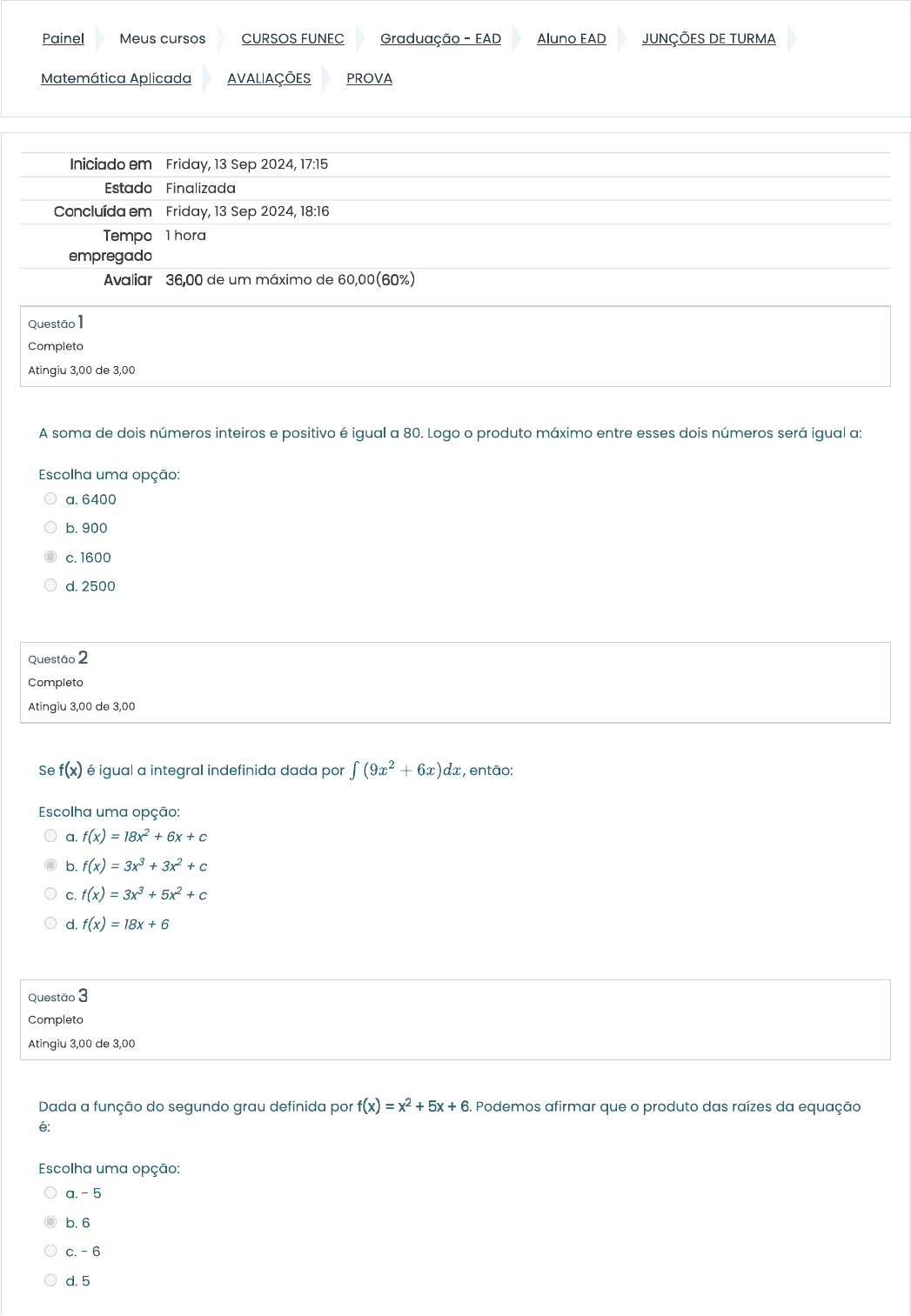 Painel Meus cursos CURSOS FUNEC Graduação EAD Aluno EAD JUNÇÕES DE TURMA Matemática Aplicada AVALIAÇÕES PROVA Iniciado em Friday, 13 Sep 2024, 17:15 Estado Finalizada Concluída em Friday, 13 Sep 2024, 18:16 Tempo 1 hora empregado Avaliar 36,00 de um máximo de 60,00(60%) Questão 1 Completo Atingiu 3,00 de 3,00 A soma de dois números inteiros e positivo é igual a 80. Logo produto máximo entre esses dois números será igual a: Escolha uma opção: a. 6400 b. 900 C. 1600 d. 2500 Questão 2 Completo Atingiu 3,00 de 3,00 Se f(x) é igual a integral indefinida dada por + 6x dx, então: Escolha uma opção: Questão 3 Completo Atingiu 3,00 de 3,00 Dada a função do segundo grau definida por f(x) = + 5x + 6. Podemos afirmar que o produto das raízes da equação é: Escolha uma opção: b.6 d.5Questão 4 Completo Atingiu 3,00 de 3,00 Qual das integrais abaixo fornece como resultado a função F(x) onde cé uma constante: Escolha uma opção: a. (4x - dx b. (2x 2)dx C. (8x³ + dx d. (4x + dx Questão 5 Completo Atingiu 0,00 de 3,00 Uma caixa d'água sem tampa, de base quadrada, deve ser construída de forma que seu volume seja 2500 material da base vai custar 1200 reais por m² e material dos lados 980 reais m². Encontre as dimensões da caixa de modo que custo do material seja mínimo. Escolha uma opção: a. = 19,13 metros e y 13,66 metros b.x = 9,78 metros e y = 15,98 metros C. = 15,98 metros e y 9,78 metros d.x = 13,66 metros e y = 19,13 metros Questão 6 Completo Atingiu 0,00 de 3,00 Se a variável X na expressão = tende ao mais infinito. É correto afirmar que: Escolha uma opção: a. Tende a zero. C. y tende a mais infinito. d. y tende a menos infinito. Questão 7 Completo Atingiu 3,00 de 3,00 perímetro de um lote retangular é de 800 metros. Logo as dimensões desse lote para que tenha área máxima é: Escolha uma opção: a.x 200 m e y 200 m b. X = 150 m e y 250 m 300 m e y 100 m d. 100 m e y 300 mQuestão 8 Completo Atingiu 3,00 de 3,00 lucro obtido no processo de fabricação de um produto, pode ser calculado subtraindo custo total de produção, do preço total de vendas desse produto. Uma indústria farmacêutica vende uma dose de um certo fármaco por 200 reais. Sabendo que a capacidade de produção mensal dessa indústria varia de 0 a 30000 unidades e que custo de produção nesse período vale C(x) = + 8.10x + onde X é a quantidade de doses produzidas. lucro máximo será obtido se forem produzidas: Escolha uma opção: a. 15000 doses b. 30000 doses C. 20000 doses d. 10000 doses Questão 9 Completo Atingiu 0,00 de 3,00 derivada da função F(x) Escolha uma opção: C. = 2x d. (2x) Questão 10 Completo Atingiu 3,00 de 3,00 A derivada da Escolha uma opção: a. F'(x) - d. 15Questão 11 Completo Atingiu 3,00 de 3,00 A derivada da função F(x) = sen Escolha uma opção: b. F'(x) = C. F'(x) = - d. F'(x) = Questão 12 Completo Atingiu 3,00 de 3,00 A solução da integral indefinida Escolha uma opção: a. Questão 13 Completo Atingiu 0,00 de 3,00 Dadas as funções definidas por e g(x) = é correto afirmar: Escolha uma opção: a. Os gráficos de f(x) e g(x) não se interceptam. b. f(x) é decrescente e é decrescente. =Questão 14 Completo Atingiu 0,00 de 3,00 valor de y dado por Escolha uma opção: a. 0 C. d. 20 Questão 15 Completo Atingiu 0,00 de 3,00 Considere uma partícula que se mova segundo a função F(x) = 4t³ + 4, onde F(x) é definido em metros e tem segundos. Nestas condições é correto afirmar que: Escolha uma opção: a. A aceleração da partícula em t=2 vale 14 m/s² b. A velocidade da partícula em t=2 vale 28m/s C. A aceleração da partícula em t=2 vale velocidade da partícula em t=2 vale 14 m/s Questão 16 Completo Atingiu 0,00 de 3,00 Dada a função racional podemos a firmar que limite dessa função quando x 3 é: Escolha uma opção: a. 3 2 b.0 d. 2 3Questão 17 Completo Atingiu 3,00 de 3,00 derivada da função F' Escolha uma opção: b. = -3 C. F'(x) = 1 Questão 18 Completo Atingiu 0,00 de 3,00 Uma derivada mede a inclinação de uma reta tangente em um ponto sobre uma curva. derivada da função F(x) = terá inclinação nula (zero) no ponto: Escolha uma opção: a.x=2 d.x=4 Questão 19 Completo Atingiu 3,00 de 3,00 limite da expressão dada por vale: Escolha uma opção: a. 32 b. 32 d.0Questão 20 Completo Atingiu 3,00 de 3,00 A derivada da função ponto Escolha uma opção: C. = 2 Manter contato RA (33) 99986-3935 secretariaead@funec.br f Baixar aplicativo móvel.