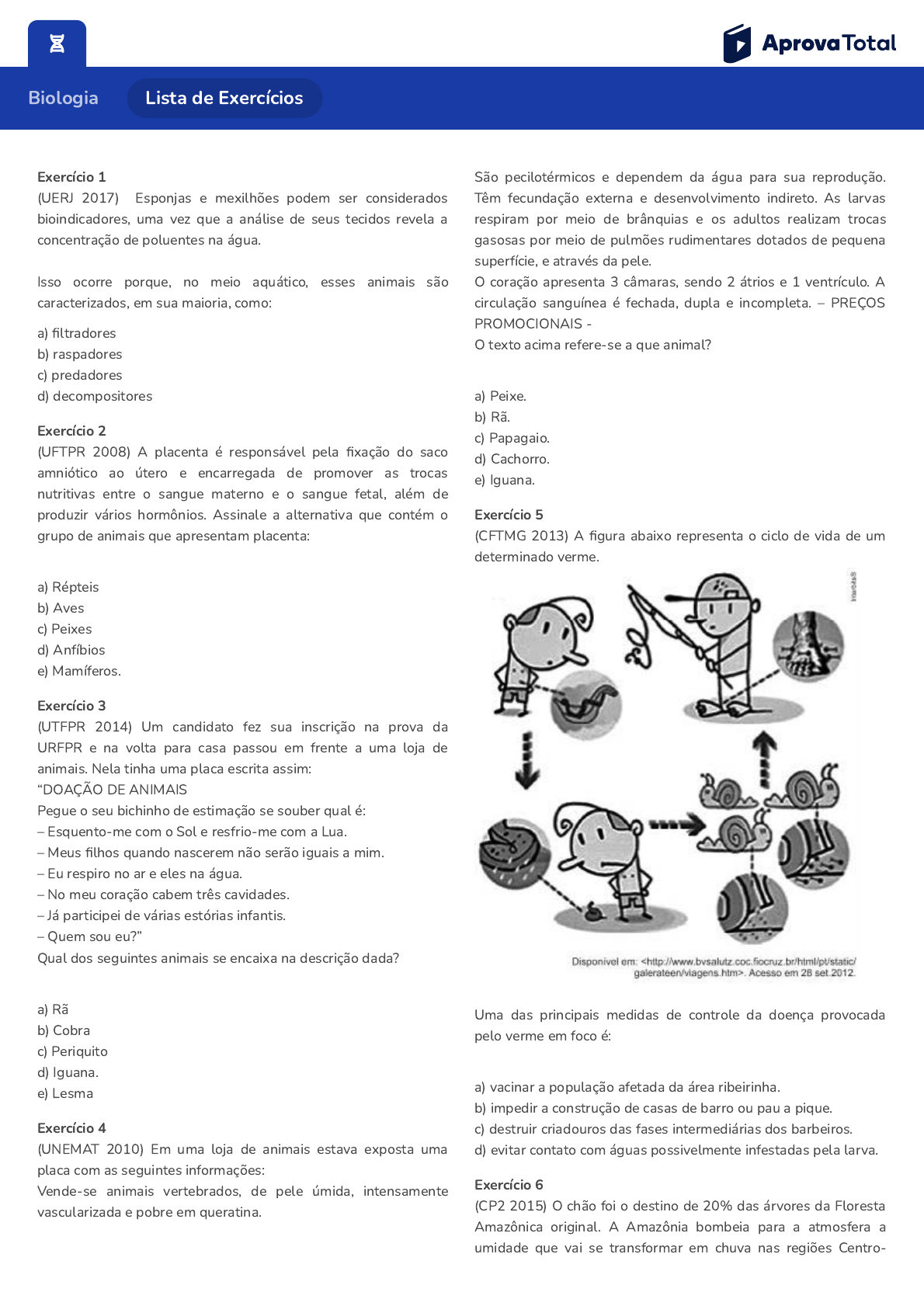 https://www.biologiatotal.com.br/medio/biologia/exercicios/zoologia/ex.-27-moluscos-e-anelideos 1/71 Biologia Lista de Exercícios Exercício 1 (UERJ 2017) Esponjas e mexilhões podem ser considerados bioindicadores, uma vez que a análise de seus tecidos revela a concentração de poluentes na água. Isso ocorre porque, no meio aquático, esses animais são caracterizados, em sua maioria, como: a) �ltradores b) raspadores c) predadores d) decompositores Exercício 2 (UFTPR 2008) A placenta é responsável pela �xação do saco amniótico ao útero e encarregada de promover as trocas nutritivas entre o sangue materno e o sangue fetal, além de produzir vários hormônios. Assinale a alternativa que contém o grupo de animais que apresentam placenta: a) Répteis b) Aves c) Peixes d) Anfíbios e) Mamíferos. Exercício 3 (UTFPR 2014) Um candidato fez sua inscrição na prova da URFPR e na volta para casa passou em frente a uma loja de animais. Nela tinha uma placa escrita assim: “DOAÇÃO DE ANIMAIS Pegue o seu bichinho de estimação se souber qual é: – Esquento-me com o Sol e resfrio-me com a Lua. – Meus �lhos quando nascerem não serão iguais a mim. – Eu respiro no ar e eles na água. – No meu coração cabem três cavidades. – Já participei de várias estórias infantis. – Quem sou eu?” Qual dos seguintes animais se encaixa na descrição dada? a) Rã b) Cobra c) Periquito d) Iguana. e) Lesma Exercício 4 (UNEMAT 2010) Em uma loja de animais estava exposta uma placa com as seguintes informações: Vende-se animais vertebrados, de pele úmida, intensamente vascularizada e pobre em queratina. São pecilotérmicos e dependem da água para sua reprodução. Têm fecundação externa e desenvolvimento indireto. As larvas respiram por meio de brânquias e os adultos realizam trocas gasosas por meio de pulmões rudimentares dotados de pequena superfície, e através da pele. O coração apresenta 3 câmaras, sendo 2 átrios e 1 ventrículo. A circulação sanguínea é fechada, dupla e incompleta. – PREÇOS PROMOCIONAIS - O texto acima refere-se a que animal? a) Peixe. b) Rã. c) Papagaio. d) Cachorro. e) Iguana. Exercício 5 (CFTMG 2013) A �gura abaixo representa o ciclo de vida de um determinado verme. Uma das principais medidas de controle da doença provocada pelo verme em foco é: a) vacinar a população afetada da área ribeirinha. b) impedir a construção de casas de barro ou pau a pique. c) destruir criadouros das fases intermediárias dos barbeiros. d) evitar contato com águas possivelmente infestadas pela larva. Exercício 6 (CP2 2015) O chão foi o destino de 20% das árvores da Floresta Amazônica original. A Amazônia bombeia para a atmosfera a umidade que vai se transformar em chuva nas regiões Centro- https://www.biologiatotal.com.br/medio/biologia/exercicios/zoologia/ex.-27-moluscos-e-anelideos 2/71 Oeste, Sudeste e Sul do Brasil. Quanto maior o desmatamento, menos umidade e, portanto, menos chuva. (Disponível em: http://.globo.com/fantastico/noticia/2014/08/. Adaptado.) Entre os vertebrados a seguir, o grupo mais afetado pela diminuição da umidade seria o de: a) mamíferos b) anfíbios c) répteis d) aves. Exercício 7 (UECE 2019) São características gerais dos artrópodes: a) patas articuladas e exoesqueleto. b) patas articuladas e aparelho bucal sugador. c) aparelho bucal mastigador e endoesqueleto. d) aparelho bucal lambedor e 12 patas. Exercício 8 . (Unicamp 2019) Nos quadrinhos a seguir, o personagem Gar�eld questiona a relevância ecológica do animal representado à direita. Assinale a alternativa que descreve corretamente aspectos zoológicos e ecológicos referentes a esse animal. a) As minhocas são invertebrados do �lo dos anelídeos, possuem corpo celomado e segmentado, convertem detritos ingeridos em matéria orgânica e melhoram o arejamento do solo. b) As cobras-cegas são vertebrados do �lo dos anelídeos, possuem corpo pseudocelomado e reprodução sexuada, são predadoras de pragas agrícolas e melhoram o arejamento do solo. c) As cobras-cegas são invertebrados do �lo dos cordados, possuem corpo celomado e não segmentado e são capazes de controlar ervas daninhas, pois consomem suas raízes. d) As minhocas são invertebrados do �lo dos anelídeos, possuem pseudoceloma e reprodução assexuada, são predadoras de pragas agrícolas e melhoram o arejamento do solo. Exercício 9 (UECE 2019) Relacione, corretamente, as verminoses humanas com suas características, numerando a Coluna II de acordo com a Coluna I. Coluna I 1. Ancilostomose 2. Ascaridíase 3. Teníase 4. Esquistossomose Coluna II ( ) Conhecida como amarelão, por poder desencadear anemia. ( ) Popularmente conhecida como barriga d’água, é uma verminose causada pelo Schistosoma mansoni. ( ) Causada pelo Ascaris lumbricoides adquirido pela ingestão de seus ovos presentes em água ou alimento. ( ) Pode ser causada pela Taenia solium ou pela Taenia saginata presentes em carnes contaminadas. A sequência correta, de cima para baixo, é: a) 4, 1, 3, 2. b) 3, 2, 1, 4. c) 2, 3, 4, 1. d) 1, 4, 2, 3. Exercício 10 (CPS 2015) O personagem Bob Esponja, do desenho animado criado pelo biólogo marinho Stephen Hillenburg, representa um animal do Filo Porifera conhecido popularmente como esponja. Para tornar esse desenho mais divertido e atraente, Stephen colocou nessa esponja várias características humanas, tais como boca, pernas, braços, olhos e dentes, que não condizem com a realidade desse animal na natureza. Se o Bob Esponja não andasse, falasse, dançasse ou comesse, seria, com certeza, muito sem graça. Sendo assim, muitos conceitos biológicos estão distorcidos nesse desenho animado. As esponjas verdadeiras são animais porosos, aquáticos, �xos, isolados ou coloniais e possuem diversas formas, cores e tamanhos. A água penetra no corpo dos poríferos através de inúmeros poros, sendo esta a característica a que se refere o nome desses animais.