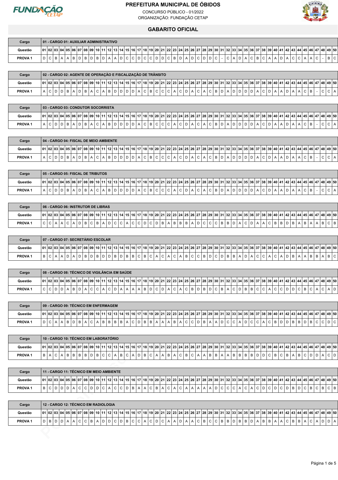 pcimarkpci MjgwNDowMTRjOmRhYTc6ODMzZjo3NjM2OjhmNWI6MjczYjo0NTQw:TW9uLCAyMyBKdW4gMjAyNSAyMDo1NDo0NyAtMDMwMA== www.pciconcursos.com.br PREFEITURA MUNICIPAL DE ÓBIDOS CONCURSO PÚBLICO - 01/2022 ORGANIZAÇÃO: FUNDAÇÃO CETAP GABARITO OFICIAL Cargo 01 - CARGO 01: AUXILIAR ADMINISTRATIVO Questão 01 02 03 04 05 06 07 08 09 10 11 12 13 14 15 16 17 18 19 20 21 22 23 24 25 26 27 28 29 30 31 32 33 34 35 36 37 38 39 40 41 42 43 44 45 46 47 48 49 50 PROVA 1 D C B A A B D B D B D A A D C C D C C D D C B D A D C D D C - C A D A C B C A A D A C C A A C - B C Cargo 02 - CARGO 02: AGENTE DE OPERAÇÃO E FISCALIZAÇÃO DE TRÂNSITO Questão 01 02 03 04 05 06 07 08 09 10 11 12 13 14 15 16 17 18 19 20 21 22 23 24 25 26 27 28 29 30 31 32 33 34 35 36 37 38 39 40 41 42 43 44 45 46 47 48 49 50 PROVA 1 A C D D B A D B A C A B D D D D A C B C C C A C D A C A C B D A D D D D A C D A A D A A C B - C C A Cargo 03 - CARGO 03: CONDUTOR SOCORRISTA Questão 01 02 03 04 05 06 07 08 09 10 11 12 13 14 15 16 17 18 19 20 21 22 23 24 25 26 27 28 29 30 31 32 33 34 35 36 37 38 39 40 41 42 43 44 45 46 47 48 49 50 PROVA 1 A C D D B A D B A C A B D D D D A C B C C C A C D A C A C B D A D D D D A C D A A D A A C B - C C A Cargo 04 - CARGO 04: FISCAL DE MEIO AMBIENTE Questão 01 02 03 04 05 06 07 08 09 10 11 12 13 14 15 16 17 18 19 20 21 22 23 24 25 26 27 28 29 30 31 32 33 34 35 36 37 38 39 40 41 42 43 44 45 46 47 48 49 50 PROVA 1 A C D D B A D B A C A B D D D D A C B C C C A C D A C A C B D A D D D D A C D A A D A A C B - C C A Cargo 05 - CARGO 05: FISCAL DE TRIBUTOS Questão 01 02 03 04 05 06 07 08 09 10 11 12 13 14 15 16 17 18 19 20 21 22 23 24 25 26 27 28 29 30 31 32 33 34 35 36 37 38 39 40 41 42 43 44 45 46 47 48 49 50 PROVA 1 A C D D B A D B A C A B D D D D A C B C C C A C D A C A C B D A D D D D A C D A A D A A C B - C C A Cargo 06 - CARGO 06: INSTRUTOR DE LIBRAS Questão 01 02 03 04 05 06 07 08 09 10 11 12 13 14 15 16 17 18 19 20 21 22 23 24 25 26 27 28 29 30 31 32 33 34 35 36 37 38 39 40 41 42 43 44 45 46 47 48 49 50 PROVA 1 C C A A C A D B C B A D C C A C C D C D B A B B B A D C C C B B D A C D A A C B B D B A B A A B C B Cargo 07 - CARGO 07: SECRETÁRIO ESCOLAR Questão 01 02 03 04 05 06 07 08 09 10 11 12 13 14 15 16 17 18 19 20 21 22 23 24 25 26 27 28 29 30 31 32 33 34 35 36 37 38 39 40 41 42 43 44 45 46 47 48 49 50 PROVA 1 B C A A D A D B D B D D B D B B C B C A C A C A B C C B D C D B B A D A C C A C A D B A A B B A B C Cargo 08 - CARGO 08: TÉCNICO DE VIGILÂNCIA EM SAÚDE Questão 01 02 03 04 05 06 07 08 09 10 11 12 13 14 15 16 17 18 19 20 21 22 23 24 25 26 27 28 29 30 31 32 33 34 35 36 37 38 39 40 41 42 43 44 45 46 47 48 49 50 PROVA 1 C C D D A B D A C C A C D A A A A B D C D A C A C B D B D C B A C D B B C C A C C D D C B C A C A D Cargo 09 - CARGO 09: TÉCNICO EM ENFERMAGEM Questão 01 02 03 04 05 06 07 08 09 10 11 12 13 14 15 16 17 18 19 20 21 22 23 24 25 26 27 28 29 30 31 32 33 34 35 36 37 38 39 40 41 42 43 44 45 46 47 48 49 50 PROVA 1 D C A A B D B A C A B B B B A C D B B A A A B A C C D B A A D C C A D C C A C B D D B B D B C C D C Cargo 10 - CARGO 10: TÉCNICO EM LABORATÓRIO Questão 01 02 03 04 05 06 07 08 09 10 11 12 13 14 15 16 17 18 19 20 21 22 23 24 25 26 27 28 29 30 31 32 33 34 35 36 37 38 39 40 41 42 43 44 45 46 47 48 49 50 PROVA 1 B A C A B B B B D B C C A B C A D B C A A B A C B C A A B B A A B B B B D D C B C B A B C D D A C D Cargo 11 - CARGO 11: TÉCNICO EM MEIO AMBIENTE Questão 01 02 03 04 05 06 07 08 09 10 11 12 13 14 15 16 17 18 19 20 21 22 23 24 25 26 27 28 29 30 31 32 33 34 35 36 37 38 39 40 41 42 43 44 45 46 47 48 49 50 PROVA 1 B C D D D A C C D D C A C C D B A A C B A C A C A A A A A D C C C A C A C D C D C D B D C B C B C B Cargo 12 - CARGO 12: TÉCNICO EM RADIOLOGIA Questão 01 02 03 04 05 06 07 08 09 10 11 12 13 14 15 16 17 18 19 20 21 22 23 24 25 26 27 28 29 30 31 32 33 34 35 36 37 38 39 40 41 42 43 44 45 46 47 48 49 50 PROVA 1 D B D D A A C C B A D D C D B C C A C D C A A D A A C B C C B B D B B D A B B A A C B B A C A D D A Página 1 de 5 pcimarkpci MjgwNDowMTRjOmRhYTc6ODMzZjo3NjM2OjhmNWI6MjczYjo0NTQw:TW9uLCAyMyBKdW4gMjAyNSAyMDo1NDo0NyAtMDMwMA== www.pciconcursos.com.br PREFEITURA MUNICIPAL DE ÓBIDOS CONCURSO PÚBLICO - 01/2022 ORGANIZAÇÃO: FUNDAÇÃO CETAP GABARITO OFICIAL Cargo 13 - CARGO 13: TÉCNICO EM ENFERMAGEM SOCORRISTA Questão 01 02 03 04 05 06 07 08 09 10 11 12 13 14 15 16 17 18 19 20 21 22 23 24 25 26 27 28 29 30 31 32 33 34 35 36 37 38 39 40 41 42 43 44 45 46 47 48 49 50 PROVA 1 D C D A A A C D A A A C D A B B D D A D D B D A A B D A A B B B A C C C B C A C B A C A B A B D A B Cargo 14 - CARGO 14: ANALISTA DE INFORMÁTICA Questão 01 02 03 04 05 06 07 08 09 10 11 12 13 14 15 16 17 18 19 20 21 22 23 24 25 26 27 28 29 30 31 32 33 34 35 36 37 38 39 40 41 42 43 44 45 46 47 48 49 50 PROVA 1 C A B A B C A C D A C C A A - C D A D - A C A D D A A C B B B B B C A C C A C B B A A A B D A C D B Cargo 15 - CARGO 15: ANALISTA DE LOGÍSTICA Questão 01 02 03 04 05 06 07 08 09 10 11 12 13 14 15 16 17 18 19 20 21 22 23 24 25 26 27 28 29 30 31 32 33 34 35 36 37 38 39 40 41 42 43 44 45 46 47 48 49 50 PROVA 1 C A - A D A B B D B B D A D C C A D - C A A D C A B B A B C A C C D B A A B D D D D C C C B D C B B Cargo 16 - CARGO 16: ARQUITETO Questão 01 02 03 04 05 06 07 08 09 10 11 12 13 14 15 16 17 18 19 20 21 22 23 24 25 26 27 28 29 30 31 32 33 34 35 36 37 38 39 40 41 42 43 44 45 46 47 48 49 50 PROVA 1 A C D C A D - B B D C D A D B D C - A B B D C C C D D B D D D C D D B D D D C B D B D A D D B B A C Cargo 17 - CARGO 17: ASSISTENTE SOCIAL Questão 01 02 03 04 05 06 07 08 09 10 11 12 13 14 15 16 17 18 19 20 21 22 23 24 25 26 27 28 29 30 31 32 33 34 35 36 37 38 39 40 41 42 43 44 45 46 47 48 49 50 PROVA 1 A C D A C A B C C B D C - D C C A D - A C A D D A B B B D B D B B B A A B C D B B A B B B B D B - A Cargo 18 - CARGO 18: BIBLIOTECÁRIO Questão 01 02 03 04 05 06 07 08 09 10 11 12 13 14 15 16 17 18 19 20 21 22 23 24 25 26 27 28 29 30 31 32 33 34 35 36 37 38 39 40 41 42 43 44 45 46 47 