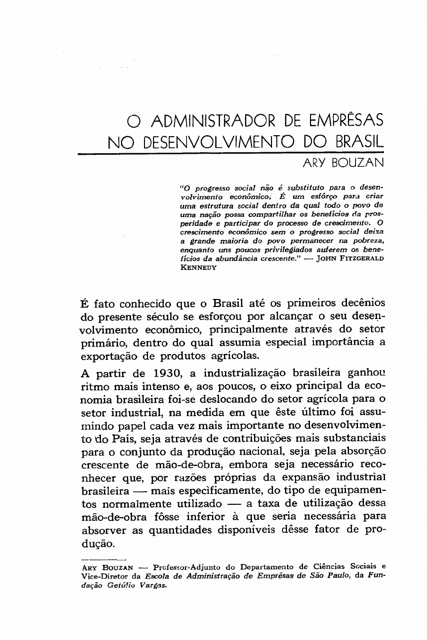 o ADMINISTRADOR DE EMPRÊSAS NO DESENVOLVIMENTO DO BRASIL ARY BOUZAN "O progresso social nijo é substituto para o desen- volvimento econômico; É um esfôrço para criar uma estrutura sociel dentro da qual todo o povo de uma nação possa compartilher os benefícios da pros- peridade e participar do processo de crescimento. O crescimento econômico sem o progresso social deixa a I!lrande maioria do povo permanecer na pobreza, enquanto uns poucos privilegiados auferem os bene- fícios da abundância crescente." - JOHN FITZGERALD KENNEDY É fato conhecido que o Brasil até os primeiros decênios do presente século se esforçou por alcançar o seu desen- volvimento econômico, principalmente através do setor primário, dentro do qual assumia especial importância a exportação de produtos agrícolas. A partir de 1930, a industrialização brasileira ganhou ritmo mais intenso e, aos poucos, o eixo principal da eco- nomia brasileira foi-se deslocando do setor agrícola para o setor industrial, na medida em que êste último foi assu- mindo papel cada vez mais importante no desenvolvimen- to do País, seja através de contribuições mais substanciais para o conjunto da produção nacional, seja pela absorção crescente de mão-de-obra, embora seja necessário reco- nhecer que, por razões próprias da expansão industrial brasileira - mais especificamente, do tipo de equipamen- tos normalmente utilizado - a taxa de utilização dessa mão-de-obra fôsse inferior à que seria necessária para absorver as quantidades disponíveis dêsse fator de pro- dução. ARY BOUZAN - Professor-Adjunto do Departamento de Ciências Sociais e Vice-Diretor da Escola de Administração de Emprêsas de São Paulo, da Fun- dação Getúlio Vargi3s. 42 o ADMINISTRADOR DE EMPR1l:SASNO BRASIL R.A.E./19 Até meados da década de 50 a produção industrial brasi- leira concentrou-se principalmente nos bens de consumo, num processo acelerado de substituição de importações. A partir dêsse momento, ganhou realce a produção de ma- térias-primas e equipamentos, assegurando-se à industria- lização brasileira maior equilíbrio e auto-suficiência, ao mesmo tempo em que aumentava a capacidade do País para resolver alguns dos seus problemas mais sérios, como por exemplo as pressões exercidas sôbre o balanço de pa- gamentos, em conseqüência da necessidade de importar bens não produzidos internamente, conquanto indispensá- veis à economia nacional. A par do desenvolvimento das bases eminentemente ma- teriais, conseqüentes da industrialização, registrou-se no Brasil a formação de uma classe empresarial destinada - como em tôdas as nações em que predominam econo- mias baseadas na livre emprêsa - a assumir papel de grande importância na vida econômica, social e política do País. No presente artigo focalizamos alguns aspectos do desen- volvimento econômico brasileiro e concentramos a aten- ção especialmente na industrialização e no papel especial que nêle cabe à classe empresarial, na conjuntura econô- mico-social. É nosso entendimento que a industrialização, por razões de ordem histórica e pela própria natureza da produção que se obtém no setor, é a única alternativa válida para o crescimento econômico brasileiro. De outro lado, procuramos demonstrar que as condições especiais que cercaram a industrialização brasileira atribuíram grande importância ao desempenho dos empresários bra- sileiros, tanto para garantir eficiência econômica ao desen- volvimento, como também para torná-lo socialmente mais justo. A PRODUÇÃO INDUSTRIAL E SUA NATUREZA O exame da industrialização brasileira, a partir de uma visão perspectiva, põe em relêvo o fato de que êsse fenô- meno ocorreu ao menos por duas razões. A primeira, de R.A.E./19 o ADMINISTRADOR DE EMPRi:SAS NO BRASIL 43 natureza histórica, resulta da observação do significado da Revolução Industrial em diversos países, assim como do comportamento do comércio externo da maioria dos países subdesenvolvidos, entre os quais o Brasil. A segun- da consiste no entendimento de que a produção industrial, em razão da sua própria natureza, oferece possibilidades de largo alcance para o desenvolvimento econômico do Brasil. 1 . A Lição da Revolução Industrial A partir de meados do Século XVIII a estrutura econô- mica européia começou a submeter-se a profundo proces- so de transformação, com implicações de grande impor- tância nos diversos setores de interêsse social, econômico e político. Trata-se da Revolução Industrial que, confor- me mencionou ASHToN,foi muito mais "evolução" do que "revolução", e não foi apenas "industrial", mas também social e intelectual.' Alguns autores costumam dividir essa revolução em duas partes: a primeira vai de 1760 até 1860 e a outra se inicia em 1860 e alcança as primeiras décadas do presente século. A sua primeira manifestação ocorreu na Inglaterra; em seguida, estendeu-se à França e, nos 100 anos seguin- tes, alcançou a Alemanha, os Estados Unidos da Amé- rica e, depois, voltando ao Velho Continente, outros paí- ses europeus." Ao manifestar-se pela primeira vez na Inglaterra, a Re- volução Industrial encontrou um sistema econômico já de grande alcance. Era uma economia de bases eminente- mente comerciais e que registraria seu nome na História como Revolução Comercial. Na verdade, como observa SÉE, "por tôda parte, foi o impulso do poder comercial que permitiu a grande transformação industrial ocorrida 1) T. S. ASHTON, La Revolución Industrial, Breviários do Fondo de Cultura Economica, pág. 10. 2) Vide EOWARD McNALL BURNS, Histôria da Civilização Ocidental, Editôra Globo, págs. 647 e segs.. 44 o ADMINISTRADOR DE EMPRÊSAS NO BRASIL R.A.E.j19 na Inglaterra, na segunda metade do Século XVIII e, mais tarde, na França".' Embora a produção manufatureira tivesse sua origem diretamente na expansão comercial - na verdade, foi prà