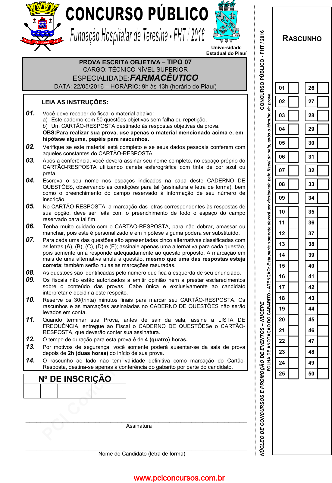 pcimarkpci MDAwMDowMDAwOjAwMDA6MDAwMDowMDAwOmZmZmY6OTU0ZTpiOWI2:U3VuLCAyMiBKdW4gMjAyNSAxNToxNDowOCAtMDMwMA== www.pciconcursos.com.br PROVA ESCRITA OBJETIVA CARGO: TÉCNICO ESPECIALIDADE: DATA: 22/05/2016 – HORÁRIO: LEIA AS INSTRUÇÕES: 01. Você deve receber do fiscal o material abaixo: a) Este caderno com 50 questões o b) Um CARTÃO-RESPOSTA destinado às respostas objetivas da prova. OBS:Para realizar sua prova, use apenas o material m encionado acima e hipótese alguma, papéis para rascunhos. 02. Verifique se este material está completo e se seus dados pessoais conferem com aqueles constantes do CARTÃO-RESPOSTA. 03. Após a conferência, você deverá assinar seu nome completo, no espaço próprio do CARTÃO-RESPOSTA utilizando caneta esferográfica com tinta de cor azul ou preta. 04. Escreva o seu nome nos espaços indicados na capa deste CA QUESTÕES, observando as condições para tal (assinatura e letra de forma), bem como o preenchimento do campo reservado à informação de seu número de inscrição. 05. No CARTÃO-RESPOSTA, a marcação das letras correspondentes às respostas de sua opção, deve ser feita com o preenchimento de todo o espaço do campo reservado para tal fim. 06. Tenha muito cuidado com o CARTÃO manchar, pois este é personalizado e em hipótese alguma poderá ser substituído. 07. Para cada uma das questões são apresentadas cinco alternativas classificadas com as letras (A), (B), (C), (D) e (E); assinale apenas uma alternativa para cada questão, pois somente uma responde adequadamente ao quesito proposto. A marcação em mais de uma alternativa anula a ques correta ; também serão nulas as marcações rasuradas. 08. As questões são identificadas pelo número que fica à esquerda de seu enunciado. 09. Os fiscais não estão autorizados a emitir opinião nem a prestar esclarecimentos sobre o conteúdo das provas. Cabe única e exclusivamente ao candidato interpretar e decidir a este respeito. 10. Reserve os 30(trinta) minutos finais para marcar seu CARTÃO rascunhos e as marcações assinaladas no CADERNO DE QUESTÕES não serão levados em conta. 11. Quando terminar sua Prova, antes de sair FREQUÊNCIA, entregue ao Fiscal o CADERNO DE QUESTÕESe o CART RESPOSTA, que deverão conter sua assinatura 12. O tempo de duração para esta prova é de 13. Por motivos de segurança, você somente poderá ausentar depois de 2h (duas horas) do início 14. O rascunho ao lado não tem validade definitiva como marcação do Cartão Resposta, destina-se apenas à conferência do gabarito por parte do candidato. Nº DE INSCRIÇÃO _________________________________________________ Assinatura ___________________________________________________ Nome do Candidato (letra de f PROVA ESCRITA OBJETIVA – TIPO 07 CARGO: TÉCNICO NÍVEL SUPERIOR :FARMACÊUTICO HORÁRIO: 9h às 13h (horário do Piauí) Você deve receber do fiscal o material abaixo: 0 questões objetivas sem falha ou repetição. RESPOSTA destinado às respostas objetivas da prova. OBS:Para realizar sua prova, use apenas o material m encionado acima e , em hipótese alguma, papéis para rascunhos. Verifique se este material está completo e se seus dados pessoais conferem com RESPOSTA. Após a conferência, você deverá assinar seu nome completo, no espaço próprio do RESPOSTA utilizando caneta esferográfica com tinta de cor azul ou Escreva o seu nome nos espaços indicados na capa deste CADERNO DE QUESTÕES, observando as condições para tal (assinatura e letra de forma), bem como o preenchimento do campo reservado à informação de seu número de RESPOSTA, a marcação das letras correspondentes às respostas de e ser feita com o preenchimento de todo o espaço do campo Tenha muito cuidado com o CARTÃO-RESPOSTA, para não dobrar, amassar ou manchar, pois este é personalizado e em hipótese alguma poderá ser substituído. ões são apresentadas cinco alternativas classificadas com assinale apenas uma alternativa para cada questão, pois somente uma responde adequadamente ao quesito proposto. A marcação em mais de uma alternativa anula a questão, mesmo que uma das respostas esteja ; também serão nulas as marcações rasuradas. As questões são identificadas pelo número que fica à esquerda de seu enunciado. Os fiscais não estão autorizados a emitir opinião nem a prestar esclarecimentos sobre o conteúdo das provas. Cabe única e exclusivamente ao candidato Reserve os 30(trinta) minutos finais para marcar seu CARTÃO-RESPOSTA. Os rascunhos e as marcações assinaladas no CADERNO DE QUESTÕES não serão Quando terminar sua Prova, antes de sair da sala, assine a LISTA DE ÊNCIA, entregue ao Fiscal o CADERNO DE QUESTÕESe o CARTÃO- sua assinatura. O tempo de duração para esta prova é de 4 (quatro) horas. vos de segurança, você somente poderá ausentar-se da sala de prova do início de sua prova. O rascunho ao lado não tem validade definitiva como marcação do Cartão- conferência do gabarito por parte do candidato. ____________________________________________________________ Assinatura ____________________________________________________________ Nome do Candidato (letra de forma) Universidade Estadual do Piauí RASCUNHO 01 26 02 27 03 28 04 29 05 30 06 31 07 32 08 33 09 34 10 35 11 36 12 37 13 38 14 39 15 40 16 41 17 42 18 43 19 44 20 45 21 46 22 47 23 48 24 49 25 50 N Ú C LE O D E C O N C U R S O S E P R O M O Ç Ã O D E E V E N T O S – N U C E P E C O N C U R S O P Ú B LI C O - F H T / 20 16 F O LH A D E A N O T A Ç Ã O D O G A B A R IT O - A T E N Ç Ã O : E st a pa rt e so m en te d ev er á se r de st ac ad a pe lo fi sc al d a sa la , a pó s o té rm in o da p ro va . www.pciconcursos.com.br pcimarkpci MDAwMDowMDAwOjAwMDA6MDAwMDowMDAwOmZmZmY6OTU0ZTpiOWI2:U3VuLCAyMiBKdW4gMjAyNSAxNToxNDowOCAtMDMwMA== www.pciconcursos.com.br CONCURSO PÚBLICO - FUNDAÇÃOHOSPITALAR DE TERESINA – FHT – FARMACÊUTICO2 N º D E I N S C R I Ç Ã O www.pciconcursos.com.br pcimarkpci MD