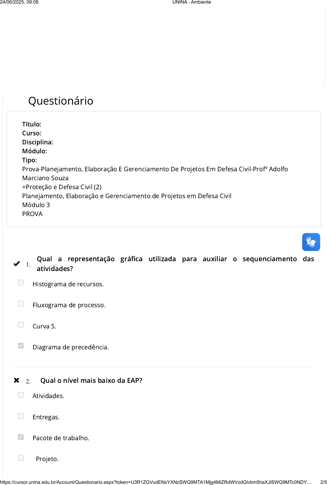 7,1 mil pessoas curtiram isso. Cadastre-se para ver do que seus amigos gostam. Curtir Questionário Qual a representação gráfica utilizada para auxiliar o sequenciamento das atividades? Histograma de recursos. Fluxograma de processo. Curva S. Diagrama de precedência. Qual o nível mais baixo da EAP? Atividades. Entregas. Pacote de trabalho. Projeto. Título: Curso: Disciplina: Módulo: Tipo: Prova-Planejamento, Elaboração E Gerenciamento De Projetos Em Defesa Civil-Profº Adolfo Marciano Souza +Proteção e Defesa Civil (2) Planejamento, Elaboração e Gerenciamento de Projetos em Defesa Civil Módulo 3 PROVA 1. 2. 24/06/2025, 09:08 UNINA - Ambiente https://cursor.unina.edu.br/Account/Questionario.aspx?token=U3R1ZGVudENsYXNzSWQ9MTA1Mjg4MiZRdWVzdGlvbm5haXJlSWQ9MTc0NDY… 2/5 https://www.facebook.com/ad_campaign/landing.php?campaign_id=137675572948107&partner_id=cursor.unina.edu.br&placement=like_plugin&extra_1=https%3A%2F%2Fcursor.unina.edu.br%2F&extra_2=BR Quantos tipos de relação de precedência existem? 1 2 4 3 Qual a finalidade da coleta de requisitos: Relacionar o papel de cada integrante no projeto. Buscar recursos e definir forma de trabalho para o projeto. Documentar as necessidades e expectativas das partes interessadas. Definir as características do projeto. Em qual dos seguintes documentos, é realizada a identificação e definidas as das atividades do projeto? Declaração de escopo. Orçamento. Cronograma. Termo de abertura. O que é a EAP?: É a estrutura analítica do projeto. É a estimativa analítica do projeto. É a equipe de atendimento do projeto. É a elaboração análoga do produto. O controle do escopo é utilizado para: 3. 4. 5. 6. 7. 24/06/2025, 09:08 UNINA - Ambiente https://cursor.unina.edu.br/Account/Questionario.aspx?token=U3R1ZGVudENsYXNzSWQ9MTA1Mjg4MiZRdWVzdGlvbm5haXJlSWQ9MTc0NDY… 3/5 Buscar pontos de melhoria contínua no projeto para a satisfação das partes interessadas. Focar a equipe de projeto na redução de atividades e consequentemente na redução de prazo e custo. Controlar e registrar as inevitáveis mudanças que ocorreram ao longo do projeto. Garantir que as partes interessadas participem de forma adequação das atividades do projeto. O papel principal da verificação do escopo é? Validar que todo o trabalho está sendo executado e que as entregas estão sendo aceitas conforme o planejado. Garantir que não haverá imprevistos no projeto. Verificar que as atividades estão dentro do previsto e que não haverá atrasos no projeto. Verificar o se o cronograma não possui atrasos e que o custo do projeto está no limite aceitável. Qual a finalidade dos LEADs e LAGs? Atrasar o término das atividades. Corrigir as durações das atividades. Antecipar o início das atividades. Ajustar a precisão do relacionamento das atividades. O que a declaração de escopo? É o documento que define os recursos necessários para que seja entregue pelo projeto. É o documento que define o trabalho a ser realizado para se obter as entregas a serem realizadas. É o documento que define e registra o início do projeto. É o documento que define e demonstra o prazo, custo e os riscos do projeto. 8. 9. 10. 24/06/2025, 09:08 UNINA - Ambiente https://cursor.unina.edu.br/Account/Questionario.aspx?token=U3R1ZGVudENsYXNzSWQ9MTA1Mjg4MiZRdWVzdGlvbm5haXJlSWQ9MTc0NDY… 4/5 UNINA Copyright © 2011 - 2025. Todos direitos reservados. 24/06/2025, 09:08 UNINA - Ambiente https://cursor.unina.edu.br/Account/Questionario.aspx?token=U3R1ZGVudENsYXNzSWQ9MTA1Mjg4MiZRdWVzdGlvbm5haXJlSWQ9MTc0NDY… 5/5