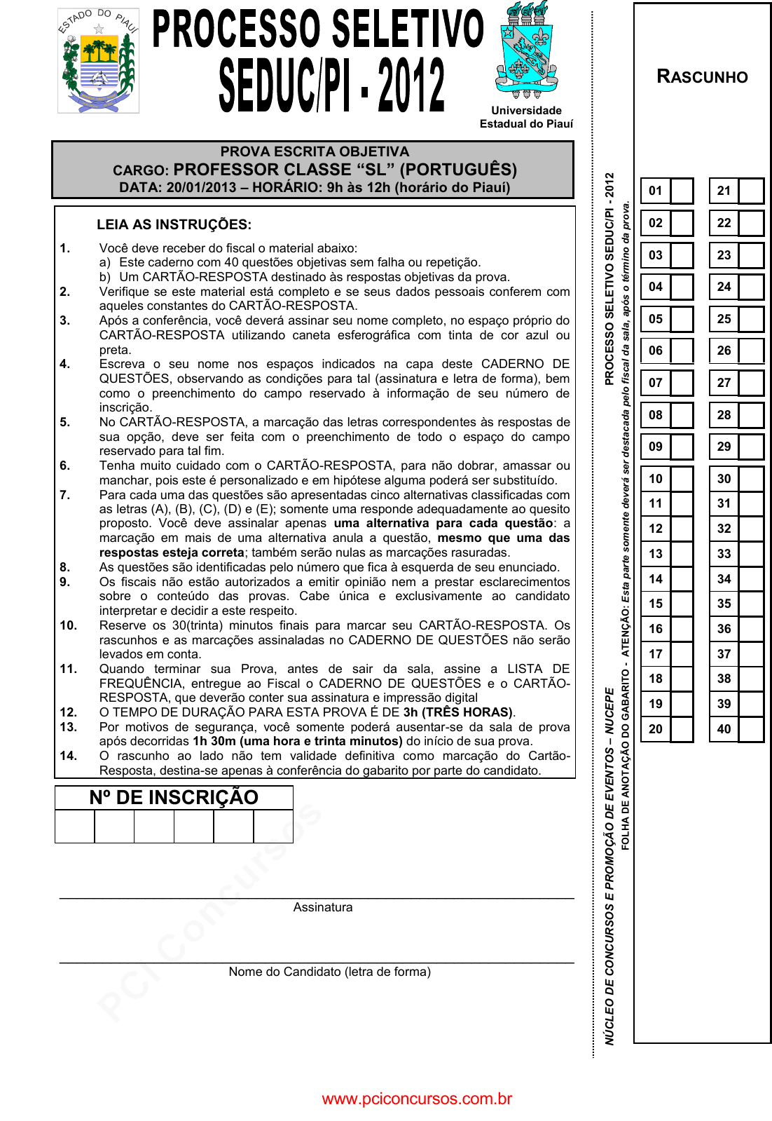 pcimarkpci MDAwMDowMDAwOjAwMDA6MDAwMDowMDAwOmZmZmY6OTU0ZTpiOWI2:U3VuLCAyMiBKdW4gMjAyNSAxNDo1MzoyMiAtMDMwMA== www.pciconcursos.com.br PROVA ESCRITA OBJETIVA CARGO: PROFESSOR CLASSE “SL” (PORTUGUÊS) DATA: 20/01/2013 – HORÁRIO: 9h às 12h (horário do Piauí) LEIA AS INSTRUÇÕES: 1. Você deve receber do fiscal o material abaixo: a) Este caderno com 40 questões objetivas sem falha ou repetição. b) Um CARTÃO-RESPOSTA destinado às respostas objetivas da prova. 2. Verifique se este material está completo e se seus dados pessoais conferem com aqueles constantes do CARTÃO-RESPOSTA. 3. Após a conferência, você deverá assinar seu nome completo, no espaço próprio do CARTÃO-RESPOSTA utilizando caneta esferográfica com tinta de cor azul ou preta. 4. Escreva o seu nome nos espaços indicados na capa deste CADERNO DE QUESTÕES, observando as condições para tal (assinatura e letra de forma), bem como o preenchimento do campo reservado à informação de seu número de inscrição. 5. No CARTÃO-RESPOSTA, a marcação das letras correspondentes às respostas de sua opção, deve ser feita com o preenchimento de todo o espaço do campo reservado para tal fim. 6. Tenha muito cuidado com o CARTÃO-RESPOSTA, para não dobrar, amassar ou manchar, pois este é personalizado e em hipótese alguma poderá ser substituído. 7. Para cada uma das questões são apresentadas cinco alternativas classificadas com as letras (A), (B), (C), (D) e (E); somente uma responde adequadamente ao quesito proposto. Você deve assinalar apenas uma alternativa para cada questão: a marcação em mais de uma alternativa anula a questão, mesmo que uma das respostas esteja correta; também serão nulas as marcações rasuradas. 8. As questões são identificadas pelo número que fica à esquerda de seu enunciado. 9. Os fiscais não estão autorizados a emitir opinião nem a prestar esclarecimentos sobre o conteúdo das provas. Cabe única e exclusivamente ao candidato interpretar e decidir a este respeito. 10. Reserve os 30(trinta) minutos finais para marcar seu CARTÃO-RESPOSTA. Os rascunhos e as marcações assinaladas no CADERNO DE QUESTÕES não serão levados em conta. 11. Quando terminar sua Prova, antes de sair da sala, assine a LISTA DE FREQUÊNCIA, entregue ao Fiscal o CADERNO DE QUESTÕES e o CARTÃO- RESPOSTA, que deverão conter sua assinatura e impressão digital 12. O TEMPO DE DURAÇÃO PARA ESTA PROVA É DE 3h (TRÊS HORAS). 13. Por motivos de segurança, você somente poderá ausentar-se da sala de prova após decorridas 1h 30m (uma hora e trinta minutos) do início de sua prova. 14. O rascunho ao lado não tem validade definitiva como marcação do Cartão- Resposta, destina-se apenas à conferência do gabarito por parte do candidato. Nº DE INSCRIÇÃO ____________________________________________________________ Assinatura ____________________________________________________________ Nome do Candidato (letra de forma) Universidade Estadual do Piauí RASCUNHO 01 21 02 22 03 23 04 24 05 25 06 26 07 27 08 28 09 29 10 30 11 31 12 32 13 33 14 34 15 35 16 36 17 37 18 38 19 39 20 40 N Ú C L E O D E C O N C U R S O S E P R O M O Ç Ã O D E E V E N T O S – N U C E P E P R O C E S S O S E L E T IV O S E D U C /P I - 2 0 1 2 F O L H A D E A N O T A Ç Ã O D O G A B A R IT O - A T E N Ç Ã O : E s ta p a rt e s o m e n te d e v e rá s e r d e s ta c a d a p e lo f is c a l d a s a la , a p ó s o t é rm in o d a p ro v a . www.pciconcursos.com.br pcimarkpci MDAwMDowMDAwOjAwMDA6MDAwMDowMDAwOmZmZmY6OTU0ZTpiOWI2:U3VuLCAyMiBKdW4gMjAyNSAxNDo1MzoyMiAtMDMwMA== www.pciconcursos.com.br N º D E I N S C R I Ç Ã O www.pciconcursos.com.br pcimarkpci MDAwMDowMDAwOjAwMDA6MDAwMDowMDAwOmZmZmY6OTU0ZTpiOWI2:U3VuLCAyMiBKdW4gMjAyNSAxNDo1MzoyMiAtMDMwMA== www.pciconcursos.com.br DIDÁTICA GERAL E LEGISLAÇÃO EDUCACIONAL 01. Em relação aos conteúdos curriculares do Ensino Fundamental e do Ensino Médio, a Lei de Diretrizes e Bases da Educação Nacional – LDB (Lei 9.394/96) prevê a) uma base nacional comum, a ser complementada por uma parte diversificada; b) a obrigatoriedade do estudo da história e da cultura afro- brasileira e indígena; c) a difusão de valores fundamentais ao interesse social, aos direitos e deveres do cidadão; d) exigência de qualificação profissional; e) promoção do desporto educacional e apoio às práticas desportivas não-formais. É correto o que se afirma, APENAS, em a) I, III, IV e V. b) I, II e III. c) I, II, III e V. d) II, IV, e V. e) III, IV e V. 02. A LDB, (Lei 9.394/96), introduziu uma mudança no conceito de avaliação, seus procedimentos e soluções para atendimento dos alunos do Ensino Fundamental. Essa lei indica uma avaliação a) somativa, com recuperação prevista ao final do ano; b) semestral, com recuperação final de cada semestre; c) seletiva, com formação de turma de alunos com dificuldades a serem trabalhadas; d) contínua, com estudos de recuperação paralela ao período letivo; e) mensal, prevendo segunda chamada de prova para alunos com média abaixo previsto. 03. O Ensino Fundamental com duração de 9 anos, (Diretrizes Curriculares Nacionais), abrange a população na faixa etária dos a) 5 aos 13 anos de idade. b) 6 aos 14 anos de idade. c) 6 aos 15 anos de idade. d) 7 aos 14 anos de idade. e) 7 aos 15 anos de idade. 04. Os Parâmetros Curriculares Nacionais inovaram propondo temas transversais, que precisam ser abordados de forma integrada aos conteúdos das disciplinas habituais. Relacione os conteúdos abordados em cada temática e associe a segunda coluna de acordo com a primeira: 1. Ética ( ) diz respeito às reflexões sobre condutas. 2. Meio ambiente ( ) essa rede entrelaça de modo intenso e envolve conjunto de seres vivos e elementos físicos. 3 Saúde ( ) visa propiciar aos jovens a possibilidade do exercício de sua sexualidade de forma responsável e prazerosa. 4. Pluralidade ( ) reflete a maneira como as Cultural pessoas vivem,