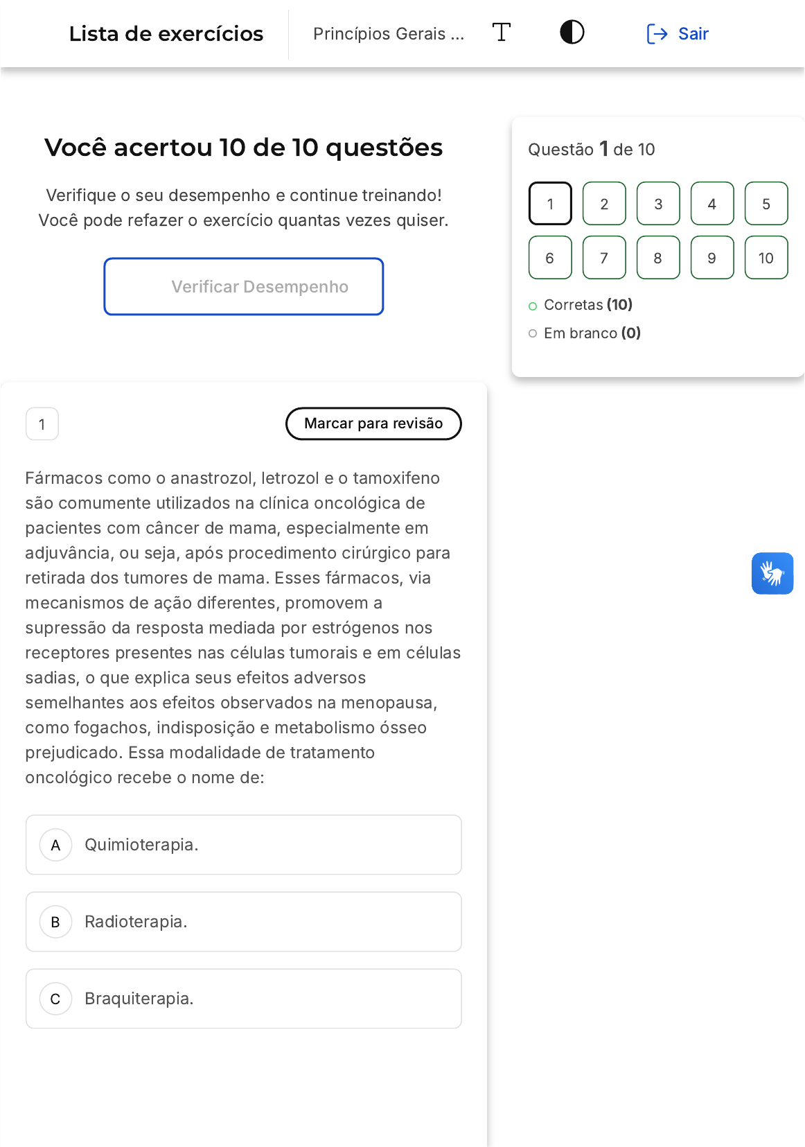 Você acertou 10 de 10 questões Verifique o seu desempenho e continue treinando! Você pode refazer o exercício quantas vezes quiser. Verificar Desempenho A B C 1 Marcar para revisão Fármacos como o anastrozol, letrozol e o tamoxifeno são comumente utilizados na clínica oncológica de pacientes com câncer de mama, especialmente em adjuvância, ou seja, após procedimento cirúrgico para retirada dos tumores de mama. Esses fármacos, via mecanismos de ação diferentes, promovem a supressão da resposta mediada por estrógenos nos receptores presentes nas células tumorais e em células sadias, o que explica seus efeitos adversos semelhantes aos efeitos observados na menopausa, como fogachos, indisposição e metabolismo ósseo prejudicado. Essa modalidade de tratamento oncológico recebe o nome de: Quimioterapia. Radioterapia. Braquiterapia. Questão 1 de 10 Corretas (10) Em branco (0) 1 2 3 4 5 6 7 8 9 10 Lista de exercícios Princípios Gerais … Sair D E Cintilografia. Hormonioterapia. Resposta correta Parabéns, você selecionou a alternativa correta. Confira o gabarito comentado! Gabarito Comentado Alguns tumores, como os tumores de mama e tumores ginecológicos, apresentam expressão aumentada de receptores hormonais em sua superfície. Quando estimulados, esses receptores levam a um aumento da atividade proliferativa. Neste sentido, a hormonioterapia é uma abordagem eficaz de tratamento pois promove o bloqueio do estímulo hormonal, reduzindo a proliferação tumoral. As demais alternativas apresentam modalidades de tratamento e modalidade diagnóstica. 2 Marcar para revisão Alguns tipos de linfomas possuem associação com as infecções pelo Epstein-Barr (EBV). Dentre esses linfomas se destaca o linfoma de Burkitt, que pode ser considerado um linfoma oportunista, comumente associado à imunodeficiência. Esta relação existente entre as a fisiopatologia da exposição ao EBV e o desenvolvimento de tumores classificam as infecções, no contexto da oncogênese, como: A B C D E Fatores de risco. Tratamento. Prognóstico. Sequela. Sintoma. Resposta correta Parabéns, você selecionou a alternativa correta. Confira o gabarito comentado! Gabarito Comentado A identificação de fatores de risco é importante para definição de políticas públicas e estratégias que minimizem o desenvolvimento de novos casos de câncer. Atualmente, já conhecemos muitos outros fatores de risco que estão relacionados ao desenvolvimento de tumores, como as infecções virais e hábitos como tabagismo e etilismo. As demais alternativas apresentam outras características tumorais não relacionadas à oncogênese. 3 Marcar para revisão Em maio de 2013, a atriz estadunidense Angelina Jolie revelou aos jornais que possuía mutação no gene BRCA1, que implica em risco aumentado (cerca de 87%) para o desenvolvimento de câncer de mama. Por esse motivo, e em razão dos casos de câncer de mama em sua família, a atriz decidiu passar por A B C D E cirurgia de mastectomia bilateral, onde a remoção profilática das mamas reduz as chances de desenvolvimento da doença para cerca de 5%. Sobre essa problemática, analise as afirmativas: I - O câncer de mama feminino é o tipo de câncer que mais acomete mulheres no Brasil, diferente do observado nos achados epidemiológicos mundiais. II - O câncer de mama feminino é o tipo de câncer que mais acomete mulheres no Brasil e no mundo. III - A epidemiologia é a ciência da saúde que estuda, entre muitas outras atribuições, as taxas de incidência e prevalência das doenças nas populações. IV - A epidemiologia é fundamental para orientar os serviços de saúde na alocação de recursos para enfrentamento das mais diversas patologias. São corretas as afirmativas: I, II e III, apenas. I, II e IV, apenas. II e IV, apenas. II, III e IV, apenas. III e IV, apenas. Resposta correta Parabéns, você selecionou a alternativa correta. Confira o gabarito comentado! Gabarito Comentado A epidemiologia é uma ciência importantíssima que orienta muitas outras áreas da saúde, seja na indicação e elaboração de estratégias, seja na alocação de recursos para tratamento das mais A B diferentes condições. Sobre o câncer, os dados epidemiológicos apontam os tumores de mama feminino como os mais incidentes no Brasil e no mundo, bem como apontam os tumores de próstata como o segundo tipo de câncer mais incidente na população brasileira. Com isso, apenas a afirmativa I está incorreta. 4 Marcar para revisão A reportagem publicada em 15/11/2022 pelo site Gshow, intitulada “Ana Maria Braga passa por cirurgia vascular para tratar sequela da radioterapia”, apresenta um efeito adverso do tratamento radioterápico que a apresentadora passou para tratamento de um tumor colorretal em 2001. Sobre a problemática, leia as assertivas abaixo: Fonte: https://gshow.globo.com/tudo-mais/tv-e- famosos/noticia/ana-maria-braga-passa-por-cirurgia- vascular-e-se-recupera-em-casa.ghtml Acesso em 02/05/2023. Assertiva I – Em linhas gerais, a radioterapia é uma modalidade terapêuticas que utiliza a radiação ionizante com a intenção de provocar danos irreversíveis às células tumorais. Assertiva II – A maior parte das toxicidades da radioterapia é proveniente do efeito da radiação ionizante nas células sadias. Sobre as assertivas, é possível inferir que: Ambas são falsas, não possuindo relação entre si. Ambas são verdadeiras, entretanto, não possuem relação entre si. C D E A B Ambas as assertivas são verdadeiras, onde a assertiva I justifica a assertiva II. Apenas a assertiva I é verdadeira. Apenas a assertiva II é verdadeira. Resposta correta Parabéns, você selecionou a alternativa correta. Confira o gabarito comentado! Gabarito Comentado Ambas as assertivas são verdadeiras, sendo o tratamento radioterápico bastante controlado em razão dos potenciais riscos da irradiação de tecidos sadios. 5 Marcar para revisão O câncer de mama fem