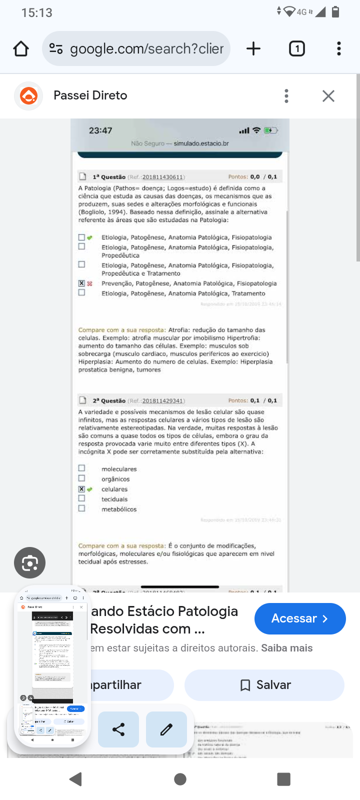 15:13 4G + 1 Passei Direto X 23:47 Não Seguro Questão (Ref. Pontos: 0,0 / 0,1 A Patologia (Pathos= doença; Logos=estudo) é definida como a ciência que estuda as causas das doenças, os mecanismos que as produzem, suas sedes e alterações morfológicas e funcionais (Bogliolo, 1994). Baseado nessa definição, assinale a alternativa referente às áreas que são estudadas na Patologia: Etiologia, Patogênese, Anatomia Patológica, Fisiopatologia Etiologia, Patogênese, Anatomia Patológica, Fisiopatologia, Propedêutica Etiologia, Patogênese, Anatomia Patológica, Fisiopatologia, Propedêutica e Tratamento Prevenção, Patogênese, Anatomia Patológica, Fisiopatologia Etiologia, Patogênese, Anatomia Patológica, Tratamento Respondido 23 Compare com a sua resposta: Atrofia: redução do tamanho das celulas. Exemplo: atrofia muscular por imobilismo Hipertrofia: aumento do tamanho das células. Exemplo: musculos sob sobrecarga (musculo cardiaco, musculos perifericos ao exercicio) Hiperplasia: Aumento do numero de celulas. Exemplo: Hiperplasia prostatica benigna, tumores Questão (Ref. Pontos: 0,1 / 0,1 A variedade e possiveis mecanismos de lesão celular são quase infinitos, mas as respostas celulares a vários tipos de lesão são relativamente estereotipadas. Na verdade, muitas respostas à lesão são comuns a quase todos os tipos de células, embora grau da resposta provocada varie muito entre diferentes tipos (X). A incógnita X pode ser corretamente substituida pela alternativa: moleculares orgânicos celulares teciduais metabólicos 15/10/2019 Compare com a sua resposta: conjunto de modificações, morfológicas, moleculares e/ou fisiológicas que aparecem em nivel tecidual após + ando Estácio Patologia Acessar Resolvidas com ... em estar sujeitas a direitos autorais. Saiba mais - partilhar Salvar