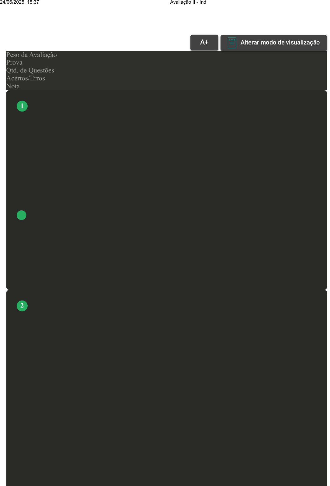 Prova Impressa GABARITO | Avaliação II - Individual (Cod.:1018091) Peso da Avaliação 2,00 Prova 96095412 Qtd. de Questões 10 Acertos/Erros 9/1 Nota 9,00 As rotinas fornecem as centenas de regras tácitas de que as empresas precisam para funcionar. Elas permitem que os funcionários experimentem novas ideias sem ter que pedir permissão a cada passo. [...] Sem eles (os hábitos), a formulação e implementação de políticas ficaria perdida numa selva de detalhes. [...] Rotinas criam tréguas que permitem que o trabalho seja feito. Fonte: DUHIGG, C. O poder do hábito: por que fazemos o que fazemos na vida e nos negócios. Rio de Janeiro: Objetiva, 2012. p. 219. Com base nas informações apresentadas, avalie as asserções a seguir e a relação proposta entre elas: I. Rotinas são ineficazes para o funcionamento dos processos das organizações corporativas. PORQUE II. Elas inibem que os colaboradores testem novas ideias, esses têm que solicitar autorização a cada novo passo. A respeito dessas asserções, assinale a opção correta: A As asserções I e II são falsas. B As asserções I e II são verdadeiras, mas a II não é uma justificativa correta da I. C As asserções I e II são verdadeiras, e a II é uma justificativa correta da I. D A asserção I é uma proposição falsa, e a II é uma proposição verdadeira. À medida que a tecnologia avança e os mercados se adaptam às novas demandas da globalização, podemos afirmar que o modo de trabalhar já está diferente. Os profissionais mais adiantados já entenderam o quanto apostar na trabalhabilidade é mais urgente para se manter com empregabilidade. Assim, partem para novas maneiras de identificar demandas e qualificar entregas. Fonte: BULHÕES, D. M. S.; LEITE, E. F. Trabalhabilidade: o caminho para o empreendedorismo. International Journal of Professional Business Review, [s. l.], v. 1, n. 1, 2016. Disponível em: https://www.researchgate.net/publication/325631276_Trabalhabilidade_o_caminho_para_o_empreendedorismo. Acesso em: 19 fev. 2024. Sobre a nova economia na indústria 4.0, analise as afirmativas a seguir: I. A trabalhabilidade contém empregabilidade. II. A empregabilidade contém trabalhabilidade. III. As competências técnicas referem-se à capacidade da pessoa se manter no emprego. IV. A empregabilidade refere-se à capacidade das pessoas em conseguir outro emprego. Trabalhabilidade é a capacidade de renovação e técnicas. É correto o que se afirma em: A III e IV, apenas. B I, II e III, apenas. C I, II, III e IV. VOLTAR A+ Alterar modo de visualização 1 2 24/06/2025, 15:37 Avaliação II - Individual about:blank 1/5 D II e IV, apenas. É importante destacar separadamente as contribuições de Paul Ekman e seus colaboradores no campo das emoções. Entre outros aspectos, eles foram responsáveis por evidenciar a universalidade de expressões faciais da emoção (Ekman; Friesen, 1971) e pelo desenvolvimento/atualização do FACS (Ekman; Friesen, 1978; Ekman et al., 2002), o instrumento mais utilizado para a mensuração do comportamento facial humano. Fonte: adaptado de: BORGES, V. F. Reconhecimento de expressões faciais de emoções básicas por pacientes com depressão psicótica e controles saudáveis com e sem história de estresse precoce. 2018. Tese (Doutorado em Saúde Mental) - Faculdade de Medicina de Ribeirão Preto, Universidade de São Paulo, Ribeirão Preto, 2018. As emoções geram reflexos no corpo e especialmente no rosto humano. Considerando que as emoções são traduzidas em expressões faciais, sobre as descrições relacionadas à emoção da raiva, analise as opções a seguir: I. Olhar duro. II. Pálpebras superiores e inferiores tensionadas. III. Sobrancelhas abaixadas e aproximadas entre si. IV. Aparecimento de linhas verticais entre as sobrancelhas. É correto o que se afirma em: A II e IV, apenas. B I, II, III e IV. C III e IV, apenas. D I, II e III, apenas. Empreender na carreira significa “escrever a sua própria história profissional”. A necessidade de empreender na carreira passa por um processo de autoconhecimento. Durante esse processo, é possível indicar motivadores que fazem com que se siga pelo caminho do “empreendedorismo”. Fonte: adaptado de: DEGEN, R. J. O empreendedor: empreender como opção de carreira. São Paulo: Prentice Hall, 2009. Sobre os motivadores que levam as pessoas a empreender, analise as afirmativas a seguir: I. A vontade de ganhar muito dinheiro (mais do que ser empregado). II. O desejo de sair da rotina do emprego, a vontade de determinar seu futuro. III. A necessidade de provar a si e aos outros a capacidade de realizar um empreendimento. IV. O desejo de desenvolver algo que traga reconhecimento e benefícios exclusivamente para a sociedade. É correto o que se afirma em: A I e IV, apenas. B I, II e III, apenas. C II e III, apenas. D II, III e IV, apenas. 3 4 24/06/2025, 15:37 Avaliação II - Individual about:blank 2/5 Todo profissional, seja qual for a sua formação, precisa pensar na gestão da sua marca pessoal, não importa o segmento de atuação. Uma das formas de vencer os obstáculos que irá enfrentar ao longo do caminho é entender o seu propósito de vida e principalmente ter escolhido a profissão que o faça feliz. Fonte: AURIANI, M. Branding Pessoal: como gerenciar sua marca pessoal num mercado cada vez mais competitivo? Revista EBS, São Paulo, 2023. Disponível em: https://www.revistaebs.com.br/artigos/branding-pessoal-como-gerenciar-sua-marca-pessoal/. Acesso em 19 fev. 2024. A partir do contexto apresentado, sobre a marca pessoal, analise as afirmativas a seguir: I. A marca pessoal é um recurso que auxilia o profissional a se tornar relevante para o mercado. II. A marca pessoal diz respeito à pessoa, ao seu nome e através de como essa pessoa é representada. III. A marca pessoal pode ser definida como a imagem que de forma transparente e pública nos caracteriza. É correto o que se afirma em: A II e III,