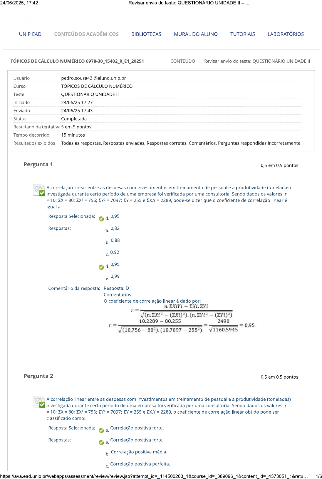 24/06/2025, 17:42 Revisar envio do teste: QUESTIONÁRIO UNIDADE UNIP EAD CONTEÚDOS ACADÊMICOS BIBLIOTECAS MURAL DO ALUNO TUTORIAIS LABORATÓRIOS TÓPICOS DE CÁLCULO NUMÉRICO 6978-30_15402_R_E1_20251 CONTEÚDO Revisar envio do teste: QUESTIONÁRIO UNIDADE Usuário pedro.sousa43 @aluno.unip.br Curso TÓPICOS DE CÁLCULO NUMÉRICO Teste QUESTIONÁRIO UNIDADE Iniciado 24/06/25 17:27 Enviado 24/06/25 17:43 Status Completada Resultado da tentativa 5 em 5 pontos Tempo decorrido 15 minutos Resultados exibidos Todas as respostas, Respostas enviadas, Respostas corretas, Comentários, Perguntas respondidas incorretamente Pergunta 1 0,5 em 0,5 pontos A correlação linear entre as despesas com investimentos em treinamento de pessoal e a produtividade (toneladas) investigada durante certo período de uma empresa foi verificada por uma consultoria. Sendo dados os valores: n = 10; = 80; = 756; = 7097; = 255 e EX.Y = 2289, pode-se dizer que coeficiente de correlação linear é igual a: Resposta Selecionada: d. 0,95 Respostas: a. 0,82 b. 0,88 0,92 d. 0,95 0,99 e. Comentário da resposta: Resposta: D Comentários: coeficiente de correlação linear é dado por: n. EXiYi EXi.EYi 10.2289 80.255 2490 r = 0,95 (10.7097 Pergunta 2 0,5 em 0,5 pontos A correlação linear entre as despesas com investimentos em treinamento de pessoal e a produtividade (toneladas) investigada durante certo período de uma empresa foi verificada por uma consultoria. Sendo dados os valores: n = 10; 80; 756; = 7097; 255 e EX.Y = 2289, coeficiente de correlação linear obtido pode ser classificado como: Resposta Selecionada: Correlação positiva forte. a. Respostas: Correlação positiva forte. a. b. Correlação positiva média. Correlação positiva perfeita. 1/624/06/2025, 17:42 Revisar envio do teste: QUESTIONÁRIO UNIDADE d. Correlação negativa fraca. e. Correlação negativa forte. Comentário da resposta: Resposta: A Comentários: coeficiente de correlação linear é dado por: n. EXiYi - EXi.EYi r 10.2289 80.255 2490 r = 0,95 (10.7097 Para r=0,95, temos uma correlação positiva forte. Pergunta 3 0,5 em 0,5 pontos A correlação linear entre as despesas com investimentos em treinamento de pessoal e a produtividade (toneladas) investigada durante certo período de uma empresa foi verificada por uma consultoria. Sendo dados os valores: n = 10; 80; 756; = 7097; = 255 e EX.Y = 2289, pode-se dizer que a equação de regressão linear é: Resposta Selecionada: Respostas: Comentário da Resposta: A resposta: Comentários: Equação da reta de regressão: y a + bx. Cálculo da inclinação da reta: b. 80.255 2289 b 10 2,15 80² 756 10 Cálculo das médias 80 255 25,5 10 10 Equação da reta: y=8,3+2,15.x Pergunta 4 0,5 em 0,5 pontos Assinale a alternativa falsa a respeito da classificação de uma correlação linear: Resposta Selecionada: d. Se 0,90, temos uma Correlação positiva fraca. Respostas: Se = 1,00, temos uma Correlação positiva perfeita. a. b. Se 0,75, temos uma Correlação positiva forte. Se 0,50, temos uma Correlação positiva média. C. d. Se 0,90, temos uma Correlação positiva fraca. Se 0,25, temos uma Correlação positiva fraca. e. 2/624/06/2025, 17:42 Revisar envio do teste: QUESTIONÁRIO UNIDADE Comentário da Resposta: D resposta: Comentários: Para r=0,90, teremos uma correlação positiva forte. Logo, a única alternativa falsa é a alternativa D. Pergunta 5 0,5 em 0,5 pontos Considerando a classificação de uma correlação linear, assinale a alternativa correta: Resposta Selecionada: Se r - 1,00, temos uma Correlação negativa perfeita. a. Respostas: Se r 1,00, temos uma Correlação negativa perfeita. a. b. Se 0,75, temos uma Correlação positiva fraca. Se 0,50, temos uma Correlação inexistente. d. Se 0,25, temos uma Correlação positiva forte. e. Se 1,00, temos uma Correlação linear inexistente. Comentário da Resposta: A resposta: Comentários: Para teremos uma correlação negativa perfeita. Logo, a única alternativa correta é a alternativa Pergunta 6 0,5 em 0,5 pontos Considere o conjunto de dados da tabela, referente a tempo de trabalho (x), em anos, e expectativa de salário (y), em salários mínimos, em uma carreira: xi 2 4 7 10 13 yi 2,5 3,8 8,1 9,6 14,3 A reta de regressão linear é: Resposta Selecionada: 1,054 - 0,071 a. Respostas: 1,054 - 0,071 a. b. 1,123 - 0,089 C. y = -1,123 0,089 d. y 0,071 1,054 e. Comentário Resposta: A da Comentário: Elaboramos a tabela abaixo para facilitar os cálculos: resposta: xi yi xi.yi 2 2,5 = 6,25 2.2,5 = 4 3,8 16 = 14,44 4.3,8 = 15,2 7 8,1 = 65,61 7.8,1 56,7 10 9,6 100 = 92,16 10.9,6 = 96 13 14,3 13² 169 = 204,49 13.14,3 185,9 36 Σyi 38,3 = 338 382,95 = 358,8 3/624/06/2025, 17:42 Revisar envio do teste: QUESTIONÁRIO UNIDADE - Cálculo da reta de regressão linear: n 5 83,04 b = = 338 5 Exi n 36 5 5 a = 0,071 Assim: 1,054 0,071 Pergunta 7 0,5 em 0,5 pontos Considere conjunto de dados da tabela, referente a tempo de trabalho (x), em anos, e expectativa de salário (y), em salários mínimos, em uma carreira: xi 2 4 7 10 13 yi 2,5 3,8 8,1 9,6 14,3 coeficiente de correlação linear é: Resposta Selecionada: 0,988 e. Respostas: a. 0,876 b. 0,899 0,923 d. 0,956 0,988 e. Comentário Resposta: E da Comentário: resposta: Completando a tabela, teremos: xi yi xi.yi 2 2,5 4 6,25 2.2,5 = 4 3,8 16 = 14,44 4.3,8 = 15,2 7 8,1 = 65,61 7.8,1 = 56,7 10 9,6 100 = 92,16 10.9,6 96 13 14,3 = 169 = 204,49 13.14,3 = 185,9 36 Σyi 38,3 = 338 = 382,95 = 358,8 coeficiente de correlação linear é dado por: n. EXiYi EXi.EYi 5.358,8 - 36.38,3 415,2 415,2 r = = 0,988 (5.382,95 /394.447,86 420,07 Pergunta 8 0,5 em 0,5 pontos De acordo com coeficiente de correlação linear obtido pelos dados da tabela abaixo, pode-se classificar essa correlação como: 4/624/06/2025, 17:42 Revisar envio do teste: QUESTIONÁRIO UNIDADE Xi Yi 0 0 2 4 3 6 5 10 6 12 Resposta Selecionada: Correlação positiva perfeita. Respostas: a. Correlação positiva forte. b. Correlação posi