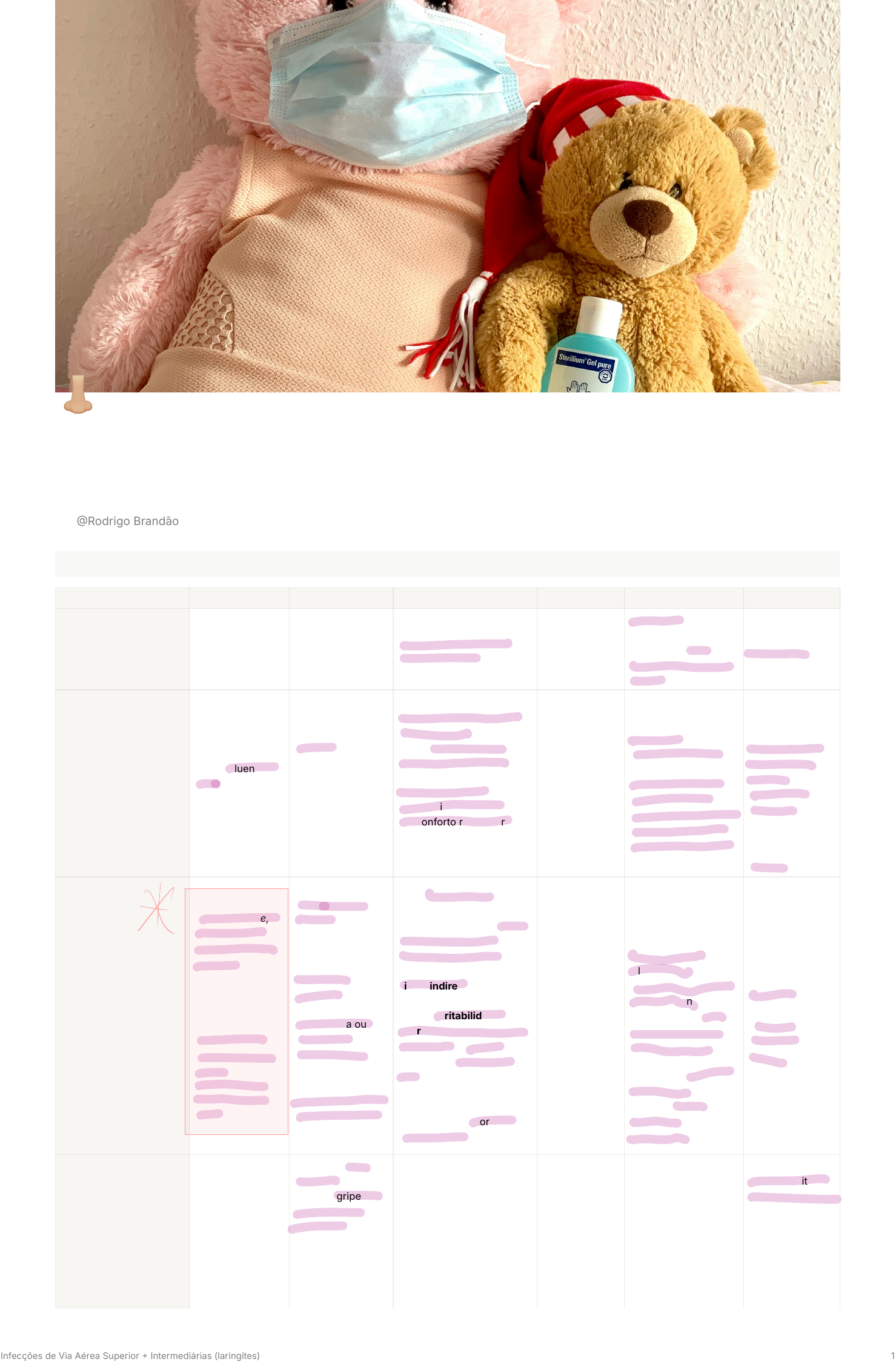 Infecções de Via Aérea Superior + Intermediárias (laringites) por Resumo Condição Etiologia Epidemiologia Quadro Clínico Diagnóstico Tratamento Complicações Resfriado Comum Rinovírus, coronavírus, adenovírus Frequente em todas as idades, mais comum em crianças Congestão nasal, coriza, tosse, febre baixa Clínico Sintomático (analgésicos, hidratação) NÃO USAR AAS Síndrome de Reye Sinusite, otite Gripe (influenza) Vírus Influenza A ou B (família Orthomyxoviridae) Sazonal: outono/inverno- Alta transmissibilidade- Crianças: grupo de maior risco Febre alta de início súbito- Mialgia, cefaleia- Tosse seca, dor de garganta- Prostração, inapetência- Em crianças pequenas: pode haver vômitos, diarreia, irritabilidade e desconforto respiratório Clínico, na maioria dos casos Testes rápidos de antígeno (disponíveis) RTPCR (padrão-ouro, se necessário) Sintomático: antitérmicos, hidratação, repouso Antiviral (oseltamivir/tamiflu) nas primeiras 48h, especialmente em 5 anos, comorbidades ou sinais de gravidade Otite média aguda Sinusite bacteriana Pneumonia viral ou bacteriana secundária Miocardite, encefalite (raros) Síndrome respiratória aguda grave SRAG*) Otite Média Aguda S. pneumoniae, H. influenzae não tipável, Moraxella catarrhalis. —Em neonatos e lactentes jovens que estão hospitalizados: Streptococcus do grupo A, Staphylococcus aureus e outras GRAM Mais comum em 2 anos, Sexo masculino, preponderante em brancos, aleitamento artificial, tabagismo passivo, exposição a outras crianças em creches e escolas, ausência de vacinas antipneumocócicas e anti-influenza. Imunodeficiências. 2A dor de ouvido (otalgia) pela própria criança, associada a febre, astenia, inapetência e hipoacusia flutuante. 2A podem apresentar sinais indiretos de otalgia, como: levar a mão até o ouvido, irritabilidade, choro intenso, dificuldade para dormir. A febre da OMA pode ser baixa ou alta. Crianças menores também podem apresentar sintomas gastrointestinais inespecíficos (anorexia, náuseas e vômitos). Otorreia não provocada por otite externa Sinais de efusão da orelha média + sinais de inflamação). À otoscopia, membrana timpânica hiperemiada, convexa e abaulada, de coloração alterada e com perda de mobilidade. OMA c/ otorreia: ATB. —— OMA c/ sintomas graves: ATB. ——————— OMA s/ otorreia bilateral: ATB mandatório só entre 6 meses a 2 anos. —— OMA s/ otorreia unilateral: ATB ou observação. ……………………….ATBs: 1ª escolha) amoxicilina ou ceftriaxona. 2ª escolha) Cefdinir, cefuroxima, cefpodoxima Perfuração timpânica; Otite Média secretora; Mastoidite; Infecção de SNC (meningite, abscesso subdural); Otite Média Crônica; Colesteatomatosa Sinusite Aguda Vírus, S. pneumoniae, H. influenzae não tipável, M. catarrhalis. ——————— Sinusite subaguda prolongada e na crônica: Frequente após IVAS viral (a famosa “gripe mal curada ,ˮ “gripe arrastadaˮ). Para bacterianas: Rinite alérgica (segunda causa); Exposição à fumaça de Dor facial, cefaleia, secreção nasal purulenta Clínico, TC em casos graves Sintomático, ATB se grave: Para crianças maiores amoxicilina 4550 mg/kg/dia ou cefuroxima, cefpodoxima, cefixima ou levofloxacina, para pacientes alérgicos à Sinusite crônica, celulite orbitária, infecção do SNC Rodrigo Brandão Infecções de Via Aérea Superior Intermediárias (laringites) 1 Condição Etiologia Epidemiologia Quadro Clínico Diagnóstico Tratamento Complicações Staphylococcus coagulase negativo, S. aureus, Streptococcus alfa-hemolíticos e anaeróbios cigarro (pais fumantes); Anormalidades estruturais (ex.: desvio de septo, corpo estranho nasal. Disfunção ciliar (fibrose cística); Imunodeficiência humoral; DRGE; Tubos e sondas nasotraqueais. penicilina. Também pode ser feito amoxicilina + clavulanato na dose de 8090 mg/kg/dia para crianças 2 anos em casos específicos. Faringoamigdalite Viral Adenovírus, influenza, parainfluenza Mais comum em crianças e adolescentes Odinofagia, febre baixa, hiperemia de orofaringe Clínico Sintomático — Aciclovir parenteral se herpes- simplex em imunossupresso Sinusite, otite Faringoamigdalite Bacteriana Streptococcus pyogenes Crianças entre 5 15 anos Febre alta, exsudato amigdaliano, petéquias em palato Teste rápido, cultura de orofaringe Em até 9 dias do início dos sintomas: Penicilina [benzatina 600.000 UI (crianças com peso 20 kg ou 27 kg) a 1.200.000 UI (crianças com peso 20 kg ou 27 kg)]ou amoxicilina com clavulanato Febre reumática, glomerulonefrite Laringotraqueíte Viral (crupe viral) Parainfluenza, influenza, RSV Crianças entre 3m- 5 anos, porém a doença devido ao H. influenzae e Corynebacterium diphtheriae é mais comum entre 2A 5A IVAS durante vários dias antes de tosse "ladrante", irritativa (característica de crupe), estridor inspiratório principalmente à noite, rouquidão e agitação. Duração de 3 a 5 dias. ………………………………………. Síndrome do crupe: rouquidão + tosse metálica + estridor Clínico. Radiografia, se necessária, revela sinal da torre (estreitamento da via aérea infraglótica pelo edema inflamatório) Corticoides se leves (dexa 0,6mg/kg VO ou IM; nebulização com budesonida e epinefrina em casos mais graves. Insuficiência respiratória; Laringotraqueíte bacteriana (etiologia similar à OMA Laringotraqueobronquite Coinfecção viral e bacteriana (flora mista) Crianças de 6 meses a 3 anos Tosse ladrante, rouquidão, estridor, sibilos e tempo expiratório prolongado Clínico; pode incluir radiografia ou laringoscopia Corticoides, adrenalina nebulizada e antibióticos em casos bacterianos Pneumonia, insuficiência respiratória Epiglotite Haemophilus influenzae B HiB Rara devido à vacina. Crianças entre 2 a 5 anos. Febre alta, dor de garganta intensa, dificuldade para engolir e respirar, estridor inspiratório …………………………………