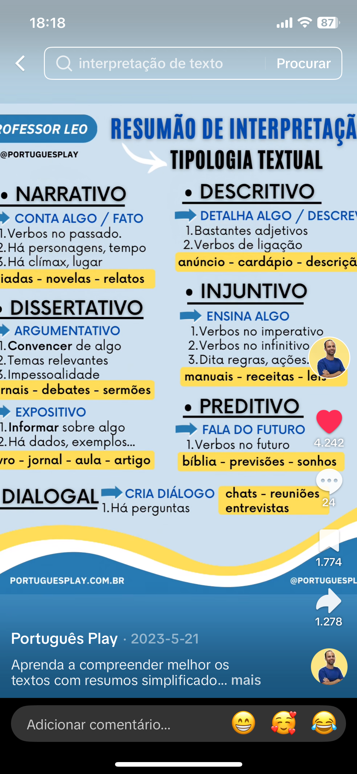 18:18 87 interpretação de texto Procurar OFESSOR LEO RESUMÃO DE @PORTUGUESPLAY TIPOLOGIA TEXTUAL NARRATIVO DESCRITIVO CONTA ALGO / FATO DETALHA ALGO / DESCRE Verbos no passado. 1. Bastantes adjetivos Há personagens, tempo 2. Verbos de ligação Há clímax, lugar anúncio - cardápio - descriçã iadas - novelas - relatos INJUNTIVO DISSERTATIVO ENSINA ALGO ARGUMENTATIVO 1. Verbos no imperativo Convencer de algo 2. Verbos no infinitivo Temas relevantes 3. Dita regras, ações. Impessoalidade manuais - receitas - rnais - debates - sermões EXPOSITIVO PREDITIVO Informar sobre algo FALA DO FUTURO Há dados, exemplos... 1.Verbos no futuro 4.242 - jornal - aula - artigo bíblia - previsões - sonhos DIALOGAL CRIA DIÁLOGO chats - reuniões 24 1.Há perguntas entrevistas 1.774 PORTUGUESPLAY.COM.BR @PORTUGUESPL 1.278 Português Play 2023-5-21 Aprenda a compreender melhor os textos com resumos simplificado... mais Adicionar comentário...