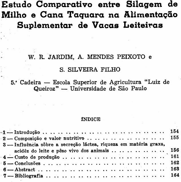 Estudo Comparativo entre Silagem de Milho e Cana Taquara na Alimentação Suplementar de Vacas Leiteiras ÍNDICE 1Introdução 154 2 — Composição e valor nutritivo 155 3 — Influência sôbre a secreção láctea, riqueza em matéria graxa, acidêz do leite e pêso vivo dos animais 156 4 —Custo de produção 161 5 — Conclusões 162 6 — Abstract . 163 7 — Bibliografia . . 164 W. H. JARDIM, A. MENDES PEIXOTO e S. SILVEIRA FILHO 5ª Cadeira — Escola Superior de Agricultura "Luiz de Queiroz" — Universidade de São Paulo 1 — INTRODUÇÃO Durante os meses de agosto, setembro e outubro de 1950, realizámos o presente ensaio, tendo por objetivo comparar a cana taquara (Saccharum sinensis, Roxb) com silagem de mi lho (Zea mays, Linn.), como suplementos volumosos na alimen tação de vacas leiteiras durante a seca. Em 1949, foi constatado (1) que, na região de Piracica ba, todos os produtores de leite localizados nas vizinhanças da cidade, utilizavam cana na alimentação suplementar de seus animais e que 37% dos produtores da zona rural lança vam mão do mesmo recurso. Nessa ocasião verificou-se a ine xistência de silos de qualquer tipo, portanto completo desinte resse pelo emprego da silagem. , Considerando as reais vantagens da utilização da silagem na alimentação do gado leiteiro, principalmente durante a seca, resolvemos compará-la com a cana de açúcar, para verificar mos se a popularidade desta na região se, apoiava em atributos vantajosos ou se era apenas resultante da tradição, aliada ao des conhecimento da silagem como alimento de bôa qualidade e fá cil obtenção. Sob um rápido exame, a cana revela algumas qualidades interessantes, tais como : a) conservar-se verde durante a épo ca de seca; b) ser de cultura fácil; c) produzir grande massa, isto é, um hectare rende em média por corte, 40 toneladas de cana forrageira ou 12 toneladas de pontas; d) constituir forra- gem verde suculenta e palatável; e) nas usinas e engenhos, as pontas são sobras e, como o corte coincide com a seca, o seu em prego na alimentação dos animais é baratíssimo. Por outro lado, a silagem, principalmente de milho, é um alimento aquoso de bôa qualidade, palatável, de fácil obtenção e que pode estar à disposição do criador em qualquer época do ano. E' especialmente indicada para vacas leiteiras, quando a forragem volumosa é um tanto pobre, como acontece em nosso meio durante a seca. Empregando-se silos simples, de constru ção barata e contando-se com uma produção média de 15 tone ladas de milho por hectare, pode-se obter este suplemento por preço razoável. Tratando-se, pois, de dois volumosos altamente convenien tes para a alimentação suplementar nos períodos de escassez de pastos, isto é, a silagem de milho, já consagrada pelos criado res norte-americanos e a cana, tão popular nas fazendas pau listas, julgamos útil confronta-los nos seguintes pontos: a) Composição e valor nutritivo; b) Influência sobre a secfeção láctea, riqueza em matéria graxa, acidez do leite e peso vivo dos animais; c) Custo de produção. 2 — COMPOSIÇÃO E VALOR NUTRITIVO Segundo análises realizadas no laboratório da 5.a cadeira pelo Dr. Celso Lemaire de Moraes, fazendo nove determinações em amostras diferentes de silagem proveniente de um silo ci líndrico subterrâneo e, doze, em amostras de cana picada, a composição média das citadas forragens, em princípios nutriti vos brutos, é a seguinte : Silagem de milho Cana taquara Umidade 77,86% 81,62% M. Seca 22,13% 18,38% Proteínas 1,1.8% 0 82% M. Graxa 0,62% 0^52% Fibras 6,55%-' .'. . . . . 4 71% E. N. Nitrog 11,86% 11,31% Cinzas 1,75% 1,02% Aplicando os coeficientes de digestibilidade dados por KOK (2) e por GORDON (3) , aos elementos orgânicos revelados pe las análises químicas, respectivamente da silagem e da cana, teremos a composição das duas forragens em nutrientes diges- tíveis e os respectivos valores nutritivos, assim : Em confronto com as análises dadas por MORRISON (4) , a silagem de milho revela baixo valor nutritivo e relação nu tritiva muito larga, o que se pode atribuir à pequena quanti dade de espigas e às perdas ocorridas durante a sua prepara ção, mas, em compensação, a cana também se apresenta um tanto pobre em matéria seca. 3 — INFLUÊNCIA SOBRE A SECREÇAO LÁCTEA, RIQUEZA EM MATÉRIA G R A X A , ACIDÊZ DO LEITE E PESO VIVO DOS ANIMAIS A influência dos suplementos volumosos, cana taquara e silagem de milho, sobre a secreção láctea, riqueza em matéria graxa e acidez do leite, e peso vivo dos animais, foi estudada através de um ensaio de alimentação iniciado a 3-8-1950, e en cerrado a 23-10-1950. a) Material e método O ensaio de alimentação foi realizado com vacas da raça Holandesa malhada de preto, pertencentes ao Posto Zootécni- co, anexo à Escola Superior de Agricultura "Luiz de Queiroz". O regime de criação empregado é o de meia estabuiação, isto é, as vacas passam as horas mais quentes do dia abriga das no estábulo, saindo apenas às 4 e 30 horas da tarde para o pasto, onde pernoitam. São recolhidas no dia seguinte às 6 o 30 horas, para a primeira ordenha, durante a qual lhes é mi nistrada uma ração de farelos (concentrados). Os animais foram separados em 2 lotes, A e B, com 6 va cas cada um. Ambos os lotes receberam a mesma ração bási ca de farelos, durante todo o decorrer do ensaio, apenas va riando o suplemento volumoso. A ração básica empregada foi calculada segundo o método aconselhado por MORRISON (4) . De acordo com o mesmo, conforme a natureza e qualidade das pastagens de que os ani mais dispõem, é estabelecida a porcentagem de proteina diges- tível a ser fornecida pela mistura de farelos. Os pastos do Pôs- to Zootécnico podem ser considerados como médios, pois são constituidos de gramíneas, principalmente capim catingueiro, e suplementados por outras gramíneas cortadas (capins jara- guá, fino, elefante, etc.) na é