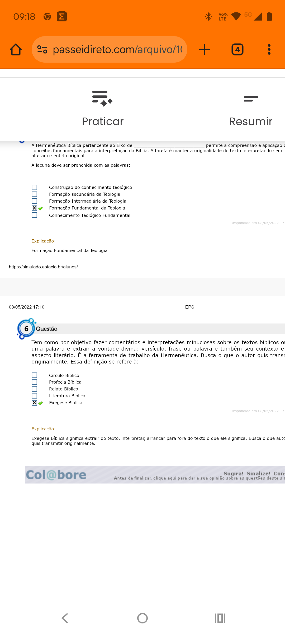 09:18 Von 5G LTE passeidireto.com/arquivo/10 + 4 Praticar Resumir A Hermenêutica Bíblica pertencente ao Eixo de permite a compreensão e aplicação conceitos fundamentais para a interpretação da Bíblia. A tarefa é manter a originalidade do texto interpretando sem alterar O sentido original. A lacuna deve ser prenchida com as palavras: Construção do conhecimento teológico Formação secundária da Teologia Formação Intermediária da Teologia Formação Fundamental da Teologia Conhecimento Teológico Fundamental Respondido em 08/05/2022 17 Explicação: Formação Fundamental da Teologia 08/05/2022 17:10 EPS 6 Questão Tem como por objetivo fazer comentários e interpretações minuciosas sobre os textos bíblicos uma palavra e extrair a vontade divina: versículo, frase ou palavra e também seu contexto e aspecto literário. É a ferramenta de trabalho da Hermenêutica. Busca que autor quis transr originalmente. Essa definição se refere à: Círculo Bíblico Profecia Bíblica Relato Bíblico Literatura Bíblica Exegese Bíblica Respondido em 08/05/2022 17 Explicação: Exegese Bíblica significa extrair do texto, interpretar, arrancar para fora do texto que ele significa. Busca que auto quis transmitir originalmente. Col@bore Sugira! Sinalize! Antes de finalizar, clique aqui para dar a sua opinião sobre as questões deste