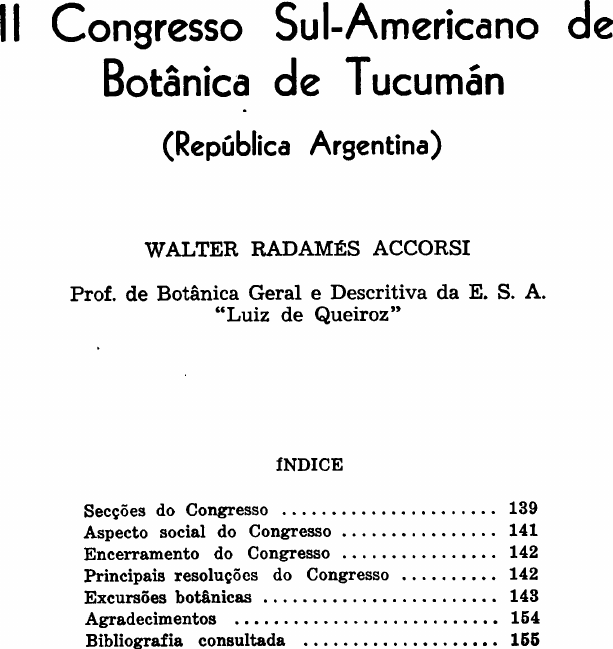 II Congresso Sul-Americano de Botânica de Tucumán (República Argent ina) WALTER RADAMÉS ACCORSI Prof. de Botânica Geral e Descritiva da E. S. A. "Luiz de Queiroz" ÍNDICE Secções do Congresso 139 Aspecto social do Congresso 141 Encerramento do Congresso 142 Principais resoluções do Congresso 142 Excursões botânicas 143 Agradecimentos 154 Bibliografia consultada 165 Como é de conhecimento geral, a la. Reunião Sul-Ameri- cana de Botânica realizou-se no período de 12 a 19 de outubro de 1938, na cidade do Rio de Janeiro, graças ao trabalho e es forços dos seus idealizadores e promotores Dr. Paulo Campos Porto, então Diretor do Instituto de Biologia Vegetal e dos professores Alberto Castellanos e Fernando Rosa Mattos, aque le do Museu de História Natural de Buenos Aires, este de Mon tevidéu. O tradicional Jardim Botânico do Rio foi escolhido pa ra o local do conclave não só porque na ocasião era uma das mais importantes instituições científicas do continente, dedicada exclusivamente a estudos dos múltiplos aspectos da flora, como também, devido 'às facilidades que oferecia aos congressistas e pelo magnífico aspecto fitogeògráfico de suas cercanias. A la. Reunião de Botânicos contou com a adesão de 256 congressistas, participando dela 20 delegações estrangeiras. Foram apresentados 130 trabalhos, abrangendo todos os ramos da Botânica. Pode-se avaliar a importância do que foi o memo rável certame, consultándo-se os três volumes que integram os seus Anais, dados à publicidade em 1938. Ao encerrar-se a la. Reunião Sul-Americana de Botânica, que adquiriu o caráter de um congresso pela magnitude dos trabalhos discutidos e pela repercussão que despertou nos meios científicos internacionais, procedeu-se à escolha da sede desti nada à realização da 2.a Reunião, escolha que, por proposta do Dr. Carlos O'Donell e aceita por aclamação, coube à cidade de Tucumán. Todavia, em conseqüência das injunções decorrentes da última guerra mundial, a instalação do II Congresso Sul- Americano de Botânica somente se tornou possível dez anos mais tarde, isto é, no período de 10 a 17 de outubro de 1948. A Comissão Organizadora do Congresso esteve constituída dos seguintes membros : Prof. Dr. Horacio Descole, Diretor do Instituto "Miguel Lillo" e Reitor da Universidade Nacional de Tucumán e Srs. Drs. Alberto Castellano e Carlos O'Donell. Ao Congresso de Tucumán, que contou com o alto patrocí nio do Instituto "Miguel Lillo" e da Universidade Nacional de Tucumán, compareceram delegados da maioria dos países do sul do hemisfério, assim como das Américas Central e do Norte, da Europa, num total de 300 congressistas, entre os quais figu ravam as mais destacadas autoridades mundiais em Botânica. Das delegações estrangeiras, a do Brasil foi a maior e se com punha dos botânicos : Prof. Dr. João José Almeida Seabra, da Bahia; Drs. Paulo de Tarso Al vim, Otávio Drumond e A. Gros- mann, de M. Gerais; Prof. Dr. Honorio Monteiro Filho, Drs L. M. Mello Filho, Romano Milanez, Paulo Campos Porto e João Geraldo Kuhlmann, do Rio de Janeiro; Profs. Drs. Felix Rawits- cher e Walter Radamés Accorsi, de São Paulo; padre R. Retz, de Santa Catarina; Prof. Dr. Alarich Schultz, Dr. Petrônio Cap- parelli e R. P. Rambo S. J., do Rio Grande do Sul. Maior pode ria ter sido a representação brasileira, pois já contamos com uma excelente elite de pesquisadores e investigadores que mui to enobrecem a "Sciencia amabilis" de Lineu. A Sessão plenária de abertura do Congresso, iniciada às 18 horas do dia 10 de outubro, no Salão de Atos da Faculdade de Ciências Culturais e Artes, revestiu-se de caráter solene. Presi diu-a o Prof. Dr. Horacio Descole. Nessa ocasião, os congressis tas receberam o distintivo oficial, procedendo-se, a seguir, à chamada nominal dos presentes, ao som do hino nacional de cada país. O discurso de abertura foi pronunciado pelo Dr. Ho racio Descole. Em nome dos congressistas falou o Prof. Juan Ibanez Gomez, do Chile, que enalteceu a importância e o sig nificado do certame para o desenvolvimento da Botânica, espe cialmente para a América Latina. Às 21 horas, no Hotel Savoy, o Governo da Província de Tucumán homenageou os congressistas e as autoridades presen tes com um banquete, em que tomaram parte cerca de 400 pes soas. SECÇÕES DO.CONGRESSO • As l i Secções do Congresso estiveram assim distribuídas : la. Secção : Sistemática das Plantas Vasculares (atuais e fós seis) 2a. Secção: Sistemática das Plantas Celulares (atuais e fós seis) 3a. Secção: Morfologia e Anatomia Vegetal 4à. Secção : Fisiologia Vegetal 5a. Secção: Citologia e Genética 6a. Secção : Geobotânica (Ecologia e Geografia das Plantas) 7a. Secção : Micologia e Fitopatologia 8a. Secção: Hidrobiologia (Águas continentais e oceânicas) 9a. Secção: Fitoquímica 10a. Secção: Aplicações da Botânica (Agrícola, Médica, etc.) 11a. Secção: História da Botânica Ao todo foram apresentadas 128 contribuições científicas, cuja distribuição entre as Secções foi a seguinte: Ia. Secção: Sistemática das Plantas Vasculares 37 7a. Secção: Micologia e Fitopatologia 20 10a. Secção: Aplicações da Botânica 16 3a. Secção: Morfologia e Anatomia 13 5a. Secção: Citologia e Genética 11 2a. Secção: Sistemática das Plantas Celulares 9 4a. Secção : Fisiologia Vegetal 7 6a. Secção : Geobotânica 5 9a. Secção : Fitoquímica 5 11a. Secção : História da Botânica 3 8a. Secção : Hidrobiologia 2 A relação acima põe de manifesto quais os ramos da Botâ nica que, por ocasião do Congresso, maior interesse desperta ram entre os pesquisadores da América Latina. E' interessante salientar, também, que das 37 contribuições discutidas na Sec ção de Sistemática das Plantas Vasculares, a maioria versou so bre a vegetação sul-americana. Os trabalhos e as atividades das diversas Secções desenvol veram-se num clima de alta compr