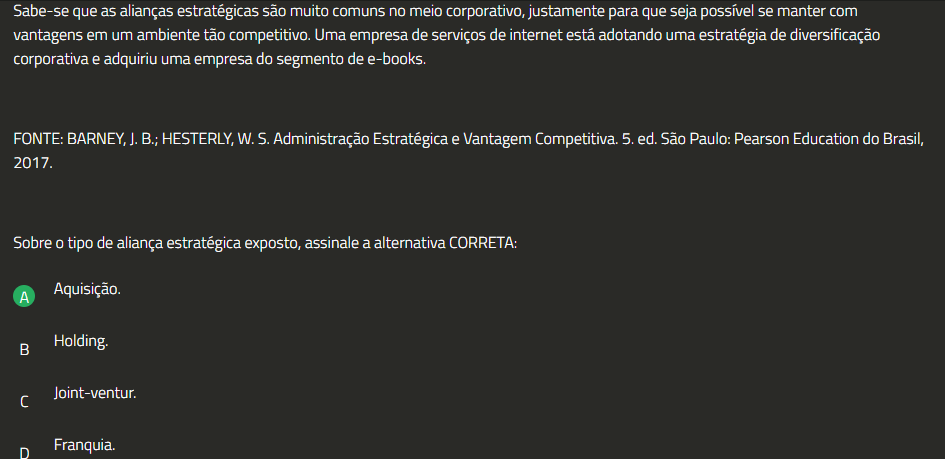 Sabe-se que as alianças estratégicas são muito comuns no meio corporativo, justamente para que seja possível se manter com vantagens em um ambiente tão competitivo. Uma empresa de serviços de internet está adotando uma estratégia de diversificação corporativa e adquiriu uma empresa do segmento de e-books. FONTE: BARNEY, J. B.; HESTERLY, W.S. Administração Estratégica e Vantagem Competitiva. 5. ed. São Paulo: Pearson Education do Brasil, 2017. Sobre 0 tipo de aliança estratégica exposto, assinale a alternativa CORRETA: A Aquisição. Holding. Joint-ventur. D Franquia.