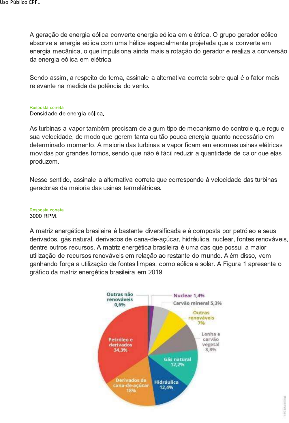 Uso Público CPFL A geração de energia eólica converte energia eólica em elétrica. grupo gerador eólico absorve a energia eólica com uma hélice especialmente projetada que a converte em energia mecânica, o que impulsiona ainda mais a rotação do gerador e realiza a conversão da energia eólica em elétrica. Sendo assim, a respeito do tema, assinale a alternativa correta sobre qual é fator mais relevante na medida da potência do vento. Resposta correta Densidade de energia eólica. As turbinas a vapor também precisam de algum tipo de mecanismo de controle que regule sua velocidade, de modo que gerem tanta ou tão pouca energia quanto necessário em determinado momento. A maioria das turbinas a vapor ficam em enormes usinas elétricas movidas por grandes fornos, sendo que não é fácil reduzir a quantidade de calor que elas produzem. Nesse sentido, assinale a alternativa correta que corresponde à velocidade das turbinas geradoras da maioria das usinas termelétricas. Resposta correta 3000 RPM. A matriz energética brasileira é bastante diversificada e é composta por petróleo e seus derivados, gás natural, derivados de cana-de-açúcar, hidráulica, nuclear, fontes renováveis, dentre outros recursos. A matriz energética brasileira é uma das que possui a maior utilização de recursos renováveis em relação ao restante do mundo. Além disso, vem ganhando força a utilização de fontes limpas, como eólica e solar. A Figura 1 apresenta o gráfico da matriz energética brasileira em 2019. Outras não Nuclear 1,4% renováveis 0,6% Carvão mineral 5,3% Outras renováveis 7% Lenha e Petróleo e carvão derivados vegetal 34,3% 8,8% Gás natural 12,2% Derivados da Hidráulica cana-de-açúcar 12,4% 18%Uso Público CPFL Figura 1 Matriz energética brasileira em 2019 Fonte: Matriz... (2021). Resposta correta I, e IV, apenas. Uma usina termelétrica é uma usina que converte energia térmica em energia elétrica. Essas usinas de energia fazem tal processo, principalmente, aquecendo combustíveis fósseis, os quais transformam a água em vapor. Desse modo, essas usinas térmicas podem liberar muitos gases que são prejudiciais para o meio ambiente. Considerando excerto apresentado a respeito dos equipamentos instalados nas usinas para reduzir a poluição do ar, analise as afirmativas a seguir. I. Instalação de filtro de ar. II. Instalação de filtro III. Instalação de precipitador eletrostático. IV. Instalação de filtro de areia. Está correto que se afirma em: Resposta correta III, apenas. As usinas hidrelétricas, geralmente, estão localizadas em represas que represam rios, aumentando, assim, nível da água atrás da represa, criando uma queda tão alta quanto possível. Na usina hidrelétrica, os geradores de turbina são movidos pela queda d'água. Considerando excerto apresentado, sobre usinas hidrelétricas, analise as afirmativas a seguir: I. A eficiência da usina hidrelétrica não diminui com o tempo. II. custo de construção de uma usina hidrelétrica é muito alto e leva muito tempo para ser construída. III. Atender às demandas de carga que mudam rapidamente não é possível em usinas hidrelétricas. IV. É uma planta muito limpa porque nenhuma fumaça ou cinza é produzida. Está correto que se afirma em: Resposta correta I, e IV apenas. A energia eólica é um dos três principais recursos de energia renovável, ao lado das energias solar e hidrelétrica, que estão sendo exploradas em grande escala para geração de energia global. Como um recurso energético, o vento é amplamente distribuído e capaz de fornecer energia na maioria das partes do mundo. A respeito da geração de energia eólica, analise as afirmativas a seguir e marque V para as verdadeiras e F para as falsas.Uso Público CPFL I. É flexível, podendo ser gerada em terra e no mar. II. Torna-se mais cara conforme mais parques eólicos são construídos. III. A geração eólica é constante. IV. É rápida de construir e fácil de remover. Assinale a alternativa que apresenta a sequência correta. Resposta correta V,F,F,V. setor elétrico brasileiro é composto por órgãos e instituições que possuem funções bem definidas, sejam elas funções políticas, de regulação, fiscalização, dentre outras. Algumas instituições são bem conhecidas, como a Agência Nacional de Energia Elétrica (ANEEL), Operador Nacional do Sistema (ONS) e o Ministério de Minas e Energia (MME). Considerando excerto apresentado, sobre os órgãos e instituições que compõem setor elétrico brasileiro, analise as afirmativas a seguir: I. A ANEEL é responsável por realizar estudos e pesquisas para subsidiar planejamento do setor elétrico brasileiro. II. MME executa as políticas públicas dos recursos energéticos do país. III. A ANEEL tem como função controlar e fiscalizar as concessões, permissões e serviços de energia elétrica. IV. ONS é responsável por coordenar a operação de geração e transmissão de energia elétrica no país. É correto que se afirma em: Resposta correta II, III e IV, apenas. Para a geração solar em grande escala, baseada em rede, normalmente há um gerador alternativo disponível para fornecer energia quando a energia solar não estiver disponível. Vários sistemas de armazenamento de energia também são capazes de armazenar energia elétrica quando sol não está brilhando. Assim, considerando excerto apresentado, pensando sobre um projeto de sistema fotovoltaico puramente conectado à rede, analise as afirmativas a seguir. I. sistema conectado à rede não precisa, necessariamente, de armazenamento em bateria porque a rede pode captar e fornecer energia quando necessário. II. sistema fotovoltaico deve ser projetado de modo que painel fotovoltaico continue a alimentar a rede, mesmo em caso de falha desta. III. sistema fotovoltaico conectado à rede só pode ser projetado em torno da carga necessária que precisa ser alimentada. IV. A configuração do 