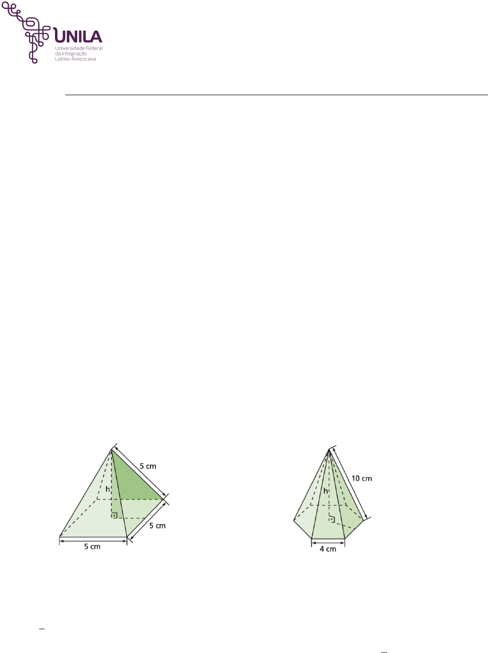 Universidade Federal da Integração Latino-Americana Disciplina: Geometria Euclidiana Espacial Professora: Juliana Gomes da Silva Aluno(a): Lista 8 Entregar a lista resolvida dia 30/06/2025. Lembre de justificar suas respostas. 1. Calcule a área do triângulo que se obtém unindo-se o centro de uma face de um cubo com as extremidades de uma aresta da face oposta, sabendo que a medida da aresta do cubo vale 5 cm. 2. Ache a natureza de uma pirâmide, sabendo que a soma dos ângulos das faces é igual a 56 retos. 3. Calcule o número de diagonais da base de uma pirâmide, sabendo que a soma dos ângulos internos de todas as suas faces é igual a 32 retos. 4. Determine a soma dos ângulos internos da base de uma pirâmide, sendo 24 retos a soma dos ângulos internos de todas as faces dessa pirâmide. 5. Ache a natureza de uma pirâmide que possui: (a) 8 faces (b) 12 arestas (c) 20 arestas 6. Calcule a área lateral, a área total e o volume das pirâmides regulares, cujas medidas estão indicadas nas figuras abaixo. (a) (b) 7. Sabendo que a aresta de um tetraedro regular mede 3 cm, calcule a medida de sua altura, sua área total e seu volume. 8. Determine a medida da aresta de um tetraedro regular, sabendo que sua superfície total mede 9 √ 3 cm2. 9. Calcule a altura e o volume de um tetraedro regular de área total 12 √ 3 cm2. 1 10. Determine a medida da aresta de um tetraedro regular, sabendo que seu volume mede 18 √ 2 m3. 11. Calcule a área total de um tetraedro regular cujo volume mede 144 √ 2 m3. 12. Calcule a área lateral e a área total de uma pirâmide regular hexagonal cujo apótema mede 4 cm e a aresta da base mede 2 cm. 13. Calcule a aresta lateral de uma pirâmide regular, sabendo que sua base é um hexágono de 6 cm de lado, sendo 10 cm a altura da pirâmide. 14. A aresta lateral de uma pirâmide quadrangular regular mede 15 cm e a aresta da base 10 cm. Calcule o volume. 2