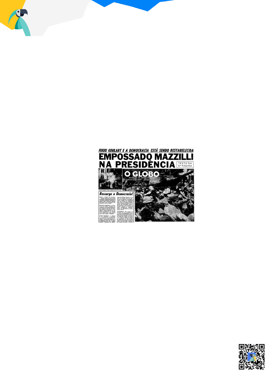 Prova de Brasil: Ditadura Cívico-Militar Prof. Sabrina Ellwanger Schneider NOME –––––––––––––––––––––––––––––––––––––––––––––––––––––––––––––––––––––––––––––––––––––– SÉRIE TURMA ––––––––––––––––––––––––––––––––– –––––––––––––––––––––––––––––––––––––––––––––––– Questão 1. Em 1964, quase todos os jornais mais importantes do Brasil apoiaram entusiasticamente um Golpe de Estado que derrubou o presidente legítimo, João Goulart, depois de intensa campanha de propaganda e desestabilização. A capa do jornal O Globo de 2 de abril de 1964, reproduzida abaixo, comemorava o Golpe que suprimiu o regime democrático constitucional afirmando que se tratava, ao contrário, de “ressurgimento da democracia”, mesmo com o povo perdendo o direito de escolher seu governo. Começaria ali a mais longa ditadura da história brasileira.Sobre a Ditadura Civil-Militar (1964-1985), leia atentamente as alternativas abaixo e assinale a única afirmação correta: (A) Em 1968, o AI-5 (Ato Institucional n.º 5) destruiu a autonomia do Judiciário e Legislativo, permitindo ao presidente-ditador fechar o Congresso, censurar os meios de comunicação e prender arbitrariamente qualquer cidadão. (B) A doutrina da Segurança Nacional era compartilhada pelos generais que governaram ditatorialmente o Brasil, a Argentina, o Chile e o Uruguai nas décadas de 1970 e 1980, mas não houve nenhuma tentativa de cooperação entre essas ditaduras. (C) Ao encerrar-se oficialmente em 1985, o período ditatorial deixou a inflação sob controle, reduziu a dívida externa e completou 21 anos sem nenhum escândalo de corrupção e mostrando total respeito aos direitos humanos. (D) Todos os governadores do então Território Federal de Roraima, indicados pelo governo ditatorial, foram civis. (E) O Golpe de 1964 foi exclusivamente militar, sem participação de setores civis do empresariado, igrejas ou meios de comunicação de massa. Questão 2. Nessas publicações da imprensa do ano de 1984 é apresentada uma série de eventos ligados a um movimento conhecido como "Diretas Já". Esse movimento se relacionava com questões da vida política da sociedade brasileira. Disponível em: http://www.andrei.bastos.nom.br/imagens_portfolio_peq/diretas.jpg. Acesso em: 30 abr. 2017. Esse movimento tinha entre seus objetivos apoiar (A) a democracia no brasil e a presença contínua dos militares na presidência do brasil. (B) o regime militar e as eleições do presidente pelos deputados e senadores. (C) o regime militar e as eleições diretas dos comandantes militares nos quartéis. (D) a democracia no brasil e a eleição do presidente por todos os eleitores. Questão 3. Disponível em: http://guerrilheirosvirtuais.blogspot.com/2009/02/para-folha-de-s-paulo-nao-houve.html. Acesso em: 30 abr. 2017. A charge retrata um período histórico brasileiro. Ele é denominado (A) Ditadura Militar. (B) República Populista. (C) República Velha. (D) Era Vargas. Questão 4. Durante a Ditadura Cívico-Militar no Brasil, que teve início com o golpe de 1964 e durou até meados da década de 1980, o país passou por profundas transformações socioeconômicas e políticas, além de enfrentar a repressão e o cerceamento das liberdades individuais. Nesse contexto, o economista Celso Furtado, em ‘O Capitalismo Dependente e a Questão Nacional’, afirmou que ‘O processo de desenvolvimento brasileiro tem uma característica que lhe é própria: a de ter sido alcançado, ao longo do tempo, sem a criação de uma base sólida de acumulação de capital’. Considerando essa observação de Furtado, discuta: 1) De que maneira a política econômica adotada durante o regime militar refletiu a busca por uma suposta ‘base sólida de acumulação de capital’ e quais foram suas implicações para a sociedade brasileira? 2) Avalie o papel dos interesses internacionais, especialmente dos Estados Unidos, na condução do desenvolvimento econômico e nas decisões políticas do período da ditadura. Questão 5. Durante o período da Ditadura Cívico-Militar no Brasil (1964-1985), o país passou por significativas transformações econômicas, sociais e culturais, além de sofrer com a repressão política e a censura. Analise o trecho a seguir, extraído do livro 'O Que é Isso, Companheiro?' de Fernando Gabeira, que descreve a ação de um dos órgãos de repressão do regime militar: 'Quando menos se esperava, o telefone tocava: era o DOPS, o Departamento de Ordem Política e Social, querendo conversar com um dos seus pais. E, em questão de minutos, um clima de pânico e incerteza se instalava em nossa casa'. Com base em seus conhecimentos e na leitura atenta ao trecho apresentado, responda: (1) Como a atuação do DOPS e de outros órgãos de repressão refletiu a política de segurança nacional adotada pelo regime militar? (2) Discorra sobre a relação entre o desenvolvimento econômico e as práticas repressivas do período, considerando especificamente a influência norte-americana nesse contexto. Questão 6. Durante a Ditadura Cívico-Militar no Brasil (1964-1985), o regime impôs uma série de políticas e ações que impactaram profundamente a sociedade e a economia do país. Gilberto Freyre, em sua obra 'Casa-Grande & Senzala' (1933), refere-se à dinâmica interna das sociedades coloniais, destacando a hierarquia social e o papel do 'pai-de-santo' ou 'mãe-de-santo' como um dos personagens que, embora oriundo de uma camada social menos privilegiada, desempenhava funções de mediação e poder. Com base nesse contexto e em seus conhecimentos, responda: (1) De que maneira o período da Ditadura militar brasileira refle