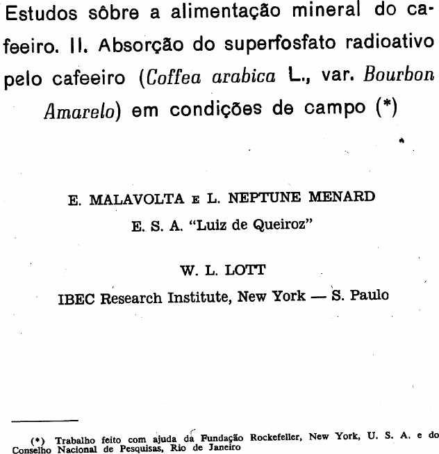 Estudos sôbre a alimentação mineral do ca¬ feeiro. I I . Absorção do superfosfato radioativo pelo cafeeiro (Coffea arabica L., var. Bourbon Amarelo) em condições de campo (*) E. MALAVOLTA E L. NEPTUNE MENARD E. S. A. "Luiz de Queiroz" W. L. LOTT IBEC Research Institute, New York — S. Paulo (*) Trabalho feito com ajuda da Fundação Rockefeller, New York, U. S. A. e do Conselho Nacional de Pesquisas, Rio de Janeiro 1. INTRODUÇÃO. No Brasil, bem como em outras regiões cafeeiras do, globo, os adubos fosfatados são geralmente fornecidos aos pés-de- café aplicando-os em sulcos de Í5-30 cm de profundidade, ou em covas ou buracos. O método de aplicação é fundamentado no temor de que as distribuições superficiais poderiam ser insuficientes devido às perdas por fixação, fenômeno que é particularmente intenso em alguns solos tropicais ricos em ferro e alumínio, como é o caso das terras roxas brasileiras (MALAVOLTA & PELLEGRINO, 1954). Entretanto, ensaios feitos em Puerto Rico com super fos fato marcado mostraram que o cafeeiro absorve uma quanti dade maior do fósforo desse fertilizante quando a aplicação se faz na superfície do solo do que quando êle é fornecido em sulcos circulares ou semi-circulares ou em buracos; no primei ro caso, 9-14 por cento do P contido nas folhas do cafeeiro vie ram do superfosfato; nos outros tipos de aplicação os valores achados não passaram de 3 por cento (BONNET & RIERA, 1954; BONNET et al., 1955). Como esses fatos experimentais estavam em desacordo com o que se pensava geralmente entre nós em matéria de modo de adubação do cafeeiro, os ensaios seguintes foram conduzidos. Procurou-se ainda estudar a in fluência da cobertura morta ("mulch") na absorção do super fosfato pelo cafeeiro. 2. MATERIAL E MÉTODOS 2 . 1 . Ensaio de modo de aplicação. ' O ensaio foi feito com cafeeiros (var. Bourbon amarelo) de um ano e meio de idade, aproximadamente, plantados em terra roxa misturada; cada cova tinha 3 plantas. O superfosfato foi fornecido na proporção de 150 gramas por pé, adicionado de H 3 P 3* 0 4 numa atividade total de 5X10 9 contagens por minuto (c.p.m.). A atividade específica do material foi determinada precipitando-se o fósforo contido em alíquotas adequadas como Mg NH 4 P 0 4 . 6H 2 O. A Tabela 1 mostra alguns dos resultados obtidos nessas determinações. A aplicação foi feita de várias maneiras; a) em sulco circular ("coroa") em volta do pé-de-café; a coroa tinha 17,5 cm de largura e 15 de profundidade; o sulco estava a 35 cm do centro do triângulo formado pelos pés-de-café; b) em sulco semi-circular, com características semelhantes às da coroa; c) em faixa circular e superficial com 25 cm de lar gura e cuja margem interna passava a 5 cm das plantas; d) em pulverização nas folhagens: foram feitas 3 pulveriza ções usando-se em cada uma 50 g do superfosfato marcado dissolvidos em 2 litros dágua; à solução era adicionado um adesivo; a superfície do solo foi recoberta com papel grosso para evitar que o excedente das pulverizações caisse ao solo. Quatro repetições foram usadas. Um mês depois da aplicação, o primeiro e o segundo pa res de folhas do segundo ramo (a contar da ponta), folhas essas formadas depois que a distribuição do superfosfato fora feita, foram colhidos e secos em estufa a 70-80°C; a seguir as folhas foram trituradas e incineradas; as cinzas foram re tomadas com HC1 1+9; em uma alíquota — depois de filtra ção e adição de água até um volume certo — era determi nado o fósforo pelo método do yanadato; em outra alíquota era seca e determinava-se então a radioatividade usando um contador com janela de mica. Além de correções para radia ção de fundo ("back-ground") e auto absorção ("self absorption"), a perda por desintegração ("decay") era tam bém corrigida usando-se a fórmula I 0 = I t><6,5 onde I 0 = con tagem real, I t = contagem observada e 6,5 uma constante calculada levando em conta a meia vida ("half life") do P 8 2 e o tempo decorrido entre a instalação do ensaio" e as con tagens realizadas. Com folhas tiradas das plantas pulverizadas com o su perfosfato marcado foram feitas radioautografias a fim de verificar se a atividade nelas encontrada era devida a conta minação superficial ou absorção de fato. 2 .2 . Ensaio de translocação. Para se obter uma indicação mais pormenorizada a res peito da absorção do superfosfato aplicado às folhas, foi feito um ensaio em casa de vegetação usando plantas (2) cultiva das em solução nutritiva. Tais plantas tinham 1 ano de idade e, embora estando há 6 meses em meio no qual não se adicio nara P, não apresentavam sintomas de deficiência. A apli cação foi feita diluindo-se o HgF^CXt com K H 2 P 0 4 M de modo a fornecer 107 c.p.m. por planta e 1 milimol daquele sal; foi feito pincelamento em ambas as faces de uma folha recém amadurecida. Deixou-se a absorção e a translocação terem lugar durante 1 mês. 2 . 3 . Efeito da cobertura morta. Este ensaio foi conduzido em solo do tipo arenito de Bauru, com plantas de 8 anos de idade. O superfosfato, nas doses indicadas em 2.1., foi aplicado na superfície, numa faixa de 70 cm de largura ao redor das plantas, depois de afastada a cobertura morta. Determinou-se apenas a atividade das fo lhas triturando-as depois de secas e comprimindo o material moído numa prensa de laboratório. Como o que interessava era verificar apenas se havia diferença na absorção entre plan tas com cobertura morta e plantas sem essa proteção, no presente experimento foram feitas apenas correções para auto absorção e radiação de fundo. 2.4. Penetração no solo. Como o método traçador é muito mais sensível do que qualquer processo analítico para a determinação do fósforo, nos ensaios 2.1 e 2.3 foram tiradas amostras de solo a dife rentes profundidades para ter-se uma idéia da penetração do superfosfato aplicado no perfil. O fósforo das amostras foi