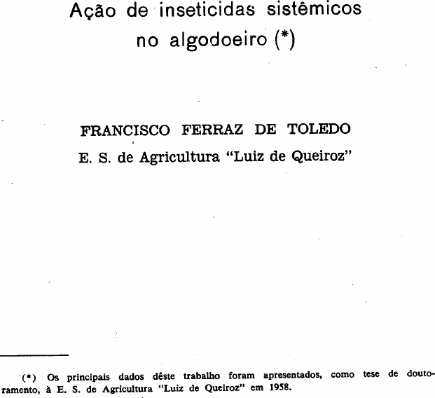 Ação de inseticidas sistêmicos no a lgodoeiro (*) F R A N C I S C O F E R R A Z D E T O L E D O E. S. de Agricultura "Luiz de Queiroz" (*) Os principais dados dêste trabalho foram apresentados, como tese de douto ramento, à E. S. de Agricultura "Luiz de Queiroz" em 1958. 1. I N T R O D U Ç Ã O Como se viessem avolumando as dificuldades na debelação das pragas do algodoeiro, com os produtos químicos usuais, os cotonicultores paulistas começaram a fazer uso dos inse ticidas sistêmicos que se encontravam distribuídos no comér cio, mesmo antes que os institutos oficiais dessem por termi nados seus trabalhos experimentais. No que concerne a pulverização das plantas, essas aplica ções mostraram resultados práticos que satisfizeram plena mente. Tais resultados foram depois confirmados por traba lhos muito bem conduzidos pelo Instituto Biológico de São Paulo. O mesmo não se pode dizer, porém, quanto ao tratamento das sementes, pois enquanto que algumas culturas oriundas de sementes tratadas se apresentavam em ótimas condições, outras se apresentavam bastante irregulares devido á baixa porcentagem de germinação. Esses resultados contraditórios não constitüiram surpreza aos pesquisadores, pois, diversos experimentos, realizados principalmente nos Estados Unidos da América do Norte, não apresentavam resultados concor- dantes de maneira que permitissem uma conclusão definitiva a respeito. O presente trabalho visa fornecer u m a contribuição para u m melhor conhecimento de certos pontos ainda obscuros do emprego dos inseticidas sistêmicos na cultura algodoeira. 2 . M A T E R I A L E M É T O D O S 2 . 1 . Ensaios de laboratório E m laboratório foram realizados ensaios de germinação em aparelhos dotados de câmara úmida a temperatura cons tante, com placas de vidro para suporte das sementes; as tampas das câmaras, também de vidro, quando fechadas pro piciavam ambiente de umidade relativa elevada e iluminação natural durante o dia; sobre as placas, de dimensão de 9 X 38 cm, utilizamos folhas duplas de papel de filtro de boa absorção, com u m prolongamento em contato permanente com a água da cuba do germinador. A temperatura nas câ- jnaras foi regulada para 3 0 ° C e diariamente eram abertas as tampas, provocando-se, assim, rápida renovação do ar con tido nas mesmas. Como a finalidade era o estudo da influên- cia de produtos químicos sobre a capacidade de germinação das sementes, deixamos de fazer, nelas, a aplicação de desin- fetantes. Para a desinfeção do germinador, que foi efetuada para cada ensaio, foi usada solução de formol a 5 por 1.000, cuja aplicação foi feita com o auxílio de u m pulverizador manual . As contagens foram realizadas parceladamente, em nú mero de três, no segundo, quarto e sexto dias após a instalação e as sementes germinadas eram eliminadas. A técnica, em geral, seguida da determinação da capaci dade de germinação, baseia-se nos trabalhos de B A C C H I (1954) , C O S T A (1957) e M A T O S (1939) . As sementes utilizadas foram as da variedade I. A. Cam pinas 817 e provieram da distribuição feita em 1957, pela Secretaria da Agricultura do Estado de São Paulo. Tratava-se de sementes deslintadas mecanicamente e expurgada com bro meto de metila. Tomadas as amostras, contendo cada uma 300 g de se mentes, foram submetidas aos seguintes tratamentos: 1) thimet — produto com 44,7% de princípio ativo (ditiofosfato de 0,0 dietil S. etil mercaptometil), em carvão ativado e misturado às sementes na base de 2 % de princípio ativo; 2) disyston — produto com 50% de princípio ativo (di tiofosfato de 0,0 dietil S. etil-mercaptoetil), em carvão ativado e misturado às sementes na base de 2 % de princípio ativo; 3) metaisosystox — produto com 50% de princípio ativo (tiofosfato de 0,0 dimetil S. etil-mercaptoetü) em carvão ativado e misturado às sementes na base de 4 % de princípio ativo; 4) testemunha, sem nada. Carvão ativado é aquele usado como adsorvente, sendo preparado por carbonização do carvão que contém materiais como madeira, sangue e osso ( H A S S L E R & G O E T Z , 1948) . A escolha das doses baseou-se nas recpmendações^ técnicas das firmas fabricantes. Depois de cuidadosamente tratadas com o inseticida sis têmico, as sementes foram colocadas em sacos duplos de papel impermeável, numerados de 1 a 4, de acordo com o trata mento aplicado às sementes, os quais permaneceram bem fe chados. No mesmo dia do tratamento foram retiradas de cada saco as sementes necessárias para a instalação do pri meiro ensaio de germinação, que constou de três repetições de cada tratamento, designadas A, B e C, totalizando 12 par celas e correspondendo às 12 placas de vidro do aparelho de germinação. As placas foram distribuídas ao acaso em cada repetição e cada u m a recebeu 100 sementes, ficando estas bem espaçadas entre si. Constituiu cada ensaio, portanto, u m de- lineamento de blocos ao acaso ( G R A N E R , 1952; P I M E N T E L G O M E S , 1955). De acordo com B A C C H I (1954) e M A T O S (1939), o nú mero de repetições deveria ser quatro; todavia, como o nosso aparelhamento não o permitisse, fomos obrigados a reduzir esse número para três. Encerrado o primeiro ensaio, foi insta lado o segundo, com as sementes dos mesmos sacos numera dos de 1 a 4, que foram mantidos guardados no laboratório até o final dos testes. D a mesma maneira que o primeiro e o segundo foram instalados mais seis outros ensaios em datas diferentes, observando-se entre dois ensaios sucessivos u m pe ríodo de 15 dias. O último ensaio se deu com sementes que permaneceram em contato com inseticida durante 100 dias. Concluída esta série, três outros ensaios, incluindo trata mentos com diferentes doses, foram realizados. Cada ensaio de três tratamentos e de seis repetições, designadas estas de A, B, C, D, E, F, foi realizado e m duas vezes. A instalação dos testes foi feita 24 horas, depois d