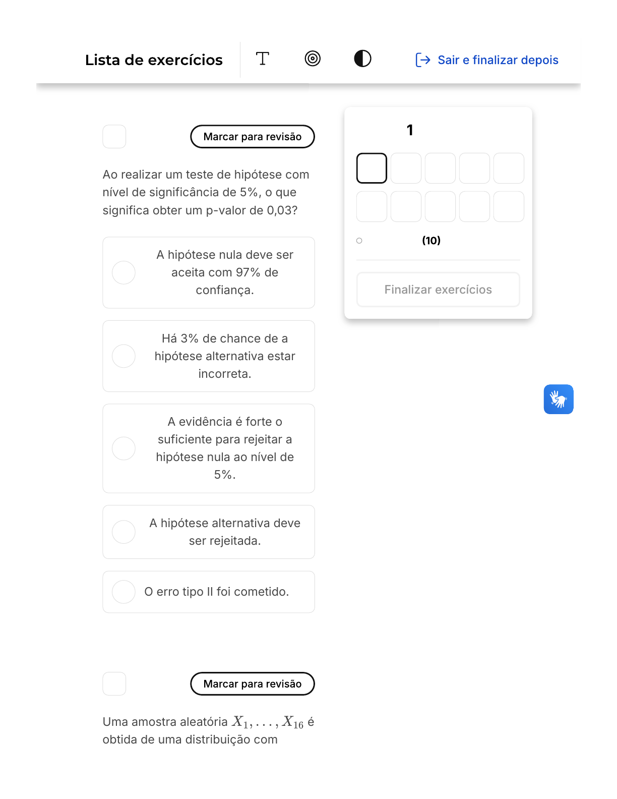 A B C D E 1 Ao realizar um teste de hipótese com nível de significância de 5%, o que significa obter um p-valor de 0,03? A hipótese nula deve ser aceita com 97% de confiança. Há 3% de chance de a hipótese alternativa estar incorreta. A evidência é forte o suficiente para rejeitar a hipótese nula ao nível de 5%. A hipótese alternativa deve ser rejeitada. O erro tipo II foi cometido. 2 Uma amostra aleatória é obtida de uma distribuição com X1, . . . , X16 Questão de 10 Em branco 1 2 3 4 5 6 7 8 9 10 Testes… Zen https://estacio.saladeavaliacoes.com.br/exercicio/685c60258e7f06f7b75... 1 of 10 6/25/2025, 5:46 PM A B C D E média desconhecida e variância desconhecida dada por . Para a amostra observada, temos e a variância amostral . Encontre um intervalo de confiança de 95% para . Saiba também que: , , e . Ao final, utilize somente a parte inteira (i.e. antes da vírgula) dos valores mínimos e máximos do intervalo de confiança, por exemplo, se você obter �1.5 , 3.7] marque �1, 3�. Assinale a alternativa correta. μ = E[Xi] V ar[Xi] = σ2 ¯̄̄ ¯̄ X = 16.7 S2 = 7.5 σ2 z0.025 = 1.96 t0.025,15 = 2.13 X2 0.025,15 = 27.49 X2 0.975,15 = 6.26 �4, 17� �8, 34� �4, 34� �8, 38� �8, 17� 3 Verifique quais afirmações são verdadeiras e assinale a alternativa correta: I � Em um teste de hipóteses, Zen https://estacio.saladeavaliacoes.com.br/exercicio/685c60258e7f06f7b75... 2 of 10 6/25/2025, 5:46 PM A B C D E comete-se um Erro Tipo 1 quando se rejeita uma hipótese nula verdadeira. II � O poder de um teste de hipóteses é medido pela probabilidade de se cometer o Erro Tipo 2. III � A soma das probabilidades dos Erros Tipo 1 e Erro Tipo 2 é igual a 1. IV � Quanto maior for o nível de significância de um teste de hipóteses, maior será o p-valor a ele associado. Apenas a alternativa I é correta. Apenas as alternativas I e II são corretas. Apenas as alternativas I, II e III são corretas. Apenas as alternativas II, III e IV são corretas. Apenas as alternativas I e IV são corretas. 4 Se queremos fazer um teste de hipóteses para e , onde a distribuição de nossa amostra é uma normal com variância H0 : μ = μ0 H1 : μ > μ0 N(μ, σ2) Zen https://estacio.saladeavaliacoes.com.br/exercicio/685c60258e7f06f7b75... 3 of 10 6/25/2025, 5:46 PM A B C D E desconhecida, utilizamos a estatística "A" e a região de aceitação "B" em nosso teste. Sabendo que nossa amostra é pequena, assinale a alternativa que corresponde ao par correto para "A" e "B". W = e W ≤ −zα ¯̄̄ ¯̄ X−μ0 S/√n W = e W ≤ −tα,n−1 ¯̄̄ ¯̄ X−μ0 σ/√n W = e W ≤ −tα,n−1 ¯̄̄ ¯̄ X−μ0 S/√n W = e W ≤ −zα ¯̄̄ ¯̄ X−μ0 σ/√n W = e W ≥ −zα ¯̄̄ ¯̄ X−μ0 S/√n 5 Assuma que você possui uma amostra aleatória extraída de uma população normalmente distribuída, com média desconhecida e variância conhecida. Qual expressão representa corretamente o intervalo de confiança de 95% para a média populacional? Zen https://estacio.saladeavaliacoes.com.br/exercicio/685c60258e7f06f7b75... 4 of 10 6/25/2025, 5:46 PM A B C D E Média amostral mais ou menos o valor crítico da distribuição t multiplicado pelo desvio padrão da amostra dividido pela raiz do tamanho da amostra. Média amostral mais ou menos o valor crítico da distribuição normal multiplicado pela variância populacional. Média amostral mais ou menos o valor crítico da distribuição normal multiplicado pelo desvio padrão populacional dividido pela raiz do tamanho da amostra. Média amostral mais ou menos o valor crítico da distribuição qui-quadrado multiplicado pelo desvio padrão da população. Média amostral mais ou menos a raiz quadrada do tamanho da amostra multiplicada pelo desvio padrão da população. Zen https://estacio.saladeavaliacoes.com.br/exercicio/685c60258e7f06f7b75... 5 of 10 6/25/2025, 5:46 PM A B C D E 6 Uma amostra aleatória é obtida de uma distribuição com variância desconhecida dada por . Para a amostra observada, temos e a variância amostral é . Encontre um intervalo de confiança de 99% para . Saiba também que: . Ao final, utilize somente a parte inteira (i.e. antes da vírgula) dos valores mínimos e máximos do intervalo de confiança, por exemplo, se você obter �1.5 , 3.7] marque �1, 3�. Assinale a alternativa correta. X1, . . . , X144 V ar[Xi] = σ2 ¯̄̄ ¯̄ X = 55.2 S2 = 34.5 θ = E[Xi] z0.005 = 2.58 �50, 53� �52, 55� �53, 56� �54, 57� �55, 58� 7 Um estudo deseja estimar a variância Zen https://estacio.saladeavaliacoes.com.br/exercicio/685c60258e7f06f7b75... 6 of 10 6/25/2025, 5:46 PM A B C D E A B populacional de uma variável com distribuição normal, com base em uma pequena amostra. Qual distribuição deve ser usada para construir o intervalo de confiança para essa variância? Distribuição Normal Padrão Distribuição t de Student Distribuição Gama Distribuição Exponencial Distribuição Qui-quadrado 8 Em um teste de hipótese, qual das opções descreve corretamente um Erro Tipo II? Rejeitar a hipótese nula quando ela é falsa. Aceitar a hipótese nula quando ela é verdadeira. Zen https://estacio.saladeavaliacoes.com.br/exercicio/685c60258e7f06f7b75... 7 of 10 6/25/2025, 5:46 PM C D E A B Rejeitar a hipótese alternativa quando a nula é falsa. Não rejeitar a hipótese nula quando ela é falsa. Rejeitar ambas as hipóteses simultaneamente. 9 Verifique quais afirmações são verdadeiras e assinale a alternativa correta: I � Se o p-valor de um teste de hipóteses for igual a 0.015, a hipótese nula será rejeitada a 5% de significância, mas não a 1%. II � O p-valor de um teste de hipóteses é a probabilidade da hipótese nula ser rejeitada. III � O poder de um teste de hipótese é a probabilidade de rejeitar corretamente uma hipótese nula falsa. Apenas a alternativa I é correta. Apenas as alternativas I e II são corretas. Zen https://estacio.salad