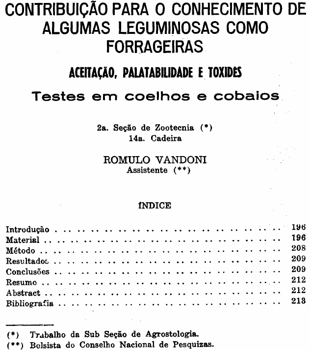 CONTRIBUIÇÃO PARA O CONHECIMENTO DE ALGUMAS LEGUMINOSAS COMO FORRAGEIRAS ACEITAÇÃO, PALATABILIDADE E Testes em coelhos e cobaios 2a. Seção de Zootecnia ( * ) 14a. Cadeira ROMULO V A N D O N I Assistente ( * * ) Í N D I C E Introdução ........... 196 Material 196 Método 2 0 8 Resultados, 2 0 9 Conclusões 2 0 9 Resumo ..... 2 1 2 Abstract 2 1 2 Bibliografia 2 1 3 ( * ) Trabalho da Sub Seção de Agrostologia. ( * * ) Bolsista do Conselho Nacional de Pesquizas. INTRODUÇÃO O problema forrageiro do Brasil Central, a maior zona pe cuária deste país, ainda está longe de ser solucionado. Nem de lineados ainda se acham programas para solução de seus pro blemas agrostológicos. As vastas áreas pastoris estão cobertas sobretudo de Gramíneas constituindo freqüentemente boas in- vernadas ou pastagens para engorda, porém impróprias para criar pela pobreza em proteina dessas forrageiras. O clima e a qualidade das terras não permitem a utiliza ção das melhores Leguminosas forrageiras utilizadas nos pai- ses de clima mais frio e úmido e terras mais ricas de cálcio e fósforo, tais como os trevos e a alfafa. Teremos de buscar a so lução, em parte, utilizando outras Leguminosas próprias para o clima tropical e menos exigentes com relação ao solo. Entre os projetos em andamento na Sub-Seção de Agrosto- Logia, anexa a 14a. Cadeira (2a. de Zootecnia), escolhemos a utilização de Leguminosas geralmente usadas como adubo ver de, para experimentar sua aplicação como forragem. Se algumas delas já foram ensaiadas, permanecem ainda pouco conhecidas nesta aplicação, e outras nunca talvez foram exper imentadas. Os nossos ensaios preliminares foram realizados com ani mais de laboratório, como seria lógico, afim de transportar mais tarde, aqueles mais favoráveis para o terreno da prática, com os grandes animais domésticos, além de realizar outras obser vações relativas à produção econômica dessas forrageiras, sua consorciação, etc. Representa pois este trabalho um ensaio preliminar, que provavelmente será seguido de outros que o complementarão na medida das observações feitas. M A T E R I A L Trabalhamos com coelhos e cobaios, os quais receberam 15 espécies de Leguminosas, como forragem verde. Damos primei ramente uma relação das espécies utilizadas nestas experiên cias, uma descrição das mesmas e alguns comentários de ou tros autores sobre seus empregos mais comuns, e a seguir o método empregado em nossos testes. l.o — Feijão Veludo — Mucuna pruriens Wall ( A ) 2.o — Mucuna rajada — Styzólobium Deeringianum Steph e Bort ( A ) 3.o — Anileira do talo roxo — Indigofera hirsuta Lam (B) 4.o — Tephrosia cândida (B) 5.o — Guando — Cajanus cajan Millsp (C) 6.o — Feijão de porco — Canavalia ensiformes DC ( A ) 7.o — Cunha — Clitoria tematea L. (C) 8.o — Crotalaria — Crotalaria juncea L (B) 9.o — Crotalaria — Crotalaria paulina (B) lO.o — Crotalaria — Crotalaria spectabilis Roth (B) l l .o — Crotalaria — Crotalaria striata DC (C) 12.o—Crotalaria — Crotalaria breviflora ( A ) 13.o — Crotalaria — Crotalaria campista (B) 14.o — Crotalaria — Crotalaria lanceolata (C) lõ.o — Crotalaria — Crotalaria anagyroides (C) ( A ) —Testada somente com coelhos. (B) —Testada com coelhos e cobaios. (C) —Testada somente com cobaios. MUCUNAS MORRISON (11) diz que as mucunas são plantas anuais, trepadoras que crescem em toda zona do algodão, excepto no extremo norte dos Estados Unidos. Desenvolvem-se bem em solos arenosos, pobres e deficien tes em cálcio, contanto que sejam bem drenados. Mf smo as variedades precoces produzem u'a massa ema ranhada de ramos com 3 a 10 pés de comprimento, enquanto as tardias, vão de 15 a 40 pés. As mucunas são difíceis de fenar e cerca de 90% de sua plantação é feita em combinação com o milho, para suportar as ramas. A cultura é comumente usada para pastagem, depois que a maior parte das espigas de milho e, às vezes, uma parte das vangens maduras, tenham sido colhidas. Nos solos arenosos, as folhas, as ramas e as bainhas não murcham prontamente depois de mortas pela geada e a cultu ra fornece muitas vezes forragem até princípio da primavera. As mucunas fornecem boa pastagem para novilhos e car neiros, mas não para porcos. Com porcos de engorda, os aumen tos sâc geralmente satisfatórios, de conformidade com o milho deixado, de outro modo, serão fracos. Isto porque as semente de mucuna não são satisfatórias para porcos, quando formam uma parte considerável da ração. Dá bôa silagem em combinação com o milho, que, embora de cór escura, é comida prontamente pelo gado. FEIJÃO VELUDO Mucuna pruriens var. utilis, Wall. Mucuna utilis Planta anual, de ramos longos, finos e flexíveis, volúveis, folhar compostas, com 3 grandes folíolos. O Feijão Veludo cresce abundantemente, produzindo talos de grande comprimento sendo as folhas maiores que as de "Cow-pea" e freqüentemente de um verde mais claro; as fo lhas novas especialmente, são muito manchadas de retalhos, perto das nervuras principais. BENTON, H. (2) diz que essa é uma planta que muito se assemelha às variedades rasteiras de "Cow-pea", sendo que usualmente os talos apresentam um crescimento de 20 pés, ten do já medido trepadeiras com 33 pés de comprimento. As flores cor de purpura nascem em longos cachos, sendo as vagens, quase negras e cobertas de pêlos aveludados, indivi dualmente curtas e vigorosas. Há de 3 a 6 sementes numa vagem que são indeicentes. As sementes são 2 ou 3 vezes maiores que a de "Cow-pea", man chadas de preto e branco sujo. O seguinte trecho de uma carta, escrita por Lyster H De wey, assistente botânico do Departamento de Agricultura dos Estados Unidos é interessante. "Até agora, segundo pude determinar pelas espécies e des crições, o Feijão Veludo é Mucuna utilis Wall. A descrição ori ginal dessa planta foi publicada em "ícones Plantarum índias Orientales",