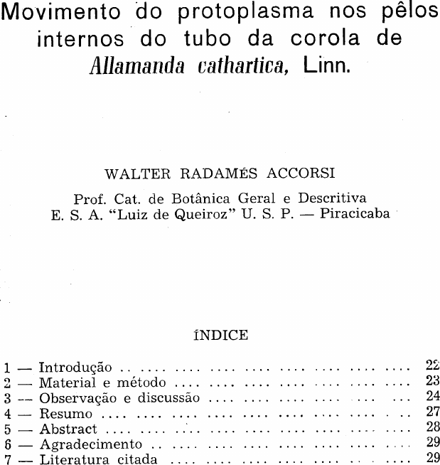 Movimento do pro top lasma nos pêlos internos do tubo da co ro la de Allamanda cathartica, Linn. WALTER RADAMÉS ACCORSI Prof. Cat. de Botânica Geral e Descritiva E. S. A. "Luiz de Queiroz" U. S. P. — Piracicaba ÍNDICE 1 — Introdução 22 2 — Material e método 23 3 — Observação e discussão 24 4 — Resumo 27 5 — Abstract 28 8 — Agradecimento 29 7 — Literatura citada 29 1. INTRODUÇÃO Segundo GOLA, NEGRI e CAPPELLETTI (1951), o mo vimento do citoplasma foi observado e pela primeira vez des crito pelo abade italiano Bonnaventura Corti, nas células de Chara, em 1774, e denominado circulação ou rotação protopias- mática. GUILLIERMOND (1941) designa o fenômeno c^n. o termo ciclose. Minúsculas granulações ou gotículas de material lipóide deslocam-se ao longo dos cordões citoplasmáticos, permitindo apreciar a intensidade do movimento, o qual é assaz irregular, pois segue diversas direções e possui velocidades diferentes Para GOLA, NEGRI e CAPPELLETTI, os movimentos dessa natureza resultam das incessantes modificações físico- químicas de que o citoplasma é a sede, como deslocações mole culares devido a diferentes velocidades de trocas no metabc' lismo e, em particular, nos fenômenos respiratórios. Os fato res luz, temperatura, correntes elétricas, mudança do pH do suco celular ou do meio ambiente influem na circulação do pro- toplasma. Além dos fatores acima, traços de cobre ou concentrações fracas de cloreto de bário ou de estrôncio, intensificam sobre modo, consoante SEIFRIZ (1936), a velocidade do movimento protoplasmático nas células da folha de Elodea. A intensidade de tais movimentos serve para estabelecer- se o grau de vitalidade de uma célula ou para a avaliação dos efeitos dos estímulos. Esse curiosíssimo fenômeno, de acordo com as citações clássicas, pode ser facilmente observado em células grandes, com enormes vacúolos, ricos de água, como as células de Cha ra, Nitella (Charophyta), Spirogyra, nas túnicas de Allium, na epiderme de íris, nas folhas de Elodea canadensis, nos pêlos es- taminais de Tradescantia, nos de Chelidonium majus, nos pê los dos caules novos de Cucurbita pepo, nos pêlos absorventes das raízes novas de Hydrocharis Morsus-Ranae, nas folhas de Vallisneria spiralis, no plasmódio dos mixomicetos, nas hifas dos fungos, e tc . Depreende-se, do exposto, que a ocorrência do movimento do protoplasma, no reino vegetal, é bastante ampla, encontran do-se em células pertencentes a organismos dos mais diversos graus evolutivos, desde os mixomicetos até aos vegetais de alta diferenciação morfológica e fisiológica. Na 3a. Reunião da Secção de São Paulo da Sociedade Bo tânica do Brasil, realizada em Piracicaba, em 20 de abril de 1951, fizemos uma demonstração aos botânicos presentes do mo vimento do protoplasma nos pêlos da corola de Allamanda ca- thartica. Posteriormente, em 1952, tivemos oportunidade de mencionar, outra vez, o mesmo fato, na aula inaugurai do cur so de agronomia (ACCORSI, 1952). 2. MATERIAL E MÉTODO Condensamos, neste trabalho, dados e observações que pu demos coligir em torno do movimento do protoplasma exibido pelos pêlos que guarnecem a face interna do tubo da corola de Allamanda calhartica, Linn. — a conhecida "alamanda-de-flor- grande". Como dissemos, os pêlos reunem-se em feixes que. por sua vez, se inserem em frente e um pouco acima de cada estame, de tal forma que o conjunto deles constitui uma cúpula protetora das anteras. Nas flores bem desabrcchadas os pêlos podem alcançar aíé 4 mm de comprimento. São hialinos, unicelulares, em regra ci líndricos e um tanto afilados na extremidade. Alguns há, entre eles, que são sinuosos. Numerosas incrustações pequenas, de composição cerácea, elípticas, circulares e às vezes irregulares, distribuem-se pela membrana e oferecem o aspecto de calota quando vistas em corte ótico. A membrana dessecada dos pêlos, quando examinada com grande aumento, mostra-se finamente esculturada por estrias longitudinais, retilíneas ou um tanto curvilíneas, de compri mento variável. Umas são simples, outras ramificadas por di- cotomia. Em certos trechos, ocorrem estrias transversais, bem mais espaçadas que as longitudinais e a membrana se apresen ta quadriculada. Abaixo da inserção dos estames, o tubo da corola exibe pê los esparsos, porém menores em número e tamanho que os dos feixes acima dos estames. A técnica usada para a extração dos pêlos, quer de botões ou de flores bem abertas, é simples e se resume nas seguintes operações: 1 — Com uma tezourinha, escalpelo, agulha-lanceolada ou lâmina de barbear, remove-se a porção da corola acima do tubo, de modo a expor o cone de pêlos, que se compõe, como sabemos, de cinco fascículos de pêlos. 2 — Divide-se, a seguir, longitudinalmente o tubo da coro la em cinco partes. Retiram-se as anteras com o escalpelo, dei xando apenas os fascículos de pêlos. 3 — Para eliminar a maior parte do ar retido entre os pê los, a fim de não prejudicar o exame ao microscópio (forma- ção de bolhas), mergulham-se os fragmentos obtidos em água ligeiramente aquecida, durante algum tempo. Pode-se, também, encher previamente o tubo da corola com água morna, conse- guindo-se os mesmos resultados. 4 — Umedecidos os pêlos e eliminado o ar, com o auxílio de um escalpelo, agulha lanceolada ou lâmina de barbear, cortam- se delgadas fatias do tubo da corola, em sentido longitudinal, de tal forma que cada secção contenha reduzido número de li nhas de pêlos. Na realização desta operação, que deve ser fei ta ao binocular estereoscópico, evitar qualquer traumatismo nos pêlos, a fim de não paralisar o movimento do protoplasma. 5 — ' A montagem do material na lâmina é feita em água destilada, na qual podem ser postas algumas gotas de verme lho neutro, a 1/1000, colorindo-se, assim, os pêlos, que são hia- linos. Experimentamos, com êxito, a montagem e