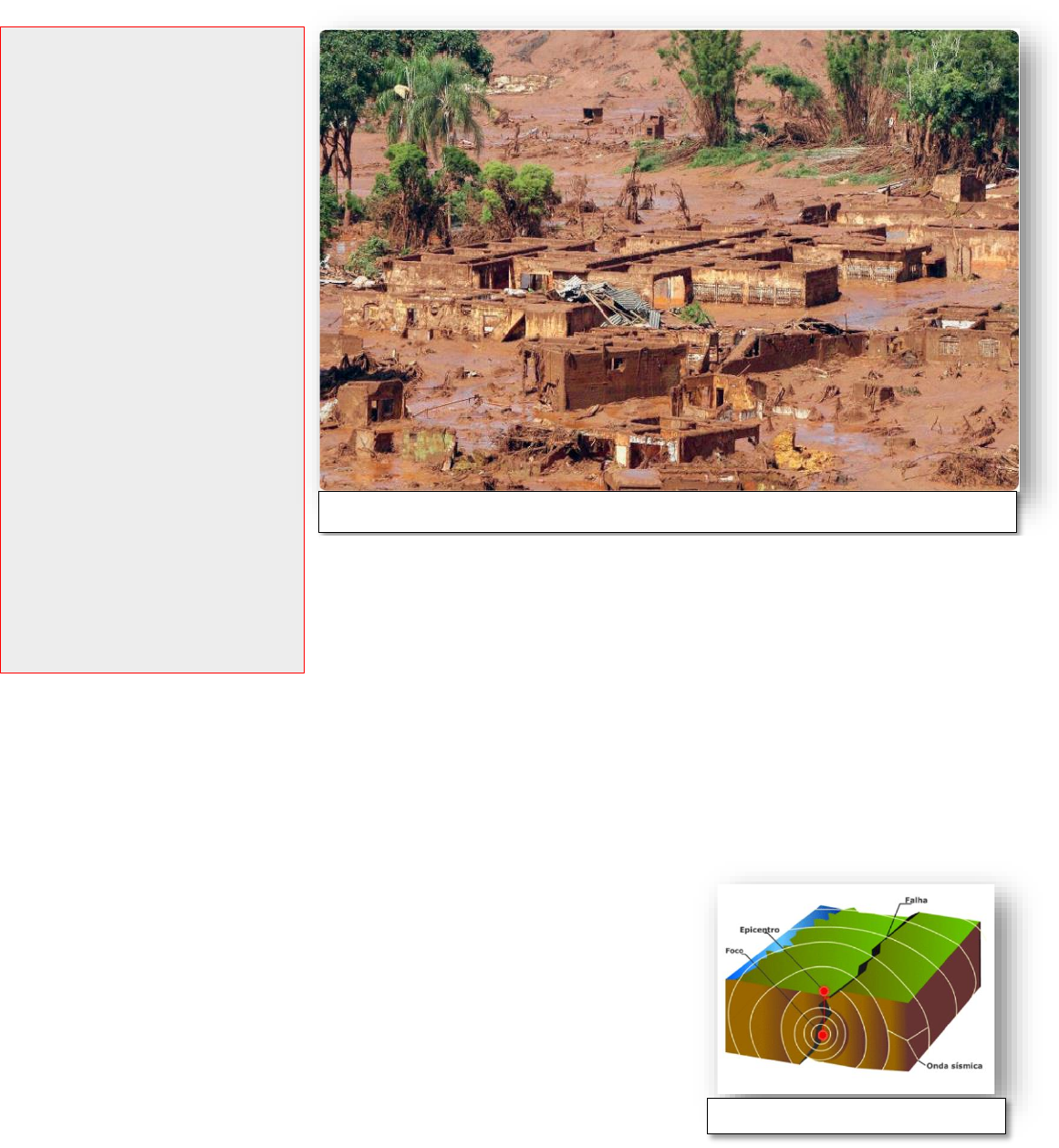 Impactos ambientais 1. Definição ❑ Chamamos de impacto ambiental quando há alteração significativa no meio ambiente e o equilíbrio do ecossistema é rompido, sendo tal alteração provocada pela ação humana ou por fenômenos naturais. 2. Tipos de desastres naturais • Terremotos (sismos) e maremotos (tsunamis): também chama- dos de abalos sísmicos, representam fenômenos de vibração brusca e passageira da superfície da terra que ocorrem por meio da movimentação das placas rochosas, de vulcões e do desloca- mento de gases no interior do planeta. Fenômenos naturais são episódios que ocor- rem na natureza, como por exemplo, o nasci- mento de um bebê, o crescimento de uma planta, a chuva, dentre muitos outros. Eles ocorrem naturalmente. Os tornados, as ava- lanches, os deslizamen- tos, tsunamis, apesar de serem desastres na- turais, ocorrem devido a um fenômeno natural e se é um fenômeno, sig- nifica que pode ser ob- servado, descrito e ex- plicado. Deslizamento de barragem de extração de minérios em Mariana – MG. O Planeta Terra está sofrendo cada vez mais, com o aqueci- mento global e o efeito estufa, o que leva ao aumento dos desastres naturais, ocasionados pelo desequilíbrio da na- tureza. Para os seres humanos, muitos danos e prejuízos são resultantes dos desastres naturais, que geram diversos im- pactos na sociedade. Representação de um terremoto Os maremotos ou tsunamis são terremotos que ocorrem dentro dos mares, provocando imensos deslocamentos de água. Furacões, ciclones e tufões: um tufão, furacão ou ciclone tropical é um fenômeno mete- orológico que se caracteriza por uma imensa massa de ar que variam em temperatura e veloci- dade, podendo atingir uma área e arrasar cida- des inteiras. • Seca: intensificada nos últimos anos com o aquecimento global, a seca tornou-se um problema en- frentado por muitos grupos pelo mundo. Dessa forma, as alterações climáticas demonstram que diver- sas foram as consequências das ações humanas durante séculos no planeta, gerando problemas como a seca. Uma das regiões que sofre com a seca constante é a região semiárida do nordeste, o que acarreta a migração de muitos grupos de pessoas, pois em uma terra tão seca, o cultivo de alimentos se torna muito difícil. • Inundações: ocorrem quando a chuva é muito intensa, geralmente acima da média esperada e não tem para onde escoar, por isso acabam se acumulando e causando vários desas- tres. Em cidades onde existem buei- ros, na maioria das inundações é de- vido ao acúmulo de lixo que a popula- ção joga nas ruas, o que causa o en- tupimento e o consequente alaga- mento em épocas de chuva. Outros fatores que contribuem para esse cenário são o desmatamento, a im- permeabilização do solo com o asfalto, crescimento urbano desordenado, má rede de captação de esgoto. Representação de um maremoto Inundação em Valparaíso - GO Tempestades: podem ser de chuva, de granizo ou neve. Dependendo da in- tensidade, podem causar a perda de colheitas inteiras, deslizamentos de terra, derrubar árvores e torres de energia.