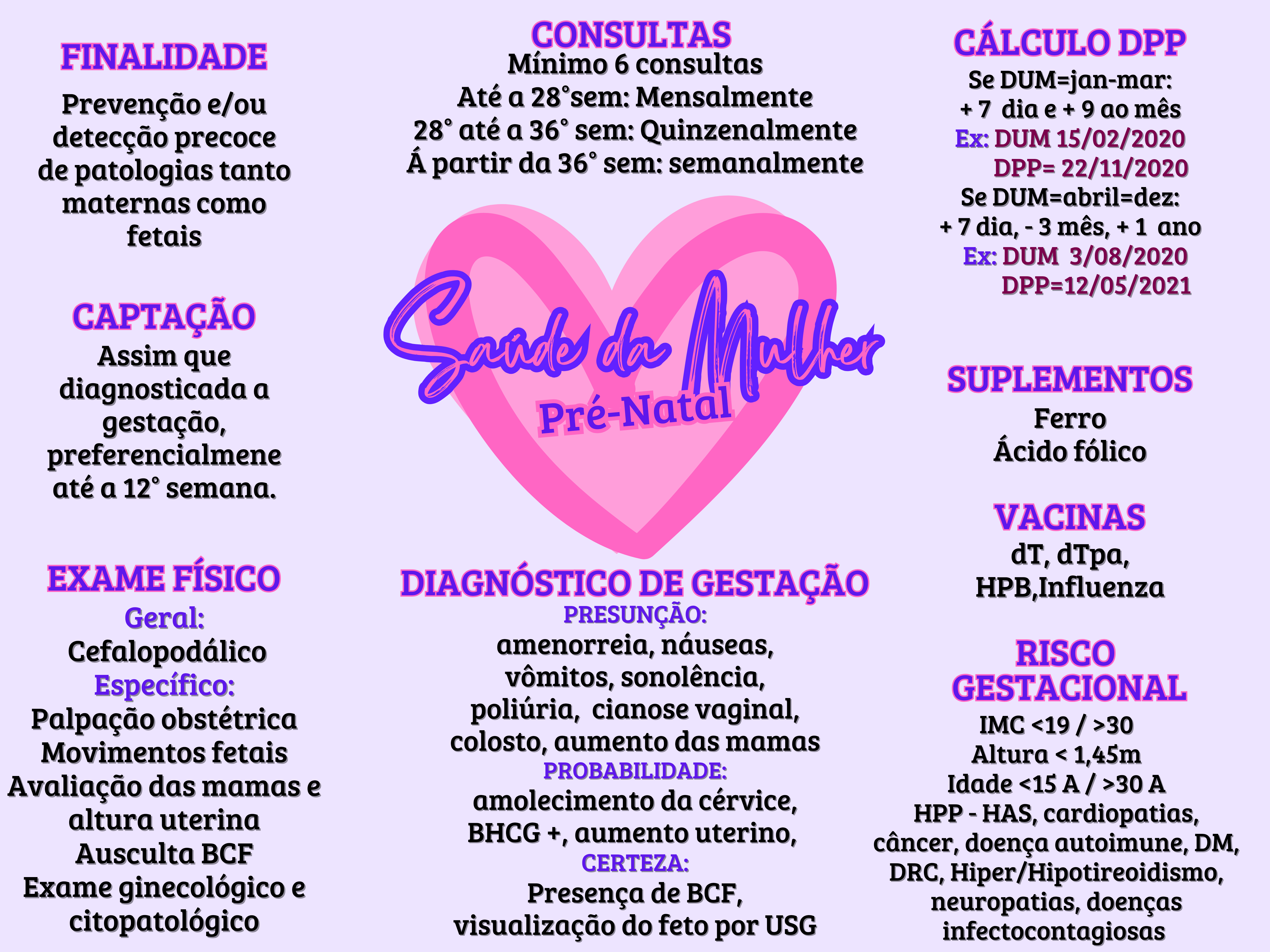CONSULTAS FINALIDADE CÁLCULO DPP Mínimo 6 consultas Até 28°sem: Mensalmente Se DUM=jan-mar: Prevenção e/ou +7 dia e + 9 ao mês detecção precoce 28° até a 36° sem: Quinzenalmente Ex: DUM 15/02/2020 de patologias tanto Á partir da 36° sem: semanalmente DPP= 22/11/2020 maternas como Se DUM=abril=dez: fetais + 7 dia, - 3 mês, + 1 ano Ex: DUM 3/08/2020 DPP=12/05/2021 CAPTAÇÃO Assim que da diagnosticada SUPLEMENTOS gestação, Pré-Natal Ferro preferencialmene Ácido fólico até a 12° semana. VACINAS EXAME FÍSICO dT, dTpa, DIAGNÓSTICO DE GESTAÇÃO HPB,Influenza Geral: PRESUNÇÃO: Cefalopodálico amenorreia, náuseas, RISCO Específico: vômitos, sonolência, GESTACIONAL Palpação obstétrica poliúria, cianose vaginal, IMC 30 Movimentos fetais colosto, aumento das mamas Altura 30A amolecimento da cérvice, altura uterina HPP - HAS, cardiopatias, BHCG +, aumento uterino, Ausculta BCF câncer, doença autoimune, DM, CERTEZA: Exame ginecológico e DRC, Hiper/Hipotireoidismo, Presença de BCF, neuropatias, doenças citopatológico visualização do feto por USG infectocontagiosas