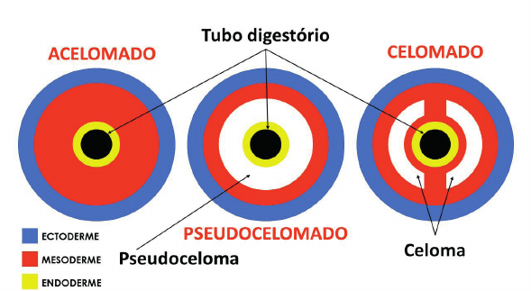 Biologia 171 Pró-Reitoria de Extensão – PROEX triblásticos (ou tribloblásticos). Os cnidários (como água-viva e anêmona-do-mar), porém, só possuem dois dos folhetos – ectoderme e endoderme – e são denominados diblásticos (ou diploblásticos). Tais classificações não se aplicam às esponjas, pois estas não formam tecidos por não atingirem a fase de gástrula. Além do tubo digestório, alguns animais triblásticos apresentam outra cavi- dade com líquido, o celoma. Os platelmintos (como planárias e tênias) não possuem celoma, ou seja, têm corpo maciço e são denominados acelomados (sem celoma). Os triblásticos que possuem cavidade corporal se subdividem em dois tipos: celomados e pseudocelomados. Os celomados possuem o celoma, uma cavidade envolta por células da mesoderme. Os pseudocelomados possuem pseudoceloma, uma cavidade envolta parcialmente por mesoderme e parcialmente por endoderme. Figura 105: Esquema simplificado das cavidades internas de animais triblásticos acelomados, pseudocelomados e celomados Fonte: Elaborada pela autora. Em resumo, os animais triblásticos – excluídos, portanto, os diblásticos (cnidários) e os que não formam folhetos germinativos (esponjas), pois não formam celoma ou pseudoceloma – podem ser divididos em: 1. Acelomados: platelmintos 2. Pseudocelomados: nematódeos. 3. Celomados: moluscos, anelídeos, artrópodes, equinodermos e cordados. Na fase embriológica de neurulação, inicia-se o processo de diferenciação dos grupos de células que formarão os tecidos e, posteriormente, os órgãos. Cada folheto germinativo é responsável por formar as diferentes estruturas do corpo: • Ectoderme: pele, unhas, pelos, esmalte dos dentes, encéfalo, medula e nervos. • Mesoderme: pele (camada mais profunda), musculatura, cartilagem, ossos, medula óssea, sangue, linfonodos, sistema urinário e genital. 172 Ciências da Natureza Pró-Reitoria de Extensão – PROEX • Endoderme: revestimento interno do tubo digestório, fígado, pâncreas, siste- ma respiratório, bexiga. Além do embrião, durante o processo inicial de desenvolvimento, os ani- mais podem dispor de estruturas adicionais, os anexos embrionários. São estruturas derivadas dos folhetos, que não fazem parte do embrião, mas auxiliam o seu desen- volvimento. São elas: o saco vitelínico (nutrição do embrião), alantoide (armazena excretas do embrião), âmnio (evita o dessecamento e amortece choques térmicos e mecânicos) e cório (membrana mais externa que, nos mamíferos, origina a placenta). Figura 106: Esquema dos anexos embrionários animais Fonte: . Acesso em: 17 set. 2015. Embora existam muitos filos no Reino Animal, neste material serão abor- dados nove deles: 1. Filo: Porífera (poríferos). Exemplo: Esponjas Esponja