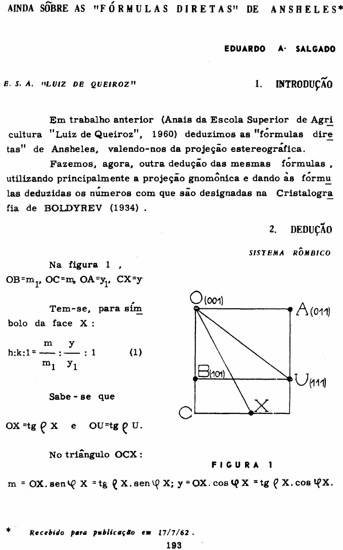 AINDA SOBRE AS " F Ó R M U L A S D I R E T A S " DE A N S H E L E S * EDUARDO A. SALGADO E. S. A. " LUIZ DE QUEIROZ" 1. INTRODUÇÃO Em trabalho anter ior (Anais da Escola Superior de Agri cultura "Luiz de Queiroz", 1960) deduzimos as "formulas dire tas" de Ansheles, valendo-nos da projeção estereografica. Fazemos, agora, outra dedução das mesmas formulas , utilizando principalmente a projeção gnomônica e dando as formu Ias deduzidas os números com que são designadas na Cris ta logra fia de BOLDYREV (1934) . 2. DEDUÇÃO SISTEMA ROMB1CO Na figura 1 , OB=m I, OC=m, OA=y1, CX=y 0 Tem-se , para sim bolo da face X : m y h:k:l = : : 1 (1) m i y i Sabe - se que OX=tgÇ>X e OU=tg Ç U. No triângulo OCX: F I G U R A 1 m = O X . s e n ^ X =tg ÇX.sen^>X; y = OX.cos l fX =tg ^ X . c o s » f X . Do triângulo AOU t i r a - s e , ide nticam ente : m 1 = tg ^ U . sen 4f U; y x = tg Ç U . cos <Sp U Levando os valores ass im obtidos em (1), vem : tg 0 X . sen <Q X tg 0 X . cos <p X h : k : 1 = - : : 1. tg £ U . sen U tg (> U . cos q> U cotg f X Multiplicando por obtem-se [ 14 | . cotg £ U y v i T e m - s e : cotg Cf X = e cotg íp U = . m De (1) t i r a - s e : y k y x k = . cotg if X = . cotg<pU [ l 5 ] m h m^ h SISTEMA HEXAGONAL Simbolo da face X (suprimindo o indice relativo ao eixo W ) : OC CX h : k : 1 = : :1 (1; OA OU No triângulo OCX obtem-se (figura 2) : Pr ime i ro caso-or ien tação segundo £ 001 ^ T e m - s e (figura 3 ) : OR = tg £ R, RC = m, RB = m ^ BU = y 1 # CX = y, OX=tg Ç X, OU * tg £ U. Símbolo de X : m y h:k:l * : —— : 1 (1) m l *1 Da figura 3 obtém-se: OC CX OX s e n ( f x sen ^90-( f X + 3 0 ) | sen 120 o c c x tg Ç x • ' (2 ) sen tf X sen ( 60 - <Ç X) sen 60 Levando em (1) os valores de OC e CX, t i rados de ( 2 ) e. ainda, OA = OU • tg Ç U, t e m - s e : tg £ X . sen <? X tg (> X . sen ( 60 - <f> X ) h : k ; 1 = : tg £ U . sen 60 tg. f U . sen 60 c o t g t f X % Multiplicando por 7 • •• chega-se a ^ 26 J cotg ^ U De (1) t i r a - s e : OC = h . tg Ç U e CX = k . tg £ U. Levando estes valores em (2) : h 2k h + 2k r - = _ • . : . c o t g f X = - = [ 2 7 ] sén ^ X \(3cos Vf X - sen vf X " p h SISTEMA MONOCLÍNICO m = OC - OR = tg £ X . serUf X - tg Ç R; m 1 = OB - OR = t g £ U. . sen <f U - tg £ R; y = tg f> X . cos <p X; y x * tg f U . . c o s í f U (2). Levando-se es tes valores em (1) chega-se a [ ^ ] OR + m tg £ R + m Tem-se , ainda: t g l ^ X = = —————— y y Substituindo aqui m e y, respectivamente, por hm^ e ky^, valores t i rados de (1), e substituindo m^, y^ pelos seus valo r e s (2), obtem-se : h tg Ç R (1 - h) t g C f X = t g t f u + [ 9 ] k k . tg £ U . cos fP U Segundo caso-orientação segundo ( 001 ) A face X, de sim bolo (hkl), determina nos eixos cristalograficos X , Y , Z , respectivamente, as intersecções a b e OA = — , OB = , OC - —: h k 1 Da figura 4, con tendo os eixos X , Y e na qual OD e normal a AB , t i r a - s e : a b OD=—sen<fX=— cos<f X (1) h k Tome-se um eixo auxiliar OZ 1 , no plano XOZ, que seja normal ao plano XY e no qual a face X determina a inter se cção OE ( figura 5 ) . Sendo se melhantes os triângulos AOE e AFC, t em-se : OE OA = ( 2 ) CF OA + OF Tem-se , ainda : c CF = . cos ( Ç -90) , OF = . s e n ( Ç -90). 1 1 Levando es tes valores de CF e OF e, ainda, de a ac . sen Ç OA = em (2), obtem-se: OE = ( 3 ) . h al - ch . cos $ Sabe-se que ? P=180-Ç . V s e n ( l 8 0 - Ç ) = = sen $ = sen f P e cos(180-Ç) = = -cos £ = cos f P . Substituindo em (3) , t em-se : ac . sen ^ P OE = (4). al + ch . cos £ P Da figura 6 obtem-se: OD = OE.cotg £ X . Substituindo aqui OE pelo seu valor (4), t e m - s e : ac . sen P P . cotg 0 X OD = — — (5). De (5) obtem-se: al + ch . cos Ç P ac . sen Ç P . cotg P X ch . OD . cos Ç P 1 = (6) a . OD a . OD Substituindo em (6) h por a s e n ^ X , valor t irado de OD (1), e multiplicando o segundo membro por OD, vem : 1 = c ^ sen £ P . cotg £ X - sen^f X . c o s £ p | . Temos, então: h = asen <p X; k = bcos X; 1 = c ^ s e n ^ P . cotg £ X - sen *f X . cos J P | . Dividindo os t r ê s indices por sen ^ P, t em-se : asen((ÍX bcos <pX f 1 h = — , k = , 1 = c i cotg Ç X-cotg f P . s e n f X V (7) sen J P sen f P l J T e r - s e - a , para a face parametra l : asenÇU bcos <P U t \ 1 = . 1 = f i = c J cotg{ U - cotgf P s e n f uV (8) sen Ç P sen f P Tirando de (8) os valores de sen £ P e c e levando- -os em (7) obtem-se, finalmente : senípX cos <f X cotg Q P . sen <P X-cotg Ç X h:k:i = : ; • [ l l ] sen<pU cos 9 U cotg £ P . sen if U-cotg f U SISTEMA TRICLl'NICO Pr imei ro caso-orientação segundo foOl ] MA^ CX Simbolo de X : h : k : l = : — h (1 ) MB DU T e m - s e (figura 7): UA1 = OA x - OM (2) Tem-se : no t r ian guio OEX, OE = tg Ç X . sen <f X ; ; no triângulo OEA^ , OE tg 0 X .sen IPX OA = - ± ; sen <0P sen *f P no triângulo OFR , OF = tg f R . sen f R OF tg Ç R . sen R e no triângulo OFM , OM = = . sen <p P sen <f P Levando os valores de OA^ e OM em (2), vem : tg P X . sen Cp X - tg P R . sen <p R MA = (3) sen *f P T e r - s e - a , identicamente : tg 0 U . sen (0 U - tg 0 R . sen R MB = 2 (4) sen If P Do triângulo OAX t i r a - s e : AX = t g £ X. sen («f P - 1$ X) e do triângulo AXAX : A X ^ X . c o s A • Y A j X . c o s A = tg Ç X . sen (<Ç P - <f X) ( 5 ) T e m - s e , no triângulo ORT: RT=tg £ R. sen (<f P - <f R) e no triângulo MRT: RT = MR. cos.£ = AjC. cos A »V A 1 C cos A = = tg ^ R . sen ( Vf P - ^ R) ( 6). T e m - s e : CX = A^X-A^C . Substituindo, nesta expressão, A..X e A t C pelos valores obtidos em (5) e (6), obtem-se : tg ç X . sen( (p P - Cf X) - tg Ç R . sen ((p P - (p R) CX = (7) COS A Obte r - se -a , de maneira idêntica : tg ç U . sen( t pP -< t fU) - tg Ç R . sen ( ip P - <p R) DU = (8) COS A Levando os valores obtidos em (3), (4), (7) e (8) na ex pressão (1) chega-se a formula [2] . Segundo caso-orientaçâo segundo (001) Na figura 8 estão representados os eixos 