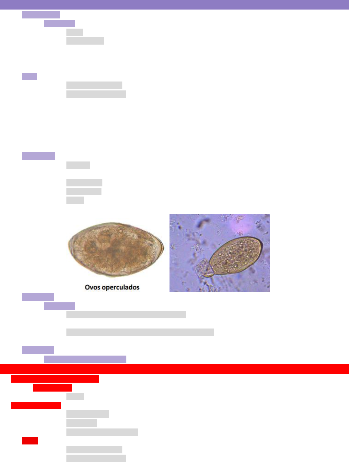 ㅤㅤㅤㅤㅤㅤㅤㅤㅤㅤㅤㅤㅤㅤㅤㅤㅤ FASCIOLA HEPÁTICAㅤㅤㅤㅤㅤㅤㅤㅤㅤㅤㅤㅤㅤㅤㅤㅤㅤㅤ ● Trematódeo ○ Fasciolose ■ Local: Encontrado no fígado e ductos biliares de ser humanos, ovinos e suínos (reservatório) ■ Transmissão: Fecal-oral ■ Conhecido como baratinha do fígado ■ Áreas alagadiças, úmidas, sujas e em inundações ■ SC/SP/PR/RJ/MG/MT/BA ● Cíclo ■ Estágio infectante: Meta-cercária ■ Estágio diagnóstico: Ovos ○ Ovo é liberado no ambiente aquático, amadurece, eclode liberando o miracídeo (forma móvel) que por sua vez penetra a pele do caramujo (Lymnaea sp); ○ Após maturado, libera-se no ambiente a cercária (forma flagelada), que ao penetrar plantas aquáticas, perde o rabo e vira uma meta-cercária (forma infectante) ○ Ingesta do alimento contaminado pelo ser humano; ○ Após contaminação, ela se dirige através do ID e localiza-se no fígado. ● Morfologia ■ Vermes: 3cm de comprimento, hermafrodita, duas ventosas com espinhos cuticulares na superfície anterior ■ Localização: Habitam o fígado (agudo) e os canais biliares (crônico). ■ Hospedeiro: Homem é hospedeiro ocasional, menos comum. ■ Ovos: Chegam as fezes pelos ductos biliares (conectam fígado-intestino pela bile). 130 µm, opérculo na extremidade que pode estar aberto ou fechado. ● Patogenia ○ Fasciolose ■ Processo inflamatório crônico no fígado: Causa destruição do parênquima fibrose, esteatose, cirrose. ■ Processo inflamatório crônico nos ductos biliares: Causa diminuição do fluxo biliar. ○ Nos animais é um processo mais grave. ● Patogenia ○ Pesquisa de ovos nas fezes: Métodos gerais, pois são ovos pesados (Hoffman, Ritchie e MIFC). ㅤㅤㅤㅤㅤㅤㅤㅤㅤㅤㅤㅤㅤㅤ ㅤㅤHIDATIDOSEㅤㅤㅤㅤㅤㅤㅤㅤㅤㅤㅤㅤㅤㅤㅤㅤㅤㅤㅤㅤㅤ ● Echinococcus granulosus ○ Cestódeo ■ Fases: Larva adulta, cisto hidático, ovo. ● Hospedeiros: ■ Intermediário: Ovinos e caprinos ■ Definitivo: Cães ■ Acidental-intermediário: Ser humano ● Ciclo: ■ Estágio infectante: Ovos ■ Estágio diagnóstico: Cisto hidático ○ Semelhante ao da teníase. Verde adulto no intestino libera ovos embrionados nas fezes, nos caprinos/ovinos a oncosfera se rompe e penetra a parede intestinal, formando cistos hidáticos no fígado, pulmões, etc., amadurecendo e virando um protoscolex → scólex que se fixa no intestino, liberando proglotes. ● Morfologia: ■ Larva adulta: 2-5mm, 3 a 6 proglotes, intestino canino e libera ovos embrionados nas fezes. ■ Ovos: 35 µm, levemente esféricos, possui oncosfera (embrião) interior, membrana externa (embrióforo). É o estágio infectante para o homem e é liberado nas fezes do cão (hosp. definitivo). ■ Cisto hidático: Fixado nos pulmões e fígado, menos comum em M.O e cérebro. Migram pela corrente sanguínea e fixam-se nos órgãos. É o estágio de DX do homem, transmissão ao cachorro (comer vísceras de animais contaminados). Possui estruturas que se fixam no hospedeiro definitivo (cão) e formam o verme adulto (escólex) Gera fibrose no tecido do hospedeiro intermediário e cria uma membrana adventícia (ciclo interrompido). ● Patogenia: ○ Mais comuns, ordem decrescente (do mais comum ao menos): ■ Hidatidose hepática: inflamação, esteatose hepática, cirrose, fibrose ■ Hidatidose pulmonar: compressão dos brônquios e alvéolos ■ Hidatidose cerebral: dependem da área afetada ■ Hidatidose óssea: fratura espontânea, destruição óssea, alterações medulares. ○ Sintomas dependem da localização da hidátide, maioria cresce lento e assintomático. ● Diagnóstico ○ Humanos: Diagnóstico clínico + exames de imagem (cistos rompidos, íntegros), TC, RNM, RX, biópsia. ○ Cão: Métodos de sedimentação espontânea (Hoffman, Ritchie e MIFC). ㅤㅤㅤㅤㅤㅤㅤㅤㅤㅤㅤㅤㅤㅤ COPROLÓGICO FUNCIONALㅤㅤㅤㅤㅤㅤㅤㅤㅤㅤㅤㅤㅤㅤㅤ ● Etapas ○ Análises macroscópicas ○ Análises microscópicas ○ Analise da digestibilidade ● Funções: ○ É complementar, ajuda a investigar: ■ Disfunções intestinais: intolerâncias alimentares, parasitoses, sd. intestino curto, sd. intestino irritável, gastrectomias, doença de Crohn, doença celíaca, pancreatíte aguda/crônica, colite ulcerativa... ■ Dieta: Pode precisar de dietas específicas, tem laboratórios que utilizam a dieta para analisar itens específicos, outros que não utilizam para poder avaliar o daily-basis do paciente. ● Recomendações ○ Variam entre laboratórios: ■ Evitar 3 dias antes da coleta: Bebidas alcoólicas, laxantes, exames com contraste VO. ■ 12 anos: Manter dieta habitual, três dias antes do exame incluir alguns itens como: carne, batata, feijão, manteiga, leite. ● Análise macroscópica ○ Consistência/forma: ■ Formadas/sólidas, pastosas, líquidas/diarreicas. ○ Odor: ■ Sui generis/anormal ○ Presença de elementos anormais → Sangue, muco, resíduos alimentares. ● Análise microscópica ○ Quantificação em ausente/presente (+, ++, +++). ■ Parasitas; ■ Fibras; ■ Células vegetais/epiteliais; ■ Celulose; ■ Leucócitos; ■ Leveduras; ■ Hemácias. ○ Fibras musculares ■ Mal digeridas: Cilíndros alongados com estrias visíveis (arestas com pontas) ■ Bem digeridas: Formato irregular com arestas arredondadas, sem estrias (ou pouco visíveis) ■ Digestão normal: Resíduos de fibras bem digeridas ■ Alteração na digestão: fibras mal digeridas ○ Amido (roxo): ■ Podem ser isolados ou agrupados: Grande quantidade nos feculentos. ■ Grande quantidade de amido nas fezes: amilorreia ○ Células vegetais ■ Formato irregular, possui membrana, indica processo digestivo alterado. ■ Presença indica processo digestivo alterado ○ Células epiteliais ■ Indica lesão na mucosa intestinal ou contaminação com urina. ○ Celulose ■ Digerível: Formato de favo de me