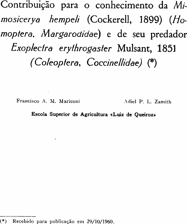 Contribuição para o conhecimento da Mi¬ mosicerya hempeli (Cockerell, 1899) (Ho¬ moptera. Margarodidae) e de seu predador Exoplectra erythrogasfer Mulsant, 1851 (Co/eoptera, Coccinellidae) (*) Francisco A. M. Mariconi Adiei P. L. Zamith Escola Superior de Agricultura «Luiz de Queiroz» (*) Recebido para publicação em 29/10/1960. 1. INTRODUÇÃO Em princípios de maio de 1959, várias árvores do jardim do Instituto Educacional "O Piracicabano", em Piracicaba, atraíram a nossa atenção, por sofrerem intensa infestação de cochonilhas. As árvores, de objetivo ornamental e conhecidas como "cássia im perial" e "chuva de ouro" (Cassia fistula Linneu), estavam reco bertas de insetos: muitos galhos, inclusive vários grossos e longos, estavam mortos e outros, de todos os diâmetros, encontravam-se em deperecimento. As plantas, em número de 7, compreendiam 4 covas e, nestas havia 3, 2, 1 e 1 planta. A altura das árvores era de cerca de 5 a 7 metros. Graças ao material da coleção do Instituto Biológico (São Paulo), logo determinou-se a cochonilha como Mimosicerya hem peli (Cockerell, 1899) (Homoptera, Margarodidae), espécie pouco conhecida. Visto quase nada haver sobre o coccídeo e ser interessante verificar o efeito de inseticida sistêmico contra o mesmo, interessa- mo-nos pelo assunto. O sistêmico foi introduzido na planta, por irrigação e injeção. Em alguns paises de Silvicultura bem desen volvida, combatem-se várias pragas de árvores, com a injeção de sistêmicos. Infelizmente, não obtivemos resultados práticos com o com bate químico e várias razões são apontadas para o malogro. Com o decorrer de nossas observações, estudamos também a "joaninha" Exoplectra erythrogaster Mulsant, 1851 (Coleoptera, Coceinellidae), inimiga natural do coccídeo. A identificação do predador foi bem mais difícil, pois não estava presente nas cole ções examinadas. 2. SINONÍMIA DA COCHONILHA ' MIMOSICERYA HEMPELI (COCKERELL, 1899) Icerya hempeli Cockerell, Can. Ent. 31, p. 43, 1899. Crypticerya hempeli (Cockerell), Hempel, Rev. Mus. Paul. 4, p. 376, 1900. Mimosicerya hempeli (Cockerell), Cockerell, The Entom. 35, p. 233, 1902. Costa Lima, Terc. catál. ins. Brasil, p. 198, 1936. Lepage, Rev. Mus. Paul. 23, p. 428, 1938. Costa Lima, Ins. Brasil (3.° vol.: Homop.), p. 204, fig. 172, 1942. Vernalha, Arq. Biol, e Tecnol. 8, p. 204, 1953. Mariconi e Zamith, O Biol. 25, p. 258, fig. 1-2, 1959. Palaeococcus hempeli (Cockerell), Hempel, Catál. fauna brasil., p. 17, 1912. Costa Lima, Arq. Esc. Sup. Agric. e Med. Vet. 6, p. 121, 1922 (1923). Costa Lima, Arq. Esc. Sup. Agric. e Med. Vet. 8, p. 102, 1927 (1928). Clypeococcus hempeli (Cockerell), Newstead, Bull. Ent. Res. 10, p. 175, 1920. 3 . HISTÓRICO COCKERELL (1899) descreve a fêmea, nova espécie para a Ciência. Denomina-a Icerya hempeli, em homenagem ao coccido- logista A. Hempel, de São Paulo, que lhe enviara o inseto. Como "habitat" menciona Campinas (São Paulo) e, como hospedeiro duvidoso, a Mimosa sp. HEMPEL (1900) traduz para o português a diagnose original porém, coloca o inseto no gênero Crypticerya. Como hospedeiro confirma ser a Mimosa sp. COCKERELL (1902) cria o gênero Mimosicerya, e neste coloca sua espécie. HEMPEL (1912) acrescenta Bauru (São Paulo) à distribuição geográfica e cita a sinonímia. O inseto foi, desta vez, posto no gênero Palaeo coccus, NEWSTEAD (1920) cria o gênero Clypeococcus, para o coccídeo, redescreve a fêmea e descreve a ninfa do 1.° estágio. Seu material constou de exemplares encontrados numa pequena coleção de coccídeos brasileiros, levada de São Paulo para a Inglaterra. COSTA LIMA em 1922 (1923), 1927 (1928) e 1936 arrola o mar- garodídeo como um dos insetos prejudiciais às plantas. Nas duas primeiras vezes, a cochonilha é colocada no gênero Palaeococcus e na última, em Mimosicerya. No trabalho de 1936, também consta a lista sinonímica e, Minas Gerais é acrescentada ao "ha bitat" e o barbatimão aos hospedeiros. LEPAGE (1938) dá ordem à lista sinonímica e bibliográfica. COSTA LIMA (1942) publica uma fotografia de exemplares sobre um ramo. VERNA- LHA (1953) cita a sinonímia e bibliografia. À distribuição acres centa o Paraná. MARICONI e ZAMITH (1959) redescrevem a fêmea adulta, citam notas bionômicas, põem em execução tentati vas de combate (irrigação do solo por inseticida sistêmico, e tam bém por injeção do mesmo tóxico na planta hospedeira), estudo de uma "joaninha" predadora, e tc . 4 . DISTRIBUIÇÃO GEOGRÁFICA A cochonilha é mencionada em São Paulo, Minas Gerais e Paraná; em São Paulo, o inseto é conhecido em Campinas (donde proveio o material para a descrição original), Bauru, Piracicaba, lpaussu, Itararé e Santa Rita do Passa Quatro (Piracicaba segundo nossas observações e as três últimas, segundo os exemplares da coleção do Instituto Biológico). No nosso trabalho anterior (1959, demos o Paraná como novo "habitat" porém, já havia sido registrado por Vernalha, em 1953. Recentemente, verificamos a ocorrência em Assis e Ribeirão Preto. 5. PLANTAS HOSPEDEIRAS Conhecem-se apenas a Mimosa sp., Stryphnodendron barba- timao Mart, (barbatimão), Pipttídenia macrocarpa Benth, (angico do campo), Cassia sp. e Cassia fistula L. (chuva de ouro ou cássia imperial). As três últimas, como escrevemos em trabalho an terior, foram registradas por nós; a cássia imperial foi acrescen tada de acordo com as nossas observações e as outras, segundo as etiquetas de exemplares da coleção do instituto Biológico. Em março de I960, verificamos forte infestação em alecrim (Holocalyx sp.) e Caesalpinia sp. na cidade de Assis. 6. DESCRIÇÃO (Est. I - Fig. A. B, C, D, E, F, G, H) Ôvo (Fig. H) : de coloração alaranjada, elíptico e de 0,9 a 0,95 mm de comprimento. Cório rugoso, com cristas longitudi nais, baixas e um tanto sinuosas. Ninfa do 1.° estágio (Fig. E): corpo róseo-alaranjado, co berto de tênue pubescência cére