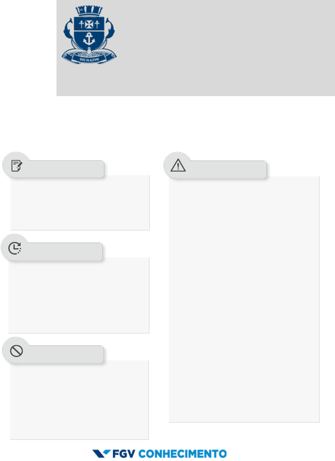 PREFEITURA DE CARAGUATATUBA CONCURSO PÚBLICO – EDITAL Nº 03/2023 TARDE TÉCNICO DE ENFERMAGEM NÍVEL MÉDIO TIPO 1 – BRANCA Além deste caderno contendo 50 (cinquenta) questões objetivas, você receberá do fiscal de prova o cartão de respostas; As questões objetivas têm 5 (cinco) opções de resposta (A, B, C, D e E) e somente uma delas está correta. Verifique se seu caderno de questões está completo, sem repetição de questões ou falhas. Caso contrário, notifique imediatamente o fiscal da sala, para que sejam tomadas as devidas providências; Confira seus dados pessoais, especialmente nome, número de inscrição e documento de identidade e leia atentamente as instruções para preencher o cartão de respostas; Para o preenchimento do cartão de respostas, use somente caneta esferográfica, fabricada em material transparente, com tinta preta ou azul; Assine seu nome apenas no(s) espaço(s) reservado(s) no cartão de respostas; Confira seu cargo, cor e tipo do caderno de questões. Caso tenha recebido caderno de cargo ou cor ou tipo diferente do impresso em seu cartão de respostas, o fiscal deve ser obrigatoriamente informado para o devido registro na ata da sala; Reserve tempo suficiente para o preenchimento do seu cartão de respostas. O preenchimento é de sua responsabilidade e não será permitida a troca em caso de erro cometido pelo candidato; Para fins de avaliação, serão levadas em consideração apenas as marcações realizadas no cartão de respostas; A FGV coletará as impressões digitais dos candidatos na lista de presença; Os candidatos serão submetidos ao sistema de detecção de metais quando do ingresso e da saída de sanitários durante a realização das provas. Boa sorte! Você dispõe de 3 (três) horas para a realização da prova, já incluído o tempo para a marcação do cartão de respostas; 1 (uma) hora e 30 (trinta) minutos após o início da prova, é possível retirar-se da sala, sem levar o caderno de questões; A partir dos 30 (trinta) minutos anteriores ao término da prova é possível retirar-se da sala levando o caderno de questões. Qualquer tipo de comunicação entre os candidatos durante a aplicação da prova; Anotar informações relativas às respostas em qualquer outro meio que não seja o caderno de questões; Levantar da cadeira sem autorização do fiscal de sala; Usar o sanitário ao término da prova, após deixar a sala. SUA PROVA TEMPO NÃO SERÁ PERMITIDO INFORMAÇÕES GERAIS PREFEITURA DE CARAGUATATUBA FGV CONHECIMENTO TÉCNICO DE ENFERMAGEM – TARDE TIPO BRANCA – PÁGINA 2 Conhecimentos Gerais Língua Portuguesa 1 Observe o texto abaixo, retirado de um dicionário de curiosidades sobre o Rio de Janeiro: “ABERTURA DOS PORTOS – Monumento erigido na Praia do Russel, em comemoração ao Decreto de D. João VI, em 28/01/1808, determinando a abertura dos portos, medida que acarretou a integração do Brasil no comércio exterior. Este monumento, de bronze, é constituído por duas imagens de mulher, simbolizando o “Comércio” e a “Navegação”. O referido monumento, foi obra de Eugène Benet, escultor francês”. Os termos destacados abaixo, precedidos da preposição DE, em que essa preposição mostra o mesmo valor semântico, é: (A) de D. João VI / abertura dos portos. (B) do Brasil / de bronze. (C) de mulher / de Eugene Bènet. (D) de Eugène Benet / de D. João VI. (E) de bronze / de mulher. 2 Assinale a opção que mostra uma impropriedade léxica, ou seja, um emprego inadequado da expressão “graças a”. (A) Graças aos treinos da semana, o time apresentou-se bem. (B) O caminhão bateu no poste graças ao óleo derramado na pista. (C) Os alunos escreviam bem graças às leituras que faziam, por recomendação dos professores. (D) Graças ao tempo disponível, o operário completou a tarefa. (E) Os fiéis davam sempre graças a Deus pelos bens recebidos. 3 Parônimos são vocábulos de forma semelhante, mas com distintos significados; assim, as palavras destacadas são parônimas de outras bem semelhantes. Assinale a frase em que a palavra destacada está bem empregada. (A) O despertador é um acidente de tráfego do sono. (B) O motorista não pagou a inflação de trânsito. (C) O tráfego de drogas está ficando muito frequente. (D) O juiz não diferiu o pedido de revogação da prisão. (E) O paciente não conseguia aspirar direito no quarto abafado. 4 As opções a seguir mostram vocábulos formados com o mesmo sufixo. Assinale o vocábulo em que esse sufixo apresenta um significado diferente dos demais. (A) Um cheiro desagradável exalava do matadouro. (B) Nem todos os mestres moravam no mesmo logradouro. (C) Muitos pássaros se reuniam no bebedouro. (D) Esperava em Deus que o mal não fosse duradouro. (E) O ancoradouro estava cheio de pequenos barcos. 5 Assinale a frase em que o valor semântico da preposição ANTE é diferente do das demais frases. (A) Ante as dificuldades, preferiu transferir a viagem. (B) Ali estava de pé, ante seus olhos, o assaltante. (C) Ante tamanho esforço, todos ficaram admirados. (D) Ante o ocorrido, preferiu ficar em casa. (E) Decidiu comprar o carro, ante o empenho do vendedor. 6 Assinale a frase em que a substituição da locução sublinhada por um termo equivalente foi feita de forma adequada. (A) Vou usar o computador com modéstia. Esse equipamento invade a privacidade humana. / moderadamente. (B) Os computadores do futuro pesarão não mais que uma tonelada e meia. / futurologistas. (C) Felizes aqueles que conhecem os deuses do campo. / camponeses. (D) A natureza é um dicionário de enorme tamanho. / mensurável. (E) Os moradores dos campos são melhores que os das cidades. / urbanos. 7 Na maioria das frases, a palavra ainda mostra valor semântico de tempo. Assinale a frase – retirada do romance A Mão e a Luva, de Machado de Assis – que mostra esse valor. (A) Com o tempo, avultou outra causa de tristeza para a pobre viúva, ainda mais dolo