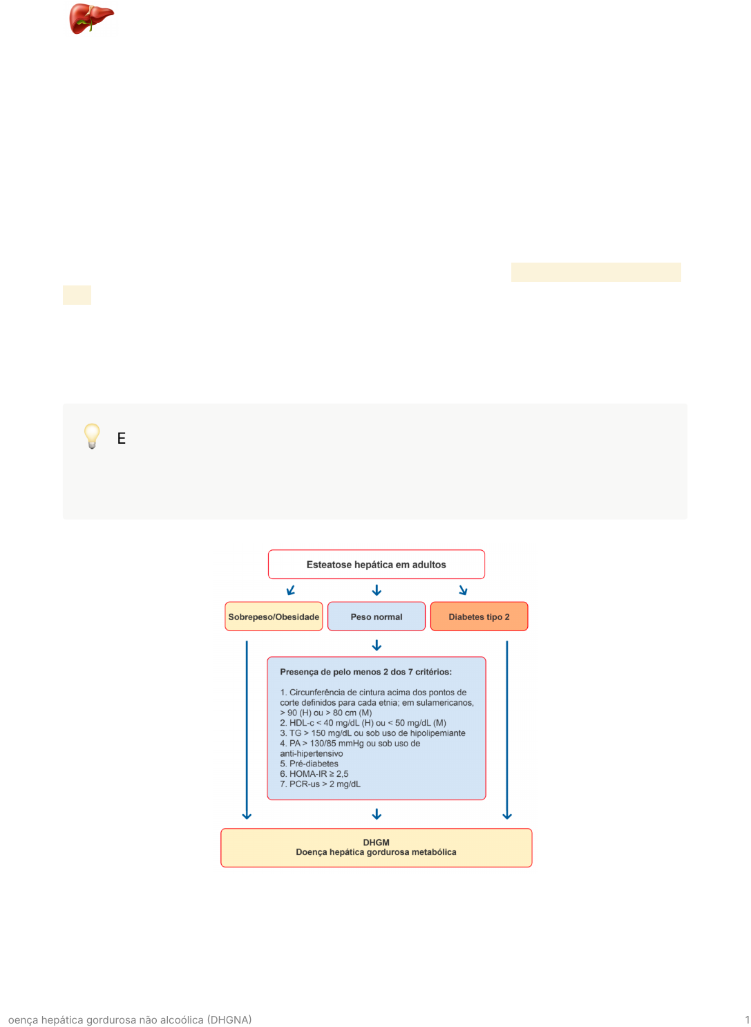 Doença hepática gordurosa não alcoólica (DHGNA) Morgana R. Duarte- TXI Doença hepática mais frequente no mundo 25% da população). Espectro de manifestações hepáticas associadas a distúrbios metabólicos e CV obesidade, resistência à insulina, HAS, dislipidemia e DM2 expressão hepática da SM. Amplo espectro de manifestações: desde um fígado gorduroso (esteatose) a esteato-hepatite não alcoólica (inflamação centrolobular e graus variados de fibrose e cirrose). 💡 EHNA é a forma mais grave de DHGNA e pode progredir para cirrose 1/3 dos casos), doença hepática em estágio terminal ou carcinoma hepatocelular. Biomarcadores hepáticos Doença hepática gordurosa não alcoólica DHGNA 1 Biomarcador Origem Função Condições que alteram AST (aspartato aminotransferase) Fígado, coração, músculo esquelético, rins e cérebro Enzima envolvida no metabolismo de aminoácidos Aumenta em hepatites virais, hepatite alcoólica, cirrose, IAM, miopatias, doenças musculares ALT (alanina aminotransferase) PP fígado Enzima específica do metabolismo hepático Aumenta em hepatites virais, hepatite alcoólica, doença hepática gordurosa não alcoólica DHGNA, cirrose GGT (gama-glutamil transferase) Fígado, rins, pâncreas Metabolismo de glutationa, marcador de colestase e indução enzimática Aumenta em doenças hepáticas alcoólicas, colestase, uso de medicamentos (barbitúricos, fenitoína) FA (fosfatase alcalina) Fígado, ossos, placenta, intestino Hidrolisa fosfatos orgânicos, relacionada à função biliar Aumenta em colestase, doença óssea Paget, osteomalácia), gestação Bilirrubina total, direta e indireta Hemólise de hemácias, fígado Produto da degradação do grupo heme, excreção biliar Aumenta em hemólise (indireta), disfunção hepática, colestase (direta) Albumina Fígado Manutenção da pressão oncótica, transporte de substâncias Reduzida em insuficiência hepática, desnutrição, síndrome nefrótica Tempo de protrombina TP Fígado (fatores de coagulação) Avalia síntese de fatores de coagulação, dependentes de vitamina K Prolongado em insuficiência hepática, deficiência de vitamina K Doença hepática gordurosa não alcoólica DHGNA 2 Tipo de bilirrubina Origem Características Metabolismo Causas de aumento Bilirrubina indireta (não conjugada) Hemoglobina das hemácias destruídas no baço Insolúvel em água, transportada pela albumina no sangue No fígado, conjugada pela UDP glicuronosiltransferase para se tornar solúvel Hemólise, eritropoiese ineficaz, síndrome de Gilbert, Crigler- Najjar, reabsorção de hematomas Bilirrubina direta (conjugada) Produzida no fígado após conjugação da bilirrubina indireta Solúvel em água, excretada na bile Excretada na bile para o intestino, onde sofre metabolismo pelas bactérias intestinais Colestase- redução ou interrupção do fluxo biliar, levando ao acúmulo de bile no fígado e no sangue (litíase biliar, tumores, hepatites, síndrome de Dubin- Johnson, Rotor) Bilirrubina total Soma da bilirrubina direta e indireta Mede a bilirrubina circulante no sangue Reflete a função hepática e a capacidade de excreção biliar Aumentada em condições hepáticas e hematológicas Patogênese Acúmulo de TGs no fígado (hepatócitos) → pode permanecer estável (esteatose simples) ou progredir. Resistência à insulina e SM → insulina não funciona adequadamente no fígado e tecido adiposo → aumento de liberação de AGL para o fígado. a Risco maior em obesos e diabéticos. Lipotoxicidade e início da inflamação → excesso de AGL e TG causa dano celular → ativação de vias inflamatórias NF-kB, JNK, IKK aparecem sinais de EHNA (esteato-hepatite não alcoólica). Disfunção mitocondrial e estresse oxidativo → produção de espécies reativas de oxigênio ROS diminuição antioxidante do fígado → intensificação da inflamação pode causar fibrose. Doença hepática gordurosa não alcoólica DHGNA 3 Microbiota intestinal e disbiose → alterações na microbiota podem influenciar a inflamação hepática → produção de metabólitos inflamatórios pelo intestino. Fatores genéticos determinam a progressão PNPLA3, TM6SF2, MBOAT7 (hispânicos têm maior risco; afro-americanos parecem protegidos.) Fibrose hepática e formação de cirrose → inflamação persistente leva à cicatrização do fígado → perda progressiva da função hepática. Cirrose criptogênica ou carcinoma hepatocelular → cirrose sem causa evidente, mas ligada à obesidade e SM. Maior risco de câncer de fígado, mesmo sem consumo de álcool. Etiologia e fatores de risco Diversas condições metabólicas e não metabólicas, particularmente doenças que cruzam com resistência à insulina e hiperinsulinemia 30%. Obesidade é um fator de risco comum e bem documentado. IMC excessivo e obesidade visceral contribuem para o risco DM2 aumenta de 24x a ocorrência de hepatopatia grave, cirrose e carcinoma hepatocelular. 50% dos pacientes apresenta dislipidemia. Risco aumenta com a idade e é mais comum no sexo masculino. 💡 SM, hipotireoidismo, deficiência de GH, hipogonadismo, apneia do sono e SOP são importantes fatores de risco para surgimento e agravamento da esteatose hepática. Doença hepática gordurosa não alcoólica DHGNA 4 História natural 2030% dos pacientes com esteatose podem progredir para EHNA em 3 anos. Mais provável se resistência insulínica, DM2, obesidade e DRC 2050% dos pacientes com EHNA em 10 anos exibirão progressão da doença → inflamação do fígado, fibrose ou cirrose (maior risco de carcinoma hepatocelular). Em quem pesquisar DHGNA? Ainda não há consenso. Rastreamento: prioritariamente restringido a indivíduos com maior risco de EHNA (com DM2, SM, testes da função hepática persistentemente alterados ou sintomas no hipocôndrio direito). Doença hepática gordurosa não alcoólica DHGNA 5 Papel da obesidade na progressão da DHGNA Alteração da microbiota inte