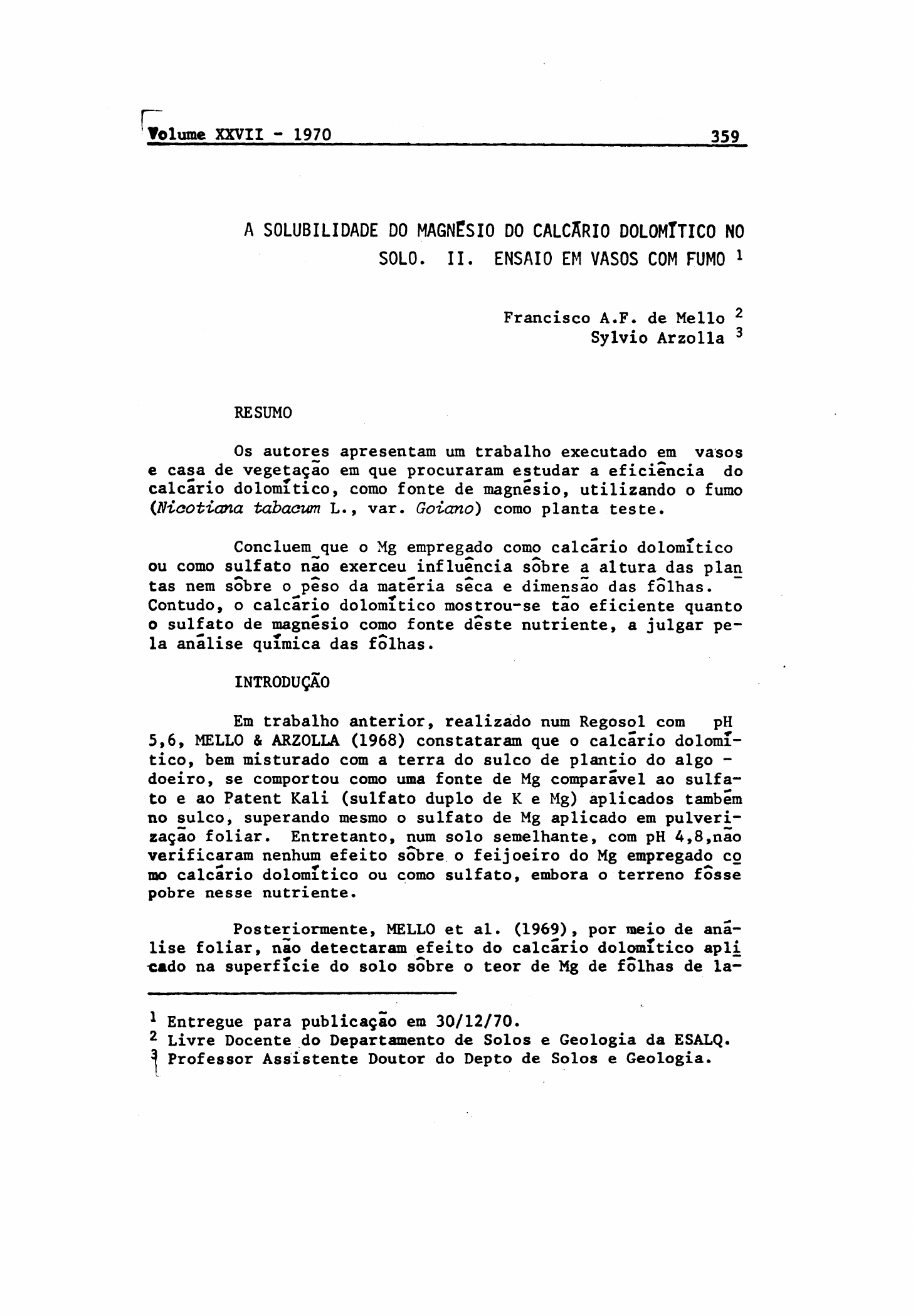 A S O L U B I L I D A D E D O M A G N E S I O D O C A L C Í R I O D O L O M T T I C O NO S O L O . I I . E N S A I O E M V A S O S C O M FUMO 1 Francisco A.F. de Mello Sylvio Arzolla RESUMO Os autores apresentam um trabalho executado em vasos e casa de vegetação em que procuraram estudar a eficiência do calcário dolomítico, como fonte de magnesio, utilizando o fumo (Niootiana tabacum L., var. Goiano) como planta teste. Concluem que o Mg empregado como calcário dolomítico ou como sulfato nao exerceu influencia sobre a altura das plan¬ tas nem sobre o peso da materia seca e dimensão das folhas. Contudo, o calcário dolomítico mostrou-se tao eficiente quanto o sulfato de magnesio como fonte deste nutriente, a julgar pe la analise química das folhas. INTRODUÇÃO Em trabalho anterior, realizado num Regosol com pH 5,6, MELLO & ARZOLLA (1968) constataram que o calcário dolomí tico, bem misturado com a terra do sulco de plantio do algo - doeiro, se comportou como uma fonte de Mg comparável ao sulfa to e ao Patent Kali (sulfato duplo de K e Mg) aplicados também no sulco, superando mesmo o sulfato de Mg aplicado em pulveri zação foliar. Entretanto, num solo semelhante, com pH A,8,nao verificaram nenhum efeito sobre o feijoeiro do Mg empregado co mo calcário dolomítico ou como sulfato, embora o terreno fosse pobre nesse nutriente. Posteriormente, MELLO et al. (1969), por meio de ana lise foliar, nao detectaram efeito do calcário dolomítico apli «ado na superfície do solo sobre o teor de Mg de folhas de la- 1 Entregue para publicação em 30/12/70. 2 Livre Docente do Departamento de Solos e Geologia da ESALQ. 3 Professor Assistente Doutor do Depto de Solos e Geologia. ranjeira. Contudo, apos o terceiro e quarto anos da aplicação o efeito foi evidente, comparável ao do sulfato de Mg e ao do Patent Kali, ambos solúveis em agua. Deve-se acrescentar que o referido experimento foi realizado num Latosol Vermelho Escu ro, pobre em Mg, com pH 4,5. Esperava-se, pois, reação favora vel ao calcário. Em experimento ainda nao publicado, MELLO & ARZOLLA incubaram calcário dolomítico com terra e constataram notável solubilizaçao do seu Mg, avaliando-a por método químico e mi crobiologic© . No primeiro trabalho mencionado, MELLO & ARZ0LLA(1968) apresentaram uma pequena revisão bibliográfica sobre a aduba - çao magnesiana. MATERIAL E MÉTODOS Utilizou-se no presente ensaio o regosol Sertaozinho do Campo Experimental da ex-Secçao Técnica "Química Agrícola", da Escola Superior de Agricultura "Luiz de Queiroz", atualmen te pertencendo ao Departamento de Solos e Geologia da mesma Escola. A terra, analisada de acordo com CATANI et al (1955) revelou as seguintes características: 0 ensaio foi realizado em vasos de barro vidrado, com coletores do mesmo material, cada vaso recebendo 15 kg de ter ra. 0 delineamento experimental foi o inteiramento casuali zado, com 4 repetições dos seguintes tratamentos: Vasos Tratamentos 1 a 4 NPK (Testemunha) 5 a 8 NPK + calcário dolomítico 9 a 12 NPK + S 13 a 16 NPK + calcário dolomítico + S 17 a 20 NPK + MgSO^ Os adubos e as quantidades empregadas por vaso foram os seguintes: Adubo g/vaso Salitre do Chile (15,5 % de N) 5,00 Sulfato de potássio (50 % de K 90) 2,00 Superfosfato simples (20 % de 6 ' 2 5 Sulfato de magnesio (16 % de MgÓ) 3,10 Calcário dolomítico (19 % de MgO) 7,90* Enxofre elementar 2,60 Cada vaso recebeu uma muda de fumo QJ-íootzana Tabacun L., var, Goiano) de 15 cm de altura aproximadamente. Durante o transcorrer do experimento os vasos ficaram dispostos sobre vagonetes. No período da manha eram expostos ao sol, ficando recolhidos em casa de vegetação ã tarde e ã noite. Procedeu-se a uma irrigação diariamente, umidecendo-se a terra suficientemente, sem, contudo, transvasar para o cole tor . Cerca de 2 meses apos o início do experimento, proce- deu-se a capaçao das plantas. A colheita foi executada em di ferentes épocas, sempre que haviam folhas em estado de serem colhidas, tendo sido desprezadas as 4 folhas inferiores, mais velhas, e as 3 superiores, mais novas. Apos a colheita, as folhas foram curadas em galpão,se * A quantidade de MgO empregada como calcário dolomítico foi 3 vezes maior que a aplicada como sulfato de magnesio, con siderando a maior solubilidade deste ultimo e o preço menor do primeiro. cas ao ar e pesadas. Mediu-se, também, a altura das plantas bem como o comprimento e a largura da 9a, 10a, 11a e 12a fo lhas. Estas serviram para os testes de combustibilidade (C0U~ RY, 1957) e observação da cor. Todas as folhas colhidas foram secas em estufa a 70- 309C e moldas em micro moinho Wiley. No material resultante procedeu-se a determinação do Mg de acordo com LOTT et al. (1956) . RESULTADOS E DISCUSSÃO Como se observa através dos dados da Tabela 1 nao bou ve efeito do Mg sobre a altura das plantas. 0 Mg também nao afetou o peso da materia seca das fo lhas. Este, todavia, foi fortemente reduzido no tratamento NPK + S como mostram os dados apresentados na Tabela 2. Provavelmente, o pequeno desenvolvimento das plantas e a baixa produção no tratamento NPK + S se deve a redução do pH devido a presença do S (Tabela 3), desde que a faixa de pH mais conveniente para essa planta se situa entre 5,0 e 5,6(An derson, 1952, citado por JACOB & UEXKULL, 1958, pãg. 185). Nao houve diferenças significativas no que se refere as dimensões das folhas; e a coloração das mesmas, apos a cura, foi bastante uniforme. A combustibilidade foi mã em todos os tratamentos. * As determinações de pH foram efetuadas apos o termino do ensaio. A seguir aparecem os teores de Mg na materia seca d*f folhas: A analise da variancia dos teores de Mg das folhas, apos a transformação em arc sen vfag% foi significativa para tratamentos (F • 12,67**). Na Tabela 4 aparecem as medias pa ra tratamentos dos valores arc sen ¿Mg% , bem como a diferença mínima significativa a 5%. Observa-se que as plantas dos tratamen