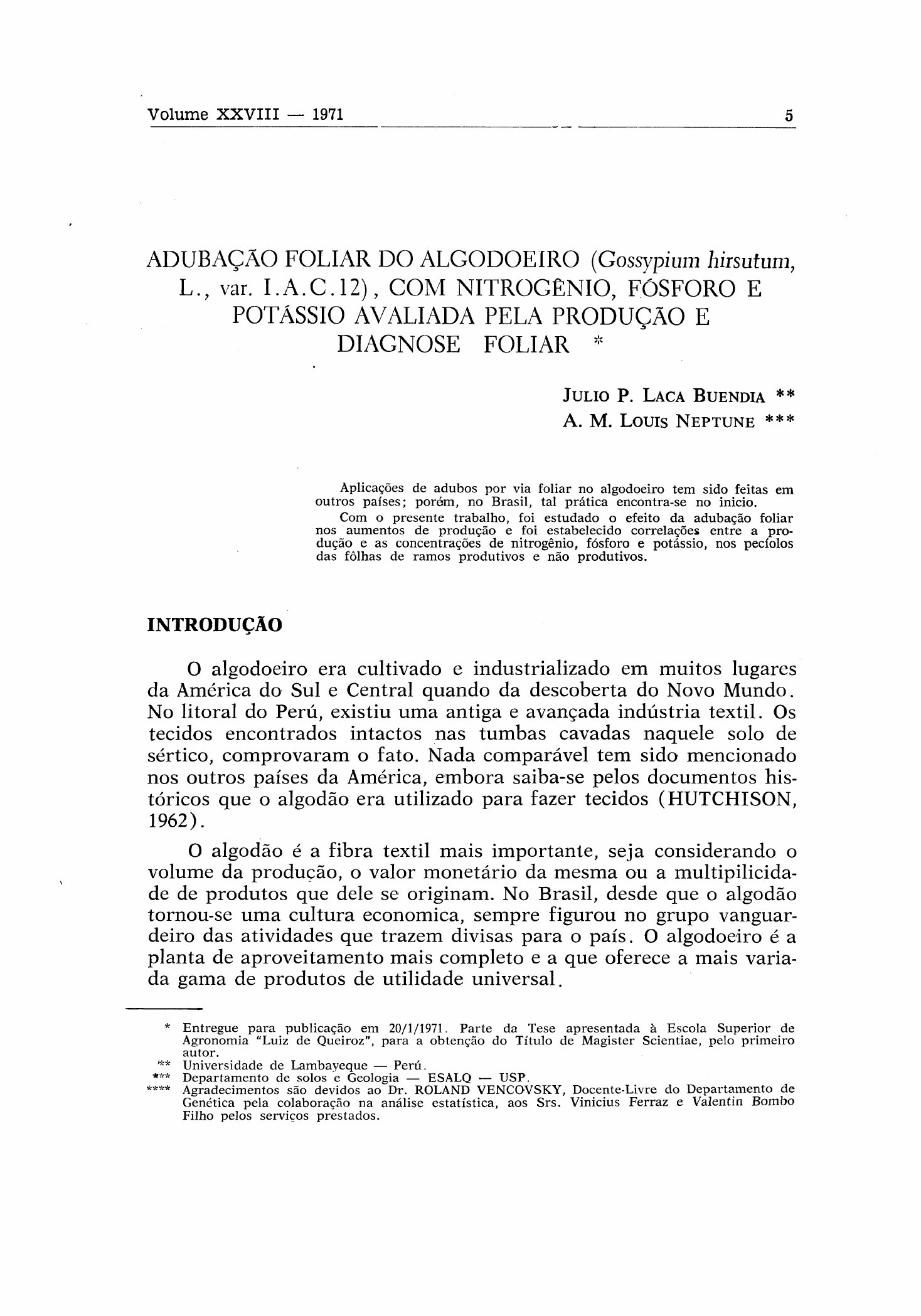 ADUBAÇÃO FOLIAR DO ALGODOEIRO (Gossypium hirsutum, L . , var. I . A . C . 1 2 ) , COM NITROGÊNIO, FÓSFORO Ε POTÁSSIO AVALIADA PELA PRODUÇÃO Ε DIAGNOSE FOLIAR * Julio P. Laca Buendia ** A. M. Louis Neptune *** Aplicações de adubos por via foliar no algodoeiro tem sido feitas em outros países; porém, no Brasil, tal prática encontra-se no inicio. Com o presente trabalho, foi estudado o efeito da adubação foliar nos aumentos de produção e foi estabelecido correlações entre a pro dução e as concentrações de nitrogênio, fósforo e potássio, nos pecíolos das folhas de ramos produtivos e não produtivos. I N T R O D U Ç Ã O O algodoeiro era cultivado e industrializado em muitos lugares da América do Sul e Central quando da descoberta do Novo Mundo. No litoral do Peru, existiu uma antiga e avançada indústria têxtil. Os tecidos encontrados intactos nas tumbas cavadas naquele solo de sértico, comprovaram o fato. Nada comparável tem sido mencionado nos outros países da América, embora saiba-se pelos documentos his tóricos que o algodão era utilizado para fazer tecidos (HUTCHISON, 1962). O algodão é a fibra têxtil mais importante, seja considerando o volume da produção, o valor monetário da mesma ou a multipilicida- de de produtos que dele se originam. No Brasil, desde que o algodão tornou-se uma cultura econômica, sempre figurou no grupo vanguar- deiro das atividades que trazem divisas para o país. O algodoeiro é a planta de aproveitamento mais completo e a que oferece a mais varia da gama de produtos de utilidade universal. * Entregue para publicação em 20/1/1971. Parte da Tese apresentada à Escola Superior de Agronomia "Luiz de Queiroz", para a obtenção do Título de Magister Scientiae, pelo primeiro autor. '** Universidade de Lambayeque — Perú. *** Departamento de solos e Geologia — ESALQ ·— USP. **** Agradecimentos são devidos ao Dr. ROLAND VENCOVSKY, Docente-Livre do Departamento de Genética pela colaboração na análise estatística, aos Srs. Vinícius Ferraz e Valentin Bombo Filho pelos serviços prestados. É produzido por quatro espécies de gênero Gossypium. Duas de las : G. herbaceum e G. arboreum, são originárias do Velho Mundo e as duas outras G. barbadense e G. hirsutum, do Novo Mundo. No Brasil desde que o algodoeiro começou a tomar aspecto de cultura econômica, sempre encontrou-se em situação relativamente privilegiada. Segundo o anuário estatístico do Brasil 1968, a extensão de área ocupada é a terceira no País em importância, superada pelo milho e arroz. A exportação desta malvácea ocupa o segundo lugar superada somente pelo café e neste ano espera-se novo recorde ( V A N N I 1969). A adubação é uma das práticas agrícolas mais importantes na cultura do algodoeiro. Aplicações de fertilizantes por via foliar no algodoeiro tem sido feitas em outros países, porém, no Brasil tal prá tica acha-se no início. Nos países de agricultura mais adiantada, já tem sido feitas pesquisas, pela possibilidade de economicamente, for necer elementos nutritivos pelas folhas. Dada a obrigatoriedade do uso na cultura algodoeira, de um esquema definido de controle de pragas, que inclui até o florescimento pelo menos três pulverizações, oferece-se, assim, oportunidade de conjugar as duas práticas, adubação e controle de pragas em uma só aplicação. O Instituto Agronômico de Campinas-Secção de Algodão, no Brasil, é um dos precursores no assunto, pois encontra-se iniciando experiências para saber as quanti dades máximas de adubos nitrogenados, assim como as fontes de maior tolerância para a planta (FUZATTO, 1965). Os trabalhos pioneiros de GRIS, 1844; BOHN, 1877; MAYER, 1874; HILTNER, 1909, citados por HALLIDAY, 1961, demonstraram que as plantas são capazes de absorver nutrientes pelas folhas. Nos últimos anos, intensificaram-se os estudos sobre pulverização foliar de nutrientes em quase todas as culturas, BOYNTON, 1954; HALLI DAY, 1961; WITTWER, 1964; FRANKE, 1967. DURAN, 1960, na Colombia, trabalhou com concentrações de uréia para aplicação foliar de 1%, 3%, 5% e 10%. Os melhores resultados foram obtidos quando a aplicação foi de 200 kg/Ha de nitrogênio ao solo e quando a mesma quantidade deste elemento foi subministrado por aspersão foliar de uréia a 3% . As aplicações de uréia de 5 a 10% produziram queimaduras nas folhas. G ALI ANO, 1961, no Peru, conclui que se pode aplicar nas Folhas 30 kg/Ha de uréia, desde que a concentração da pulverização não exceda 2,4%. Verificou-se que altas concentrações causam queima nas folhas e que as aplicações não podem ser feitas durante períodos intensos de insolação, ou em dias muitos secos. Em outro trabalho (ANÔNIMO, 1962), adubos nitrogenados foram aplicados nas folhas no período de frutificação. Os resultados indi- caram que a aplicação de soluções de uréia e nitrato de amonio cor respondente a uma concentração de 3 % de nitrogênio na dose 5,5 kg/Ha, provocaram danos sensíveis nas folhas do algodoeiro. Porém, a mesma solução de uréia correspondente a uma concentração de 3% de nitrogênio pareciam não prejudicar as folhas de modo que apre ciável quando aplicadas freqüentemente, porém reduziam os rendi mentos onde o solo tinha alto teor de nitrogênio utilizável. JONES et al. 1962, nos E . U . A . , aplicaram uréia em pulverização foliar no algodoeiro, no período da frutificação. Estes autores acham: a) que esta prática não é recomendável, embora admitam que uma deficiência moderada de nitrogênio possa ser corrigida por as- persão foliar; b ) que uma solução de uréia, mesmo com uma concentração de 3% de nitrogênio, diminui a produção quando existe uma quantidade adequada de nitrogênio disponível no solo; c ) que o biureto, em quantidade comumente encontrada na uréia, não era tóxico ao algodoeiro, quando era aplicada uma solução de uréia a 6,7% . BRAND e RICHEZ, 1963, fizeram 