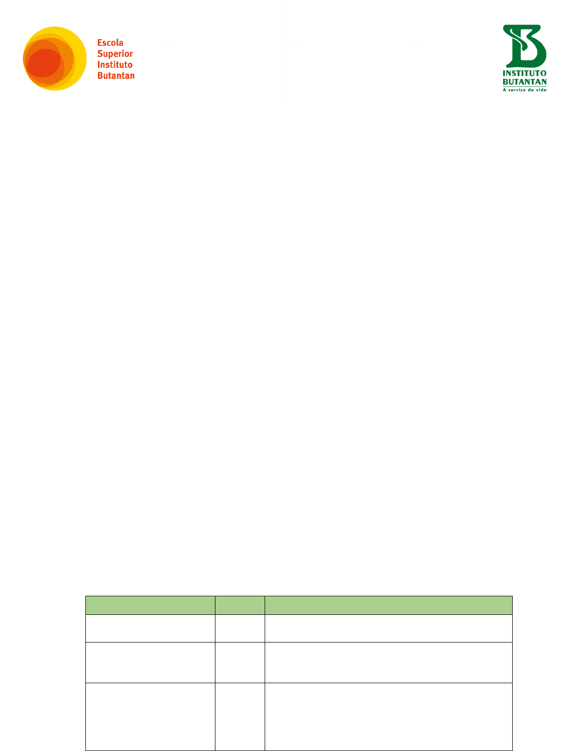 1 EDITAL- ESIB nº 28/2023 EDITAL DE ABERTURA DE INSCRIÇÃO PARA PREENCHIMENTO DE VAGAS DO PROGRAMA DE ESTÁGIO CURRICULAR OBRIGATÓRIO – PRIMEIRO SEMESTRE - 2024 A Escola Superior do Instituto Butantan – ESIB, integrante da estrutura organizacional do Instituto Butantan, torna pública a abertura do processo seletivo destinado ao preenchimento de 43 (quarenta e três) vagas para Estágio Curricular Obrigatório, com base na Lei Federal nº 11.788, de 25-09-2008. I. Do Objeto 1.1. O Estágio Curricular Obrigatório visa proporcionar ao estudante regularmente matriculado em instituição de ensino superior pública ou privada – e somente enquanto estiver cursando – o exercício de atividades correlatas à sua formação profissional, em complementação aos conhecimentos teóricos recebidos. 1.2. O Estágio Curricular Obrigatório será não remunerado e não implicará no estabelecimento de vínculo empregatício de qualquer natureza entre o Instituto Butantan e o estagiário. 1.3. O Estágio Curricular Obrigatório será realizado nas dependências do Instituto Butantan. II. Das Vagas 2.1. O processo seletivo destina-se ao preenchimento de 43 (quarenta e três) vagas de Estágio Curricular Obrigatório para os estudantes que estejam regularmente matriculados e frequentando cursos de ensino superior em instituição de ensino pública ou privada. 2.2. As vagas destinadas ao processo seletivo estão distribuídas conforme o quadro abaixo: ÁREA VAGAS GRADUAÇÕES Biblioteca 4 Pedagogia, Biblioteconomia, Química, Biologia Centro Ensaios Clínicos e Farmacovigilância 1 Farmácia e Bioquímica, Enfermagem, Biomedicina, Medicina Laboratório de Biologia Estrutural e Funcional 3 Ciências Biológicas, Farmácia e Bioquímica, Ciências Biomédicas, Medicina Veterinária, Zootecnia, Ciências Ambientais, Ciências da Natureza, Ciências Fundamentais para a Saúde. 2 Laboratório de Ciclo Celular 1 Biologia, Biomedicina, Farmácia, Bioquímica, Afins Laboratório de Coleções Zoológicas 6 Biologia/Zoologia Laboratório de Farmacologia 2 Biomédico, Farmacêutico, Ciências Moleculares, Biólogo, Médico Veterinário, Biotecnólogo Laboratório de Fisiopatologia 2 Ciências Biológicas, Biomedicina, Medicina Veterinária, Biotecnologia, Fisioterapia, Farmácia e Bioquímica, e áreas afins da saúde Laboratório de Genética 2 Ciências Biológicas, Bioquímica, Biomedicina, Farmácia, Farmácia- Bioquímica, Engenharia de Biotecnologia, Engenharia de Processos, Engenharia Química, Química, Medicina Veterinária Laboratório de Imunopatologia 5 Ciências Biológicas, Medicina Veterinária, Farmácia e Bioquímica, Biomedicina, Biotecnologia Laboratório de Parasitologia 4 Ciências Biológicas, Biologia, Ciências Farmacêuticas, Farmácia, Ciências Veterinárias, Medicina Veterinária Laboratório de Toxicologia Aplicada 5 Farmácia, Biotecnologia, Engenharia Química, Engenharia Bioquímica, Biomedicina, Ciência da Computação, Bioengenharia Laboratório de Desenvolvimento de Vacinas 1 Biologia, Biomedicina, Farmácia, Biotecnologia, Medicina Laboratório de Desenvolvimento e Inovação 1 Farmácia, Biologia, Biomedicina Laboratório de Bioquímica e Biofísica 2 Ciências Biológicas, Ciências Farmacêuticas Laboratório de Desenvolvimento de Processos 4 Engenharia Química, Engenharia de Bioprocessos, Bioprocessos, Química, Biotecnologia, Farmácia, Farmácia Bioquímica, Biologia, Técnico em Química, Nutrição, Veterinária, Biomedicina 2.3. Os planos de atividades de estágio estão representados no Anexo 1 deste edital. 3 III. Das Condições para participar do processo seletivo 3.1. Somente será considerado apto a participar do processo seletivo, o candidato que preencher cumulativamente as seguintes condições: 3.1.1. Estar regularmente matriculado e frequentando curso de ensino superior que contemple o Estágio Curricular Obrigatório em seu projeto pedagógico, conforme estabelece o parágrafo primeiro do Art. 1º da Lei Federal nº 11.788, de 25-09-2008 e que seja compatível à área de atuação relacionada àquela em que a vaga de estágio está sendo oferecida. 3.2. Portanto, deverá apresentar no ato da inscrição: 1) Cópia legível e atualizada do histórico escolar, constando as disciplinas cursadas e a frequência; 2) Declaração da Instituição de Ensino informando: a) o semestre/ano adequado para realização de Estágio Curricular Obrigatório; e, b) a quantidade de horas necessárias para a realização do Estágio Curricular Obrigatório. 3) Certificados de atividades, cursos e experiências, relacionadas no Anexo 2 deste Edital. 3.3. Estar apto a cursar o estágio obrigatório, de acordo com o projeto pedagógico do seu curso. IV. Da Inscrição 4.1. A inscrição será exclusivamente pelo site https://ensino.butantan.gov.br, no período de 11/09/2023 a 11/10/2023, com início às 00h00 de 11/09 até as 23h59 do dia 11/10 (horário de Brasília). Não serão aceitas outras formas de inscrição. 4.2. Documentos necessários para Inscrição: 4.2.1. Cópia legível e atualizada do histórico escolar; 4.2.2. Declaração da Instituição de Ensino informando: a) o semestre/ano adequado para realização de estágio curricular obrigatório; e, b) a quantidade de horas necessárias para a realização do estágio curricular obrigatório. 4.2.3. Certificados de atividades, cursos e experiências, relacionadas no Anexo 2 deste Edital. 4.3. Para efetuar a inscrição, o candidato deverá: 4.3.1. Ler atentamente o Edital, para conhecer e estar ciente das regras da seleção pública. A inscrição implicará a completa ciência e tácita aceitação das normas e condições estabelecidas neste Edital, sobre as quais o candidato não poderá alegar desconhecimento. 4.3.2. Acessar o site: https://escolasuperior.butantan.gov.br/estagios, clicar em: 4.3.3. Edital de Abertura de Inscrição. 4.3.4. Acessar o link de inscrição e informar a opção da ár
