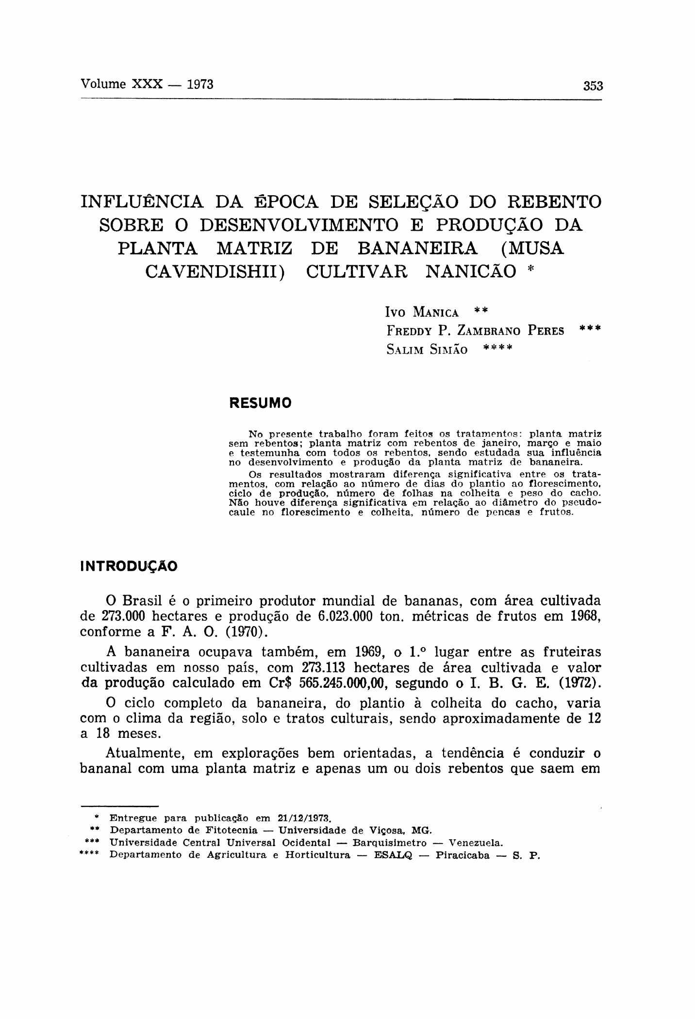 INFLUÊNCIA DA ÉPOCA DE SELEÇÃO DO REBENTO SOBRE O DESENVOLVIMENTO Ε PRODUÇÃO DA PLANTA MATRIZ DE BANANEIRA (MUSA CAVENDISHII) CULTIVAR NANICÃO* Ivo M A N I C A * * FREDDY P . ZAMBRANO P E R E S * * * SALIM S I M Ã O * * * * R E S U M O No presente trabalho foram feitos os t ra tamentos: planta matriz sem rebentos; planta matriz com rebentos de janeiro, março e maio e testemunha com todos os rebentos, sendo estudada sua influência no desenvolvimento e produção da planta matriz de bananeira. Os resultados mostraram diferença significativa entre os t rata mentos, com relação ao número de dias do plantio ao florescimento, ciclo de produção, número de folhas na colheita e peso do cacho. Não houve diferença significativa em relação ao diâmetro do pseudo- caule no florescimento e colheita, número de pencas e frutos. I N T R O D U Ç Ã O O Brasil é o primeiro produtor mundial de bananas , com área cultivada de 273.000 hectares e produção de 6.023.000 ton. métricas de frutos em 1968, conforme a F . A. O. (1970). A bananeira ocupava também, em 1969, o 1.° lugar entre as fruteiras cultivadas em nosso país, com 273.113 hectares de área cultivada e valor da produção calculado em Cr$ 565.245.000,00, segundo o I. B. G. E. (1972). O ciclo completo da bananeira , do plantio à colheita do cacho, var ia com o clima da região, solo e tratos culturais, sendo aproximadamente de 12 a 18 meses. Atualmente, em explorações bem orientadas, a tendência é conduzir o bananal com uma planta matriz e apenas um ou dois rebentos que saem em * Entregue para publicação em 21/12/1973. ** Departamento de Fitotecnia — Universidade de Viçosa, MG. *** Universidade Central Universal Ocidental — Barquisimetro — Venezuela. **** Departamento de Agricultura e Horticultura — ESALQ — Piracicaba — S. P. épocas diferentes, com a finalidade de manter na mesma cova 2 a 3 plantas em diferentes estádios de desenvolvimento. Como a seleção de rebentos depende da época de plantio, tipo de muda, clima, solo e t ratos culturais, uma planta pode produzir frutos prat icamen te durante todo o ano, existindo porém, em São Paulo, tendência a maior produção de cachos de janeiro a julho e menor de agosto a dezembro. A maior ou menor oferta de bananas reflete no preço do produto no mercado, sendo que uma época de menor produção corresponde a um maior preço e uma época de maior produção a um menor preço. O presente trabalho estuda a influência da época de seleção do rebento sobre o desenvolvimento e produção da planta matriz da bananei ra nanicão. REVISÃO D E L I T E R A T U R A A grande aplicação do desbaste , segundo KERVEGANT (1935) é regular a época da colheita do cacho, porém, é necessário bas tante conhecimento pa ra selecionar rebentos que frutifiquem em períodos favoráveis, pois os mesmos são muito influenciados pelo clima, solo e exposição. P a r a AUBERT (1971), a produção de bananas pode ser ajustada em função das condições climáticas e econômicas, a t ravés da seleção do material de plantio, desbaste dos rebentos e época de plantio. RODRIGUES Ε SOUZA (1947), t rabalhando com o cultivar Nanica, ve r i f icaram que dois fatores intervém na distribuição da colheita duran te os meses do ano: seleção dos rebentos e duração do período de atividade ve- getativa. CHAMPION (1963), com relação a clima, considera a atividade vegeta- tiva da bananeira muito fraca com tempera turas inferiores a 16°C Tempe ra tu ras em torno de 25°C e chuvas de 100 a 120 mm. mensais, são as que po dem proporcionar um excelente desenvolvimento à bananeira . WARDLAW (1961), observou que com a ocorrência de tempera turas de 25,5°C dois meses antes da colheita, aumentava muito o peso do cacho. Tem pera turas mais al tas aceleravam a maturação e tempera turas mais baixas prejudicavam o desenvolvimento do fruto. CORTEZ (1961), em ensaio realizado no Litoral de São Paulo, verificou, que a qualidade do fruto (número de pencas, frutos e peso) dependia do pe ríodo em que se dava a diferenciação floral e florescimento. SAMPAIO (1967), utilizando o cultivar Nanicão, obteve uma média de 12,1 folhas por planta; 7,3 pencas por cacho, e ciclo de 289,1 dias do plantio ao florescimento; BORGES (1971), na Venezuela, obteve plantas que alcan ça ram uma al tura média de 216 cm, t iveram ciclo de 215 dias do plantio ao florescimento e produziram uma média de 7 pencas por cacho. MATTOS(1969), em plantio com espaçamento de 2,0 χ 2,5 m obteve um diâmetro de pseudo-caule de 18,2 cm, al tura da planta de 208,1 cm; 12,2 folhas por planta, 7,5 pencas por cacho, peso do cacho de 16,5 kg e ciclo de produção de 488 dias. AHMED e MANN AN (1971) empregaram diferentes espaçamentos de plantio, em covas de 30, 45 e 60 cm cúbicos. O pseudo-caule alcançou menor diâmetro e uma produção de frutos de 24,6 e 104,2% a mais por unidade de área no espaçamento de 1,2 χ 1,2 m do que nos espaçamentos de 1,8 χ 1,8 m e 2,4 χ 2,4 m. As plantas com espaçamento de 1,2 χ 1,2 m produziram 63,8% a mais de frutos do que as espaçadas de 2,4 χ 2,4 m. O maior espaçamento apresentou cachos, mãos e dedos mais pesados. O florescimento e a matura ção dos frutos foi r e t a rdada no espaçamento menor. O espaçamento de 1,8 χ 1,8 m, com covas no tamanho de 60 cm cúbicos constituiu a combinação mais econômica. MATTOS (1969) utüizou espaçamentos dè 2>0 χ 1,5 m; 2,0 χ 2,0; 2,0 χ 2,5; 2,0 χ 3,0; 3,0 χ 2,5; 3,0 χ 3,0. Ο primeiro ciclo de produção não apresentou diferença significativa entre os plantios em relação ao diâmetro do pseudo- -caule, número de folhas ativas e pencas; porém em re lação ao peso do cacho e ciclo de produção, os espaçamentos de 3,0 χ 2,0 e 3,0 χ 3,0 m. mos t ra ram diferença significativa quando comparados com o espaçamento de 2,0 χ 1,5 m. MISSINGHAN (1963) em plantios com espaçamentos de 4 m .entre filas e 0,9 m; 1,2 m; 1,5