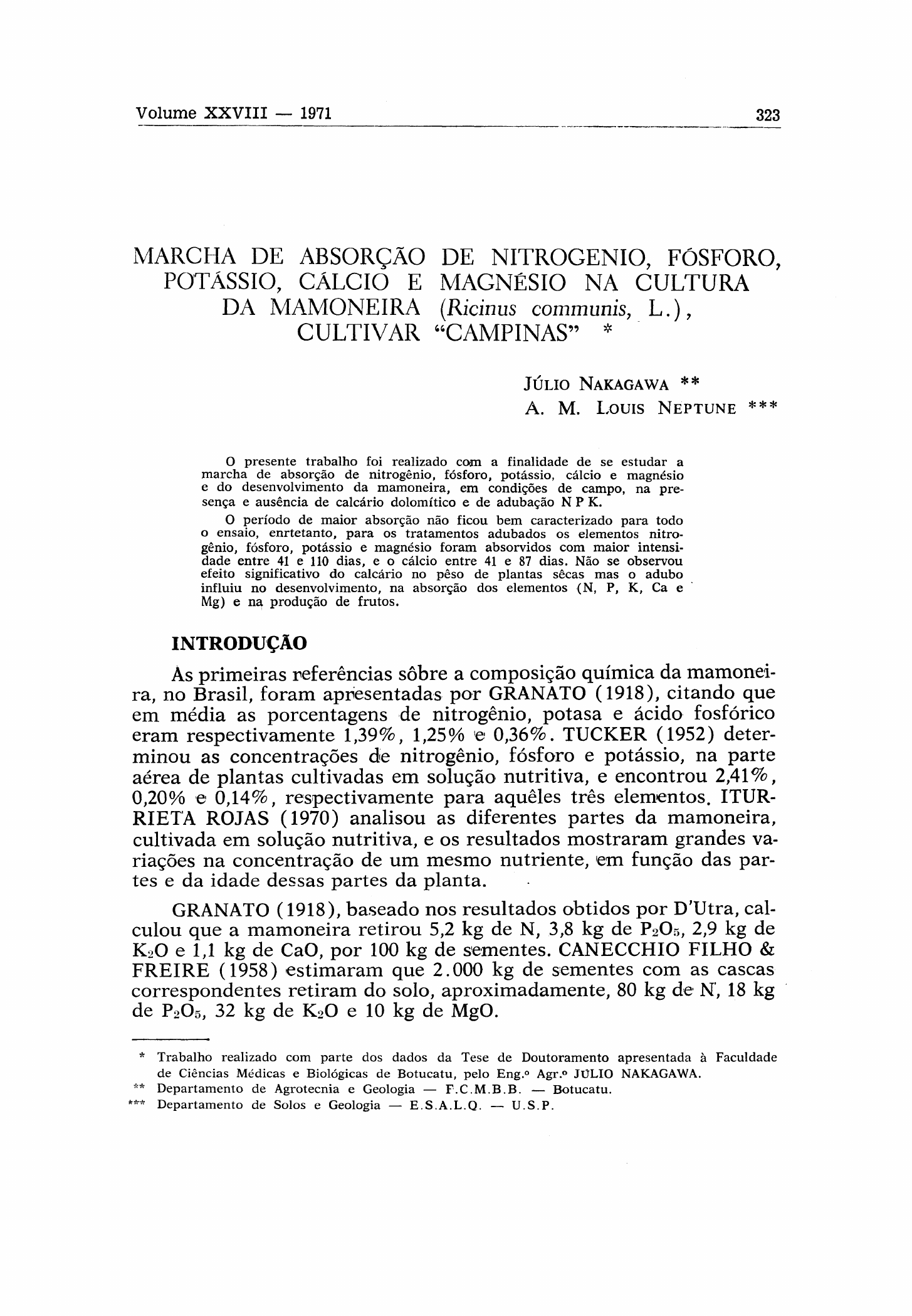 INTRODUÇÃO As primeiras referências sobre a composição química da mamonea ra, no Brasil, foram apresentadas por GRANATO (1918), citando que em média as porcentagens de nitrogênio, potasa e ácido fosfórico eram respectivamente 1,39%, 1,25% <e 0,36%. TUCKER (1952) deter minou as concentrações de nitrogênio, fósforo e potássio, na parte aérea de plantas cultivadas em solução nutritiva, e encontrou 2,41%, 0,20% e 0,14%, respectivamente para aqueles três elementos. ITUR- RIETA ROJAS (1970) analisou as diferentes partes da mamoneira, cultivada em solução nutritiva, e os resultados mostraram grandes va riações na concentração de um mesmo nutriente, em função das par tes e da idade dessas partes da planta. GRANATO (1918), baseado nos resultados obtidos por D'Utra, cal culou que a mamoneira retirou 5,2 kg de N, 3,8 kg de P 2 Os, 2,9 kg de K 2 0 e 1,1 kg de CaO, por 100 kg de sementes. CANECCHIO FILHO & FREIRE (1958) estimaram que 2.000 kg de sementes com as cascas correspondentes retiram do solo, aproximadamente, 80 kg de N, 18 kg de P 2 0 5 , 32 kg de K 2 0 e 10 kg de MgO. * Trabalho realizado com parte dos dados da Tese de Doutoramento apresentada à Faculdade de Ciências Médicas e Biológicas de Botucatu, pelo Eng.° Agr.° JÜLIO NAKAGAWA. ** Departamento de Agrotecnia e Geologia — F . C . M . B . B . — Botucatu. *** Departamento de Solos e Geologia — E . S . A . L . Q . — U.S .P . O presente trabalho foi realizado com a finalidade de se estudar a marcha de absorção de nitrogênio, fósforo, potássio, cálcio e magnésio e do desenvolvimento da mamoneira, em condições de campo, na pre sença e ausencia de calcário dolomítico e de adubação N P K . O período de maior absorção não ficou bem caracterizado para todo o ensaio, enrtetanto, para os tratamentos adubados os elementos nitro gênio, fósforo, potássio e magnésio foram absorvidos com maior intensi dade entre 41 e 110 dias, e o cálcio entre 41 e 87 dias. Não se observou efeito significativo do calcário no pêso de plantas sêcas mas o adubo influiu no desenvolvimento, na absorção dos elementos ( N , P, K , Ca e Mg) e na produção de frutos. Júlio Nakagawa ** A. M. Louis Neptune *** M A R C H A DE A B S O R Ç Ã O D E N I T R O G Ê N I O , F Ó S F O R O , P O T Á S S I O , C Á L C I O E M A G N É S I O N A C U L T U R A D A M A M O N E I R A (Ricinus communis, L . ) , C U L T I V A R " C A M P I N A S " * Como se observa pela literatura, que ainda não se conhece como se desenvolve a absorção dos elementos minerais pela mamoneira. Diante dessa problemática, realizou-se o presente trabalho em que se procurou estudar a marcha de absorção de nitrogênio, fósforo, po tássio, cálcio e magnesio, e o desenvolvimento da cultura, em condi ções de campo, na presença e ausência de calcário dolomítico e da adubação NPK. MATERIAIS E MÉTODOS Utilizou-se um delineamento experimental de blocos ao acaso, com seis repetições, envolvendo quatro tratamentos: T — sem calcário e sem adubo; C — com calcário dolomítico na base de 800 kg/ha; A — sem calcário e com 80, 100 e 40 kg/ha de N, P2O5 e K 2 0 , respecti vamente; ( A + C) — incluindo as doses de calcário e de adubo, utili zadas nos tratamentos A e C. Segundo a COMISSÃO DE SOLOS (1960), o solo, onde se loca lizou o ensaio, pertence ao grande grupo Latosol Vermelho Amarelo, fase-arenosa. Na amostra composta, retirada desse solo, fêz-se as se guintes determinações: a ) o valor pH, utilizando-se relação 1:2,5 para solo: água; b ) matéria orgânica, pelo método descrito em MA LA VOLT A & COURY (1954); c ) hidrogênio e potássio trocáveis e o fósforo solúvel, conforme os métodos descritos em CATANI et al. (1955); d ) cálcio e magnesio trocáveis, utilizando-se o método de EDTA, de GLÓRIA et al. (1965). Os resultados seguem em QUADRO I, onde se observa tratar-se de um solo levemente ácido e pobre na maio ria dos nutrientes analisados, pela interpretação dada em CATANI et al. (1955). Como corretivo utilizou-se um calcário dolomítico procedente de Pereiras, Estado de São Paulo, e os fertilizantes que serviram de fon tes de N, P e K foram sulfato de amonio, superfosfato triplo «e cloreto de potássio, respectivamente. A calagem foi efetuada a 01/10/1969 e a adubação, por ocasião do plantio. Apenas o nitrogênio foi dividido em duas aplicações, tendo-se colocado um terço no plantio e os dois ter ços restantes, aplicados em cobertura, 50 dias após o plantio. O espaçamento adotado foi 1,50 m nas entre linhas e 0,50 m en tre covas, baseado nas> trabalhos de ROCHA et al. (1964). Em função deste espaçamento determinou-se uma área da parcela, que compor tasse 4 linhas de 8 plantas. Portanto a área da prcela foi de 24,00 m 2 (6,0 x 4,0 m ) . Efetuou-se a semeadura aos 24/10/1969, colocando-se três semen tes por cova, de acordo com ROCHA et al. (1964), e utilizando-se o cultivar "Campinas", de frutos indeiscentes e porte médio, conforme descrição de BANZATO & ROCHA (1965). O excesso de plantas germinadas foi sendo eliminado e aos vin te dias após o plantio, todas as parcelas contavam com apenas uma planta por cova. Durante a condução do ensaio, três capinas foram suficientes para manter as parcelas livres de ervas daninhas e nenhu ma outra operação foi necessário. Com intervalos regulares de 23 dias entre amostragens, foram co letadas uma planta por parcela, num total de cinco amostragens. A primeira foi efetuada aos 41 dias e a última aos 133 dias após o plan tio. As plantas foram cortadas rente ao solo, lavadas, e em seguida co locadas em estufa ajustada para temperatura entre 65 e 70°C. Após se cáis foram pesadas e moldas em moinho tipo "Wiley". O material mol do foi submetido a análises químicas. Na determinação do nitrogênio utilizou-se o método do micro Kjeldahl, descrito em MALAVOLTA (1965). Para determinação de fós foro, potássio, cálcio e magnesio, fêz-se a