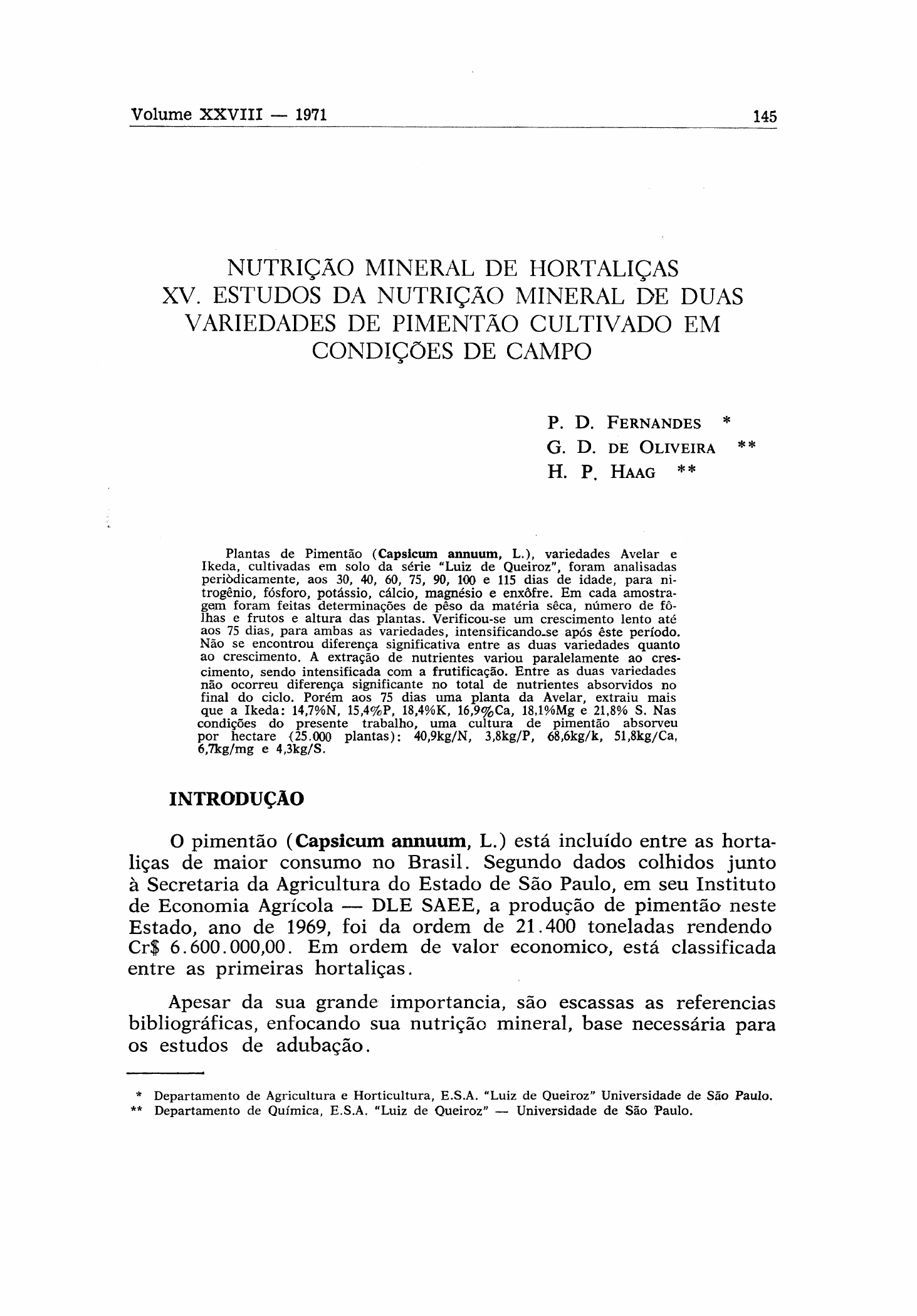 NUTRIÇÃO MINERAL DE HORTALIÇAS XV. ESTUDOS DA NUTRIÇÃO MINERAL DE DUAS VARIEDADES DE PIMENTÃO CULTIVADO EM CONDIÇÕES DE CAMPO P. D. Fernandes * G. D. de Oliveira ** H. P. Haag ** Plantas de Pimentão (Capsicum annuum, L . ) , variedades Avelar e Ikeda, cultivadas em solo da série "Luiz de Queiroz", foram analisadas periodicamente, aos 30, 40, 60, 75, 90, 100 e 115 dias de idade, para ni trogênio, fósforo, potássio, cálcio, magnésio e enxofre. Em cada amostra gem foram feitas determinações de peso da matéria seca, número de fô lhas e frutos e altura das plantas. Verificou-se um crescimento lento até aos 75 dias, para ambas as variedades, intensificando-se após êste período. Não se encontrou diferença significativa entre as duas variedades quanto ao crescimento. A extração de nutrientes variou paralelamente ao cres cimento, sendo intensificada com a frutificação. Entre as duas variedades não ocorreu diferença significante no total de nutrientes absorvidos no final do ciclo. Porém aos 75 dias uma planta da Avelar, extraiu mais que a Ikeda: 14,7%N, 15,4%P, 18,4%K, 16,9%Ca, 18,l%Mg e 21,8% S. Nas condições do presente trabalho, uma cultura de pimentão absorveu por hectare (25.000 plantas): 40,9kg/N, 3,8kg/P, 68,6kg/k, 51,8kg/Ca, 6,7kg/mg e 4,3kg/S. INTRODUÇÃO O pimentão (Capsicum annuum, L.) está incluído entre as horta liças de maior consumo no Brasil. Segundo dados colhidos junto à Secretaria da Agricultura do Estado de São Paulo, em seu Instituto de Economia Agrícola — DLE SAEE, a produção de pimentão neste Estado, ano de 1969, foi da ordem de 21.400 toneladas rendendo Cr$ 6.600.000,00. Em ordem de valor economico, está classificada entre as primeiras hortaliças. Apesar da sua grande importância, são escassas as referencias bibliográficas, enfocando sua nutrição mineral, base necessária para os estudos de adubação. * Departamento de Agricultura e Horticultura, E.S.A. "Luiz de Queiroz" Universidade de São Paulo. ** Departamento de Química, E.S.A. "Luiz de Queiroz" — Universidade de São Paulo. Trabalhando com a "Var. Casca Dura", HAAG, et al (1970) re latam serem absorvidos, por uma cultura em kg/ha, (31.250 plantas) : 24,4 N, 6,1 P, 49,0 K, 5,1 Ca, 2,8 Mg, 4,4 S. Em pesquisa conduzida, versando sobre estudos de deficiências minerais, nas variedades Avelar e Ikeda, P. D. FERNANDES (1971), verificou uma sensibilidade maior a deficiência dos macronutrientes em geral, na variedade Avelar. A partir dessas observações, o presente trabalho, visa apresen tar resultados de crescimento e de extração de nutrientes, por essas duas variedades, cultivadas em condições de campo. * Revisão da Literatura MATERIAL E MÉTODOS Sementes de pimentão, das var. Avelar e Ikeda, foram semeadas a 14/08/1970, em sementeiras convenientemente preparadas. Germi nadas a 25 desse mesmo mes, com trinta dias de idade foram trans plantadas em solo da série "Luiz de Queiroz" (RANZANI et al. 1966), cujas características químicas, determinadas segundo CATANI et al. (1955), foram: pH - 6,5 mat. orgânica % = 2,2 teor trocável K + e. mg por 100 g de solo = 0,85 Ca++ " " " " " " " = 3,80 Mg++ " " " " " " " = 1,05 P0 4- 3 " " " " " " " = 0,40 Usando-se um espaçamento de 1,00 x 0,40 m, cada planta rece beu uma adubação, segundo recomendações de BERNARDI (1962), de: 2 kg de estéreo de curral, 150 g superfosfato (25% P 2 O 5 ) , 30 g KC1, 45 g de salitre do Chile. O nitrogênio foi fracionado e aplicado aos 10, 20 e 30 dias após transplante, em cobertura. As plantas receberam os tratos culturais necessários. Foram feitas amostragens de plantas, a partir do transplante, em intervalos variando de 10 a 20 dias. O número de plantas colhidas foi sempre igual ou superior a quatro. Depois de colhidas, eram lavadas, separadas em raiz, caule, fo lhas e flores/frutos, e postas a secar em estufa a 80°C. Esse material, uma vez seco, foi pesado e moido em micromoinho Willey. A análise para nitrogênio, se processou pela técnica de Micro-Kjel- dahl, descrita em MALAVOLTA (1957); o fósforo seguiu as recomen dações de LOTT et al. (1956); os elementos potássio, cálcio e'magné- sio foram determinados por espectrofotometria de absorção atômica PERKIN ELMER (1966); o enxofre foi dosado segundo TOTH et al. (1948). RESULTADOS E DISCUSSÃO O florescimento, tanto para a var. Avelar, como para a Ikeda, se deu em um mesmo período, aos 65 dias de idade. O peso da matéria seca da planta, o número de folhas e frutos e a sua altura, para ambas as variedades, acham-se dispostas na Ta bela I. Pelos dados de matéria seca da planta inteira, é patente o cres cimento lento até 75 dias. Entre 75-90 dias de idade há um aumento brusco, com uma média superior a lg/dia. Esse crescimento é cres cente, atingindo no período de 100-115, quase 2 g/dia. Observaram-se algumas diferenças no entanto insignificantes en tre as duas variedades a partir da segunda amostragem (40 dias). Es tas discrepâncias mostram tendência a se anularem no final do ciclo. Em média nos primeiros 75 dias, o crescimento da matéria seca é apenas 8,5% do total, intensificando-se rapidamente com a frutifi cação. Absorção de Nutrientes As tabelas II e I I I apresentam as quantidades totais dos nutrien tes em mg, extraídos por uma planta (raiz, caule, folhas, flores e fru tos) das variedades Avelar e Ikeda, respectivamente. É notório a pequena extração de nutrientes, até os 75 dias. A partir desse período, coincidindo com a crescente frutificação, ocor re um aumento espetacular na absorção, sempre crescente. Estas observações concordam com as obtidas por HAAG et al (1970), na var. Casca Dura. Aspecto muito interessante é a extração de cálcio. Há uma in tensificação crescente e constante, chegando mesmo a ultrapassar a absorção de nitrogênio, após os 100 dias de idade. Devendo-se lem brar ser o solo de pH = 6,5, normal para a cultura do pimentão, não tendo sido necessár